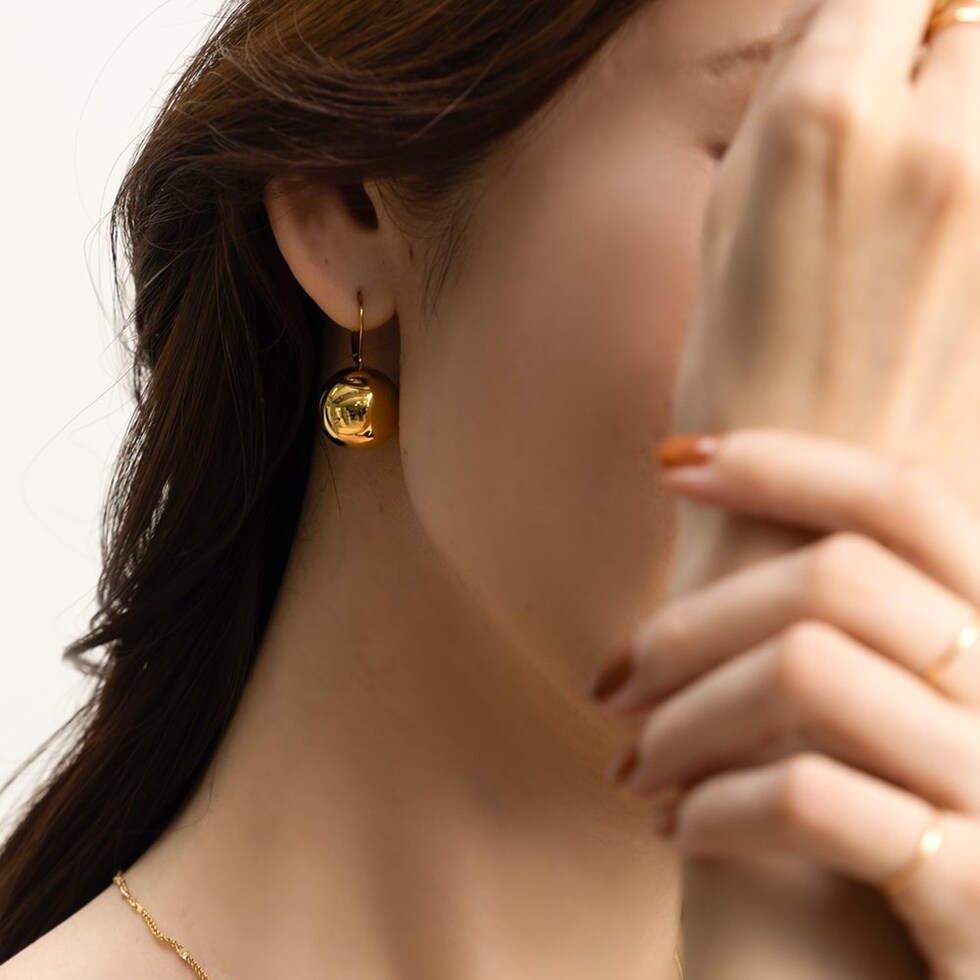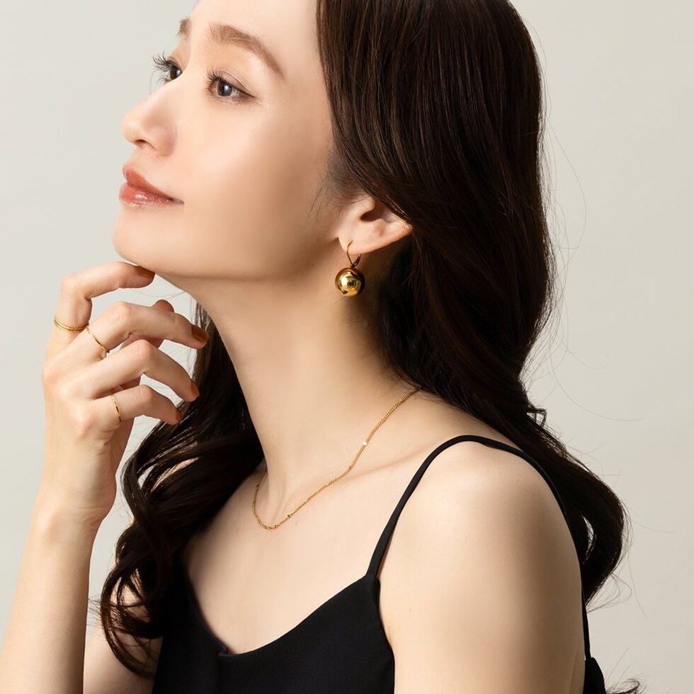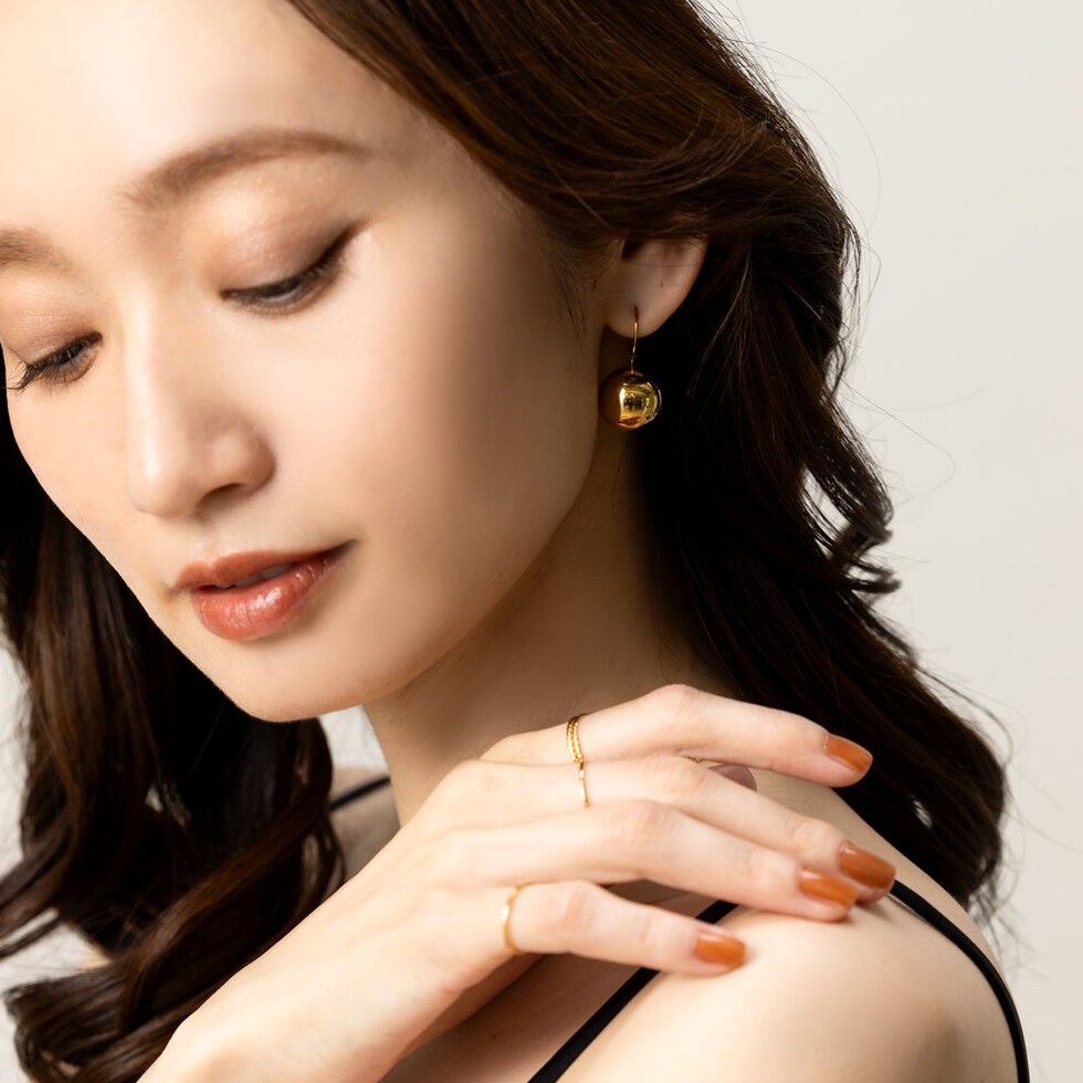 大粒のメタルスフィアが艶めくフレンチフックピアス。シンプルなデザインと存在感を放つサイジングでモードな雰囲気を演出します。コーデにアクセントをプラスしてグッと格上げしてくれるオススメのひと品。