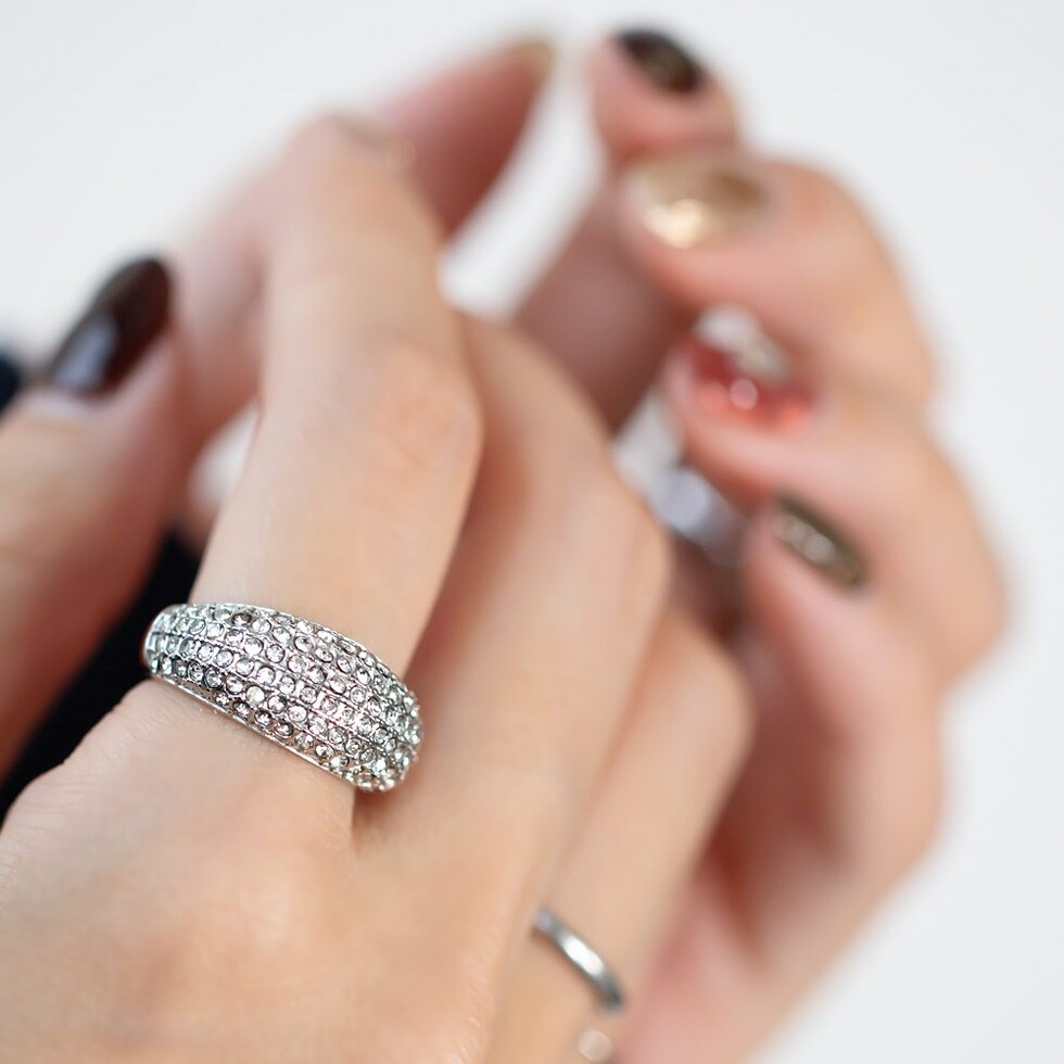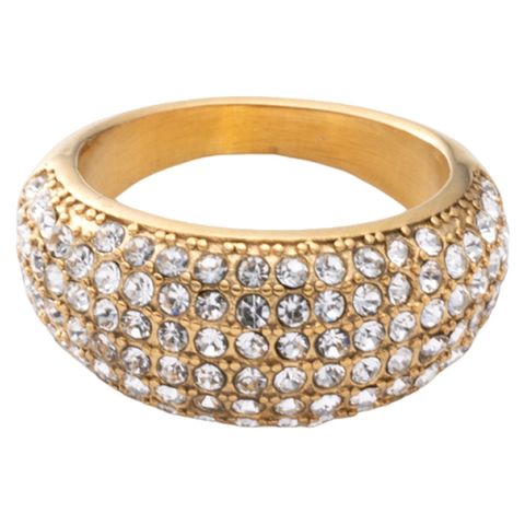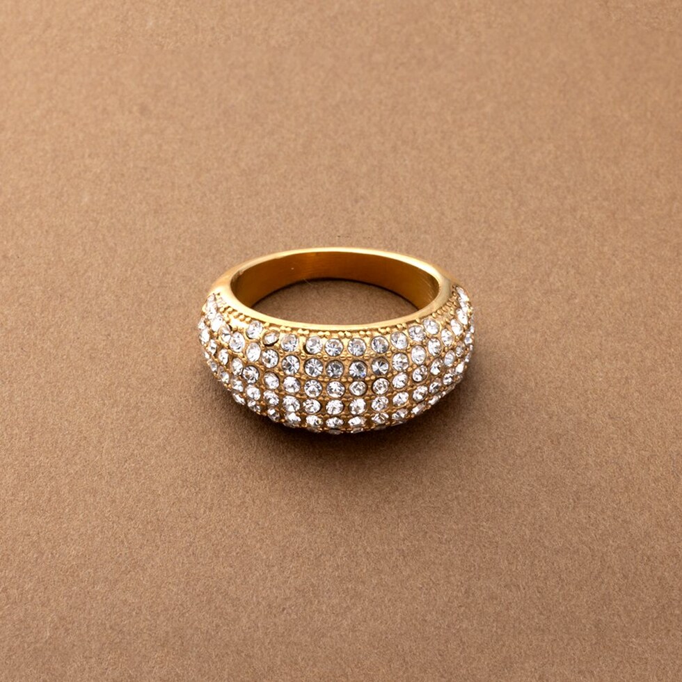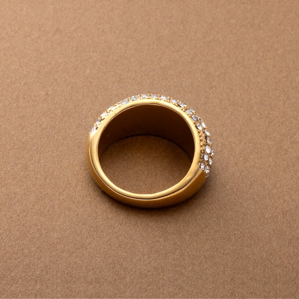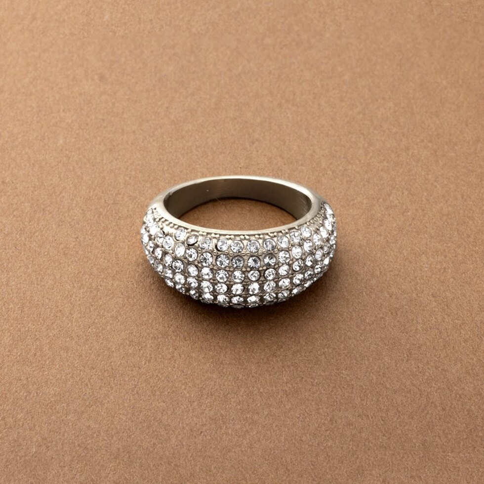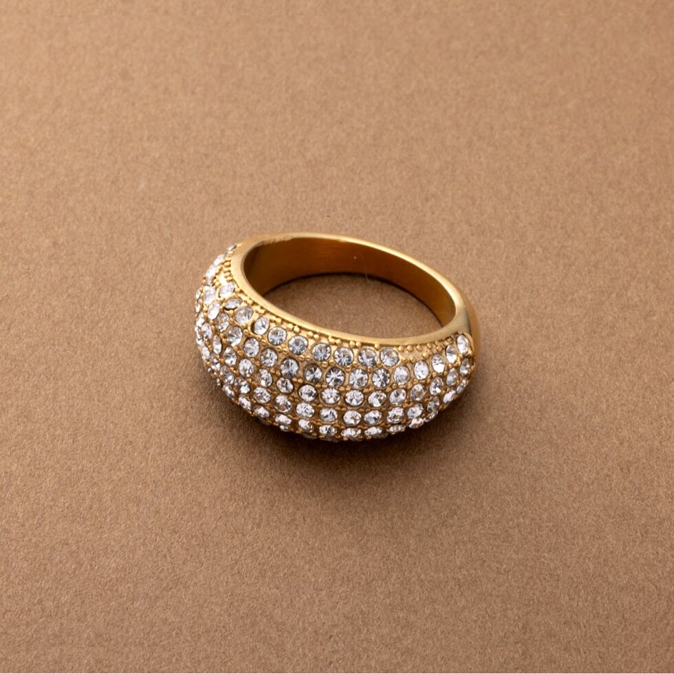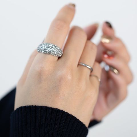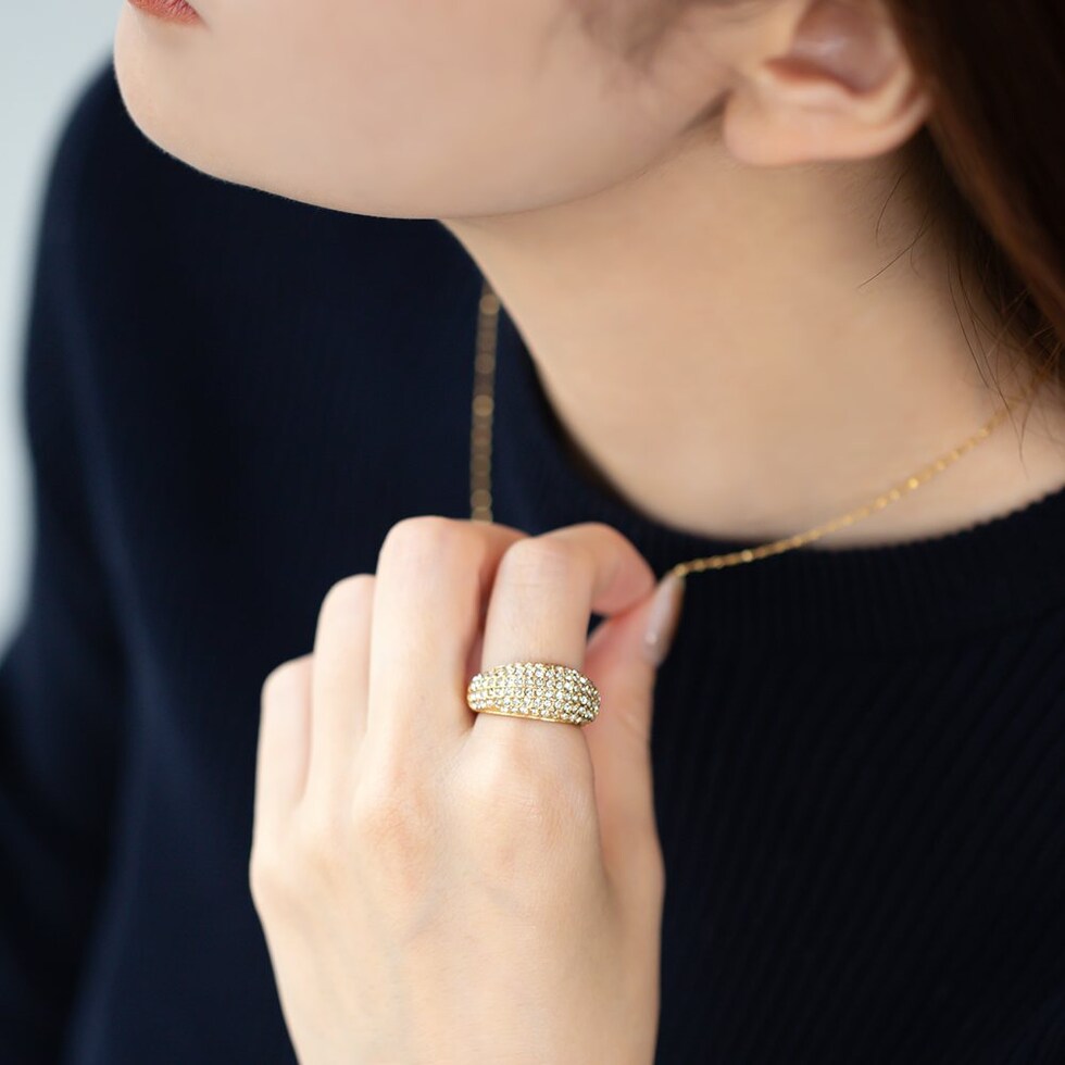 ぷっくりパヴェのステンレス製ワイドリング。極小ジルコニアを惜しみなく敷き詰めたキラキラパヴェが贅沢な主役級アイテム。これひとつで手元がパッと華やぐから、色々なオケージョンシーンに連れて行きたい◎錆びにくいステンレス製でデイリーに活躍しそう。