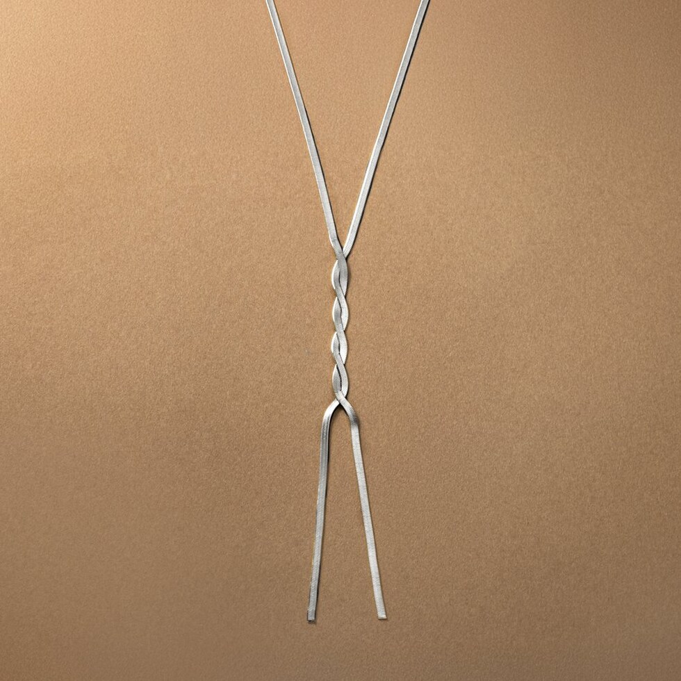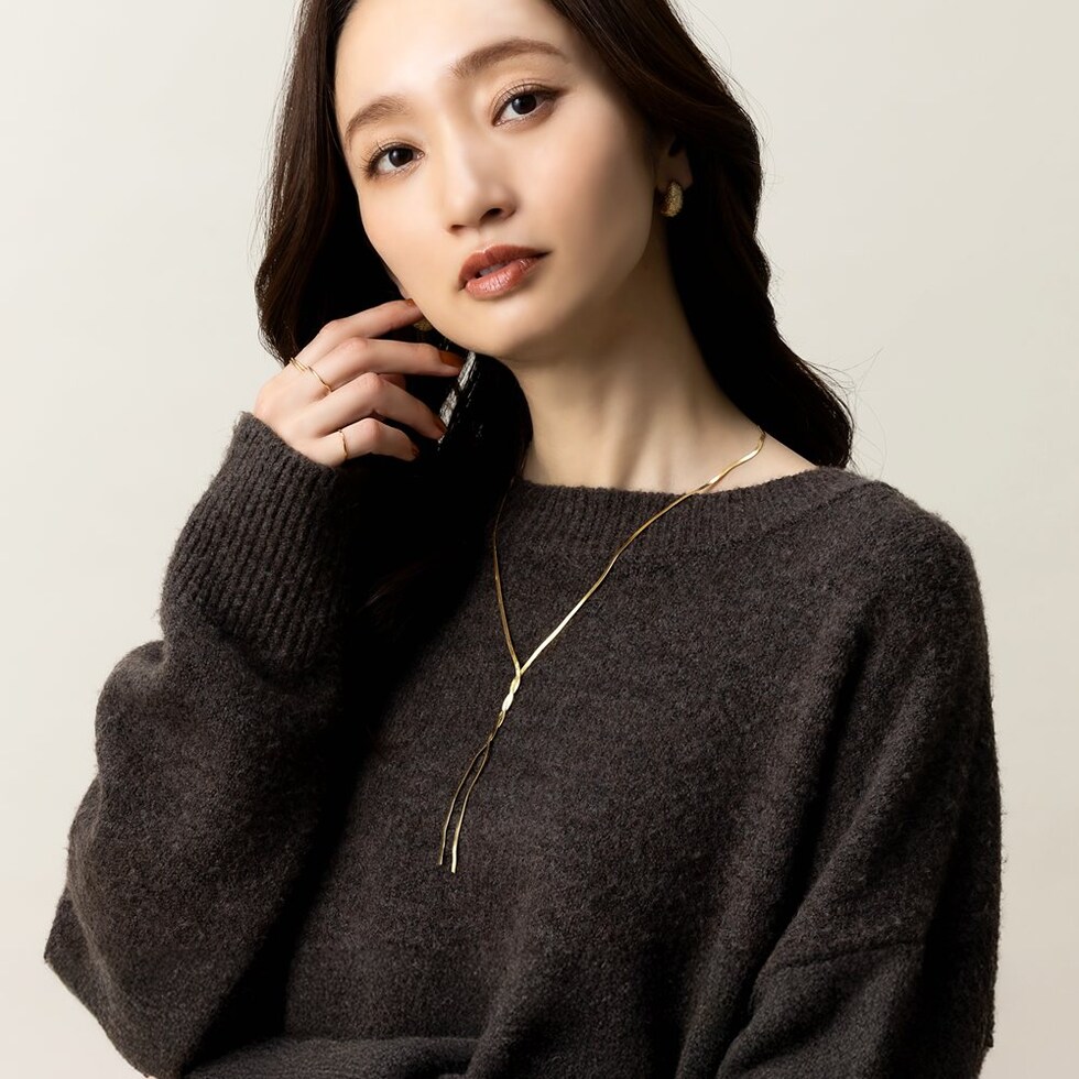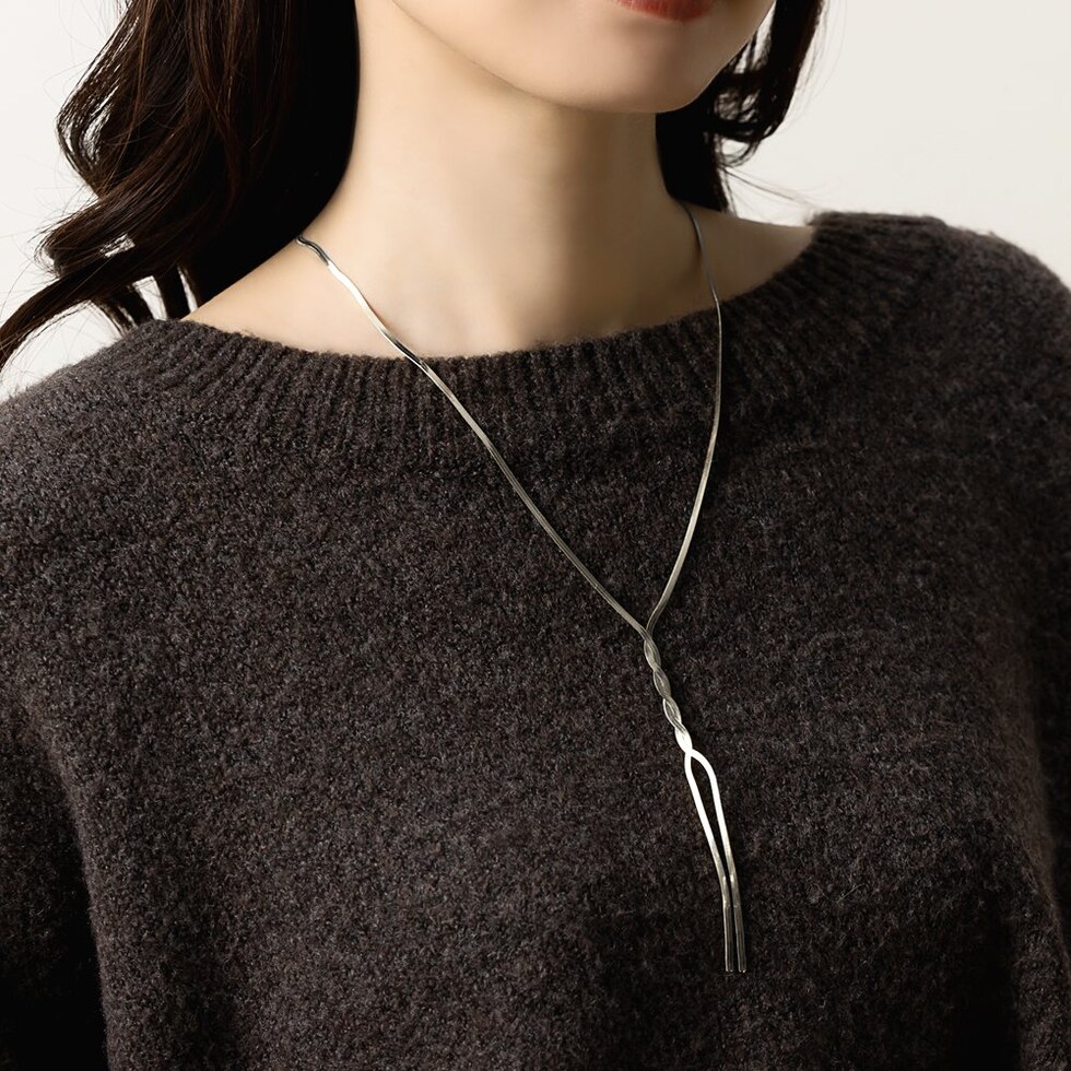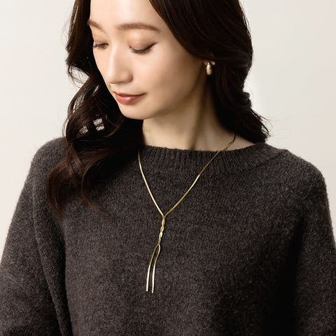 平スネークチェーンのY字ロングネックレス。ツイストを加えたデザインが、スマートで大人な印象を演出します。無駄のない洗練されたラインで、スッキリとした品の良い艶めきをプラスしてくれるひと品。