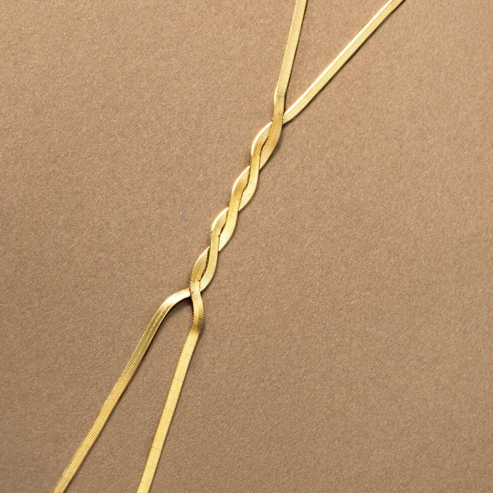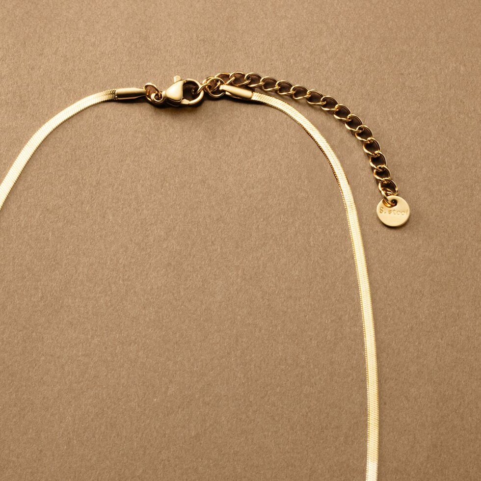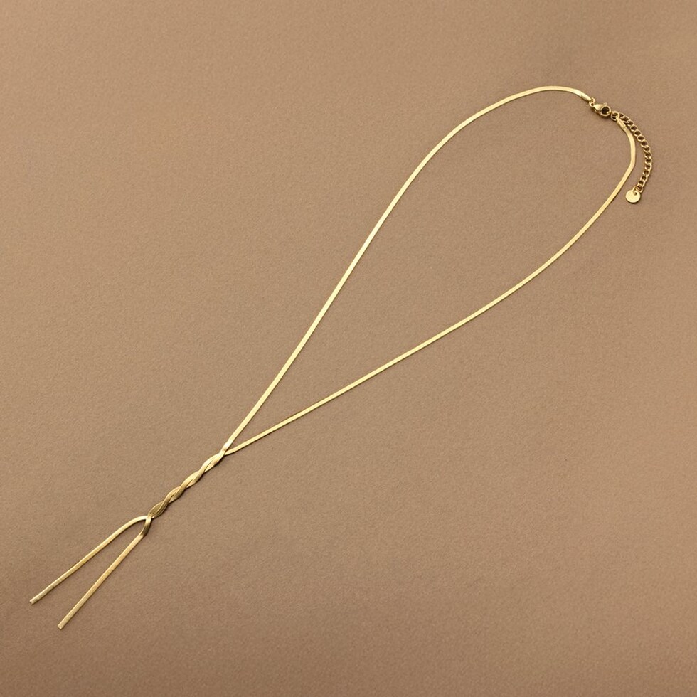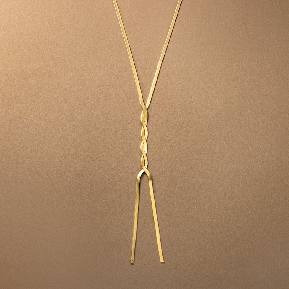 平スネークチェーンのY字ロングネックレス。ツイストを加えたデザインが、スマートで大人な印象を演出します。無駄のない洗練されたラインで、スッキリとした品の良い艶めきをプラスしてくれるひと品。