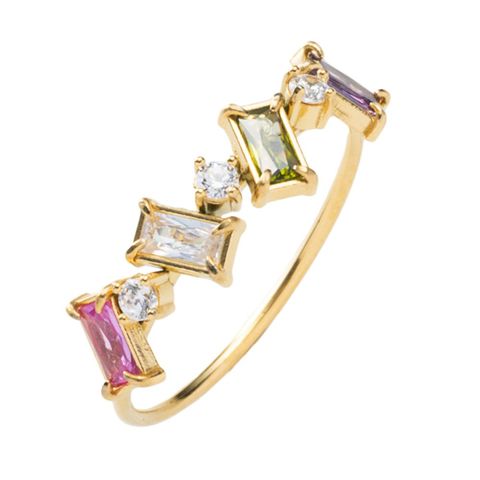 品よく煌めくカラーストーンのバケットカットリング。華やに彩るカラービジューと細身なデザインが、シャープでモダンな印象に仕上げてくれます。きれいめにもカジュアルにも、コーデに迷うことなくおしゃれを楽しめそう。