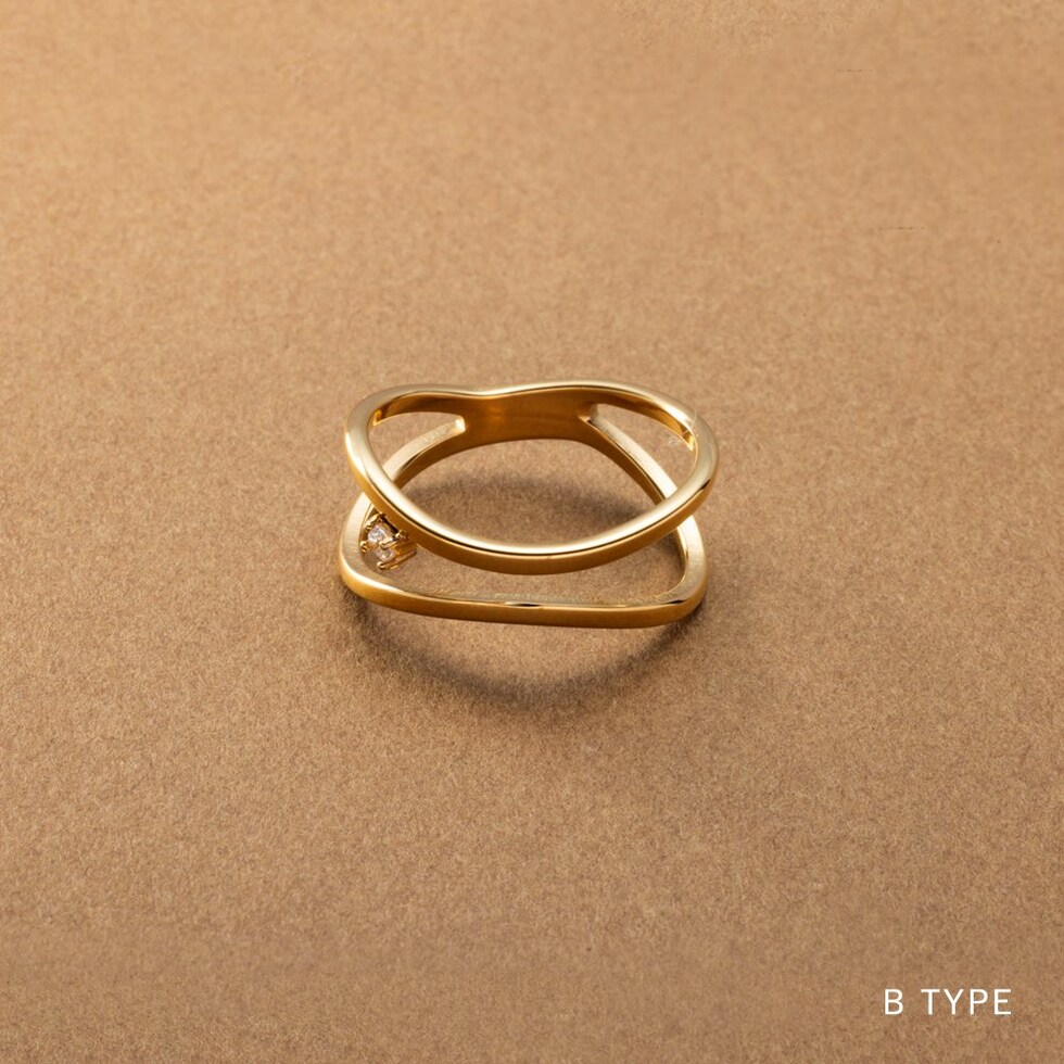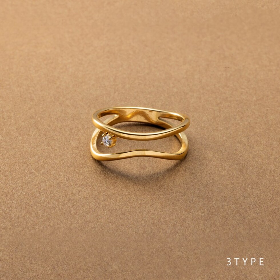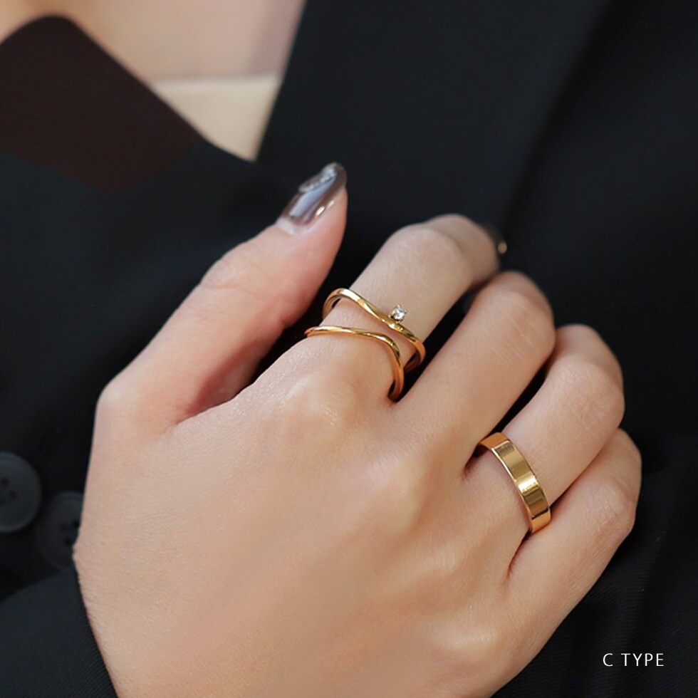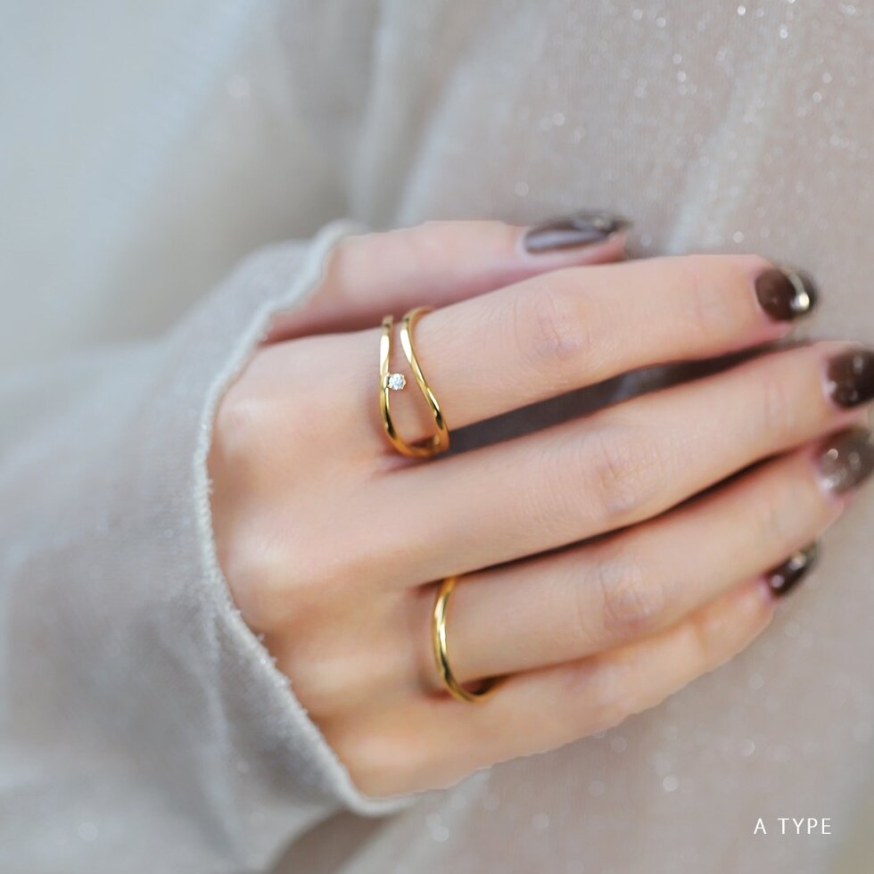 ひと粒のビジューを添えたダブルウェーブラインの3TYPEステンレス製リング。緩やかにカーブする2つのメタルラインを合わせた“オトナの定番”レイヤード風デザイン。3タイプからお好みのウェーブラインを選んで◎