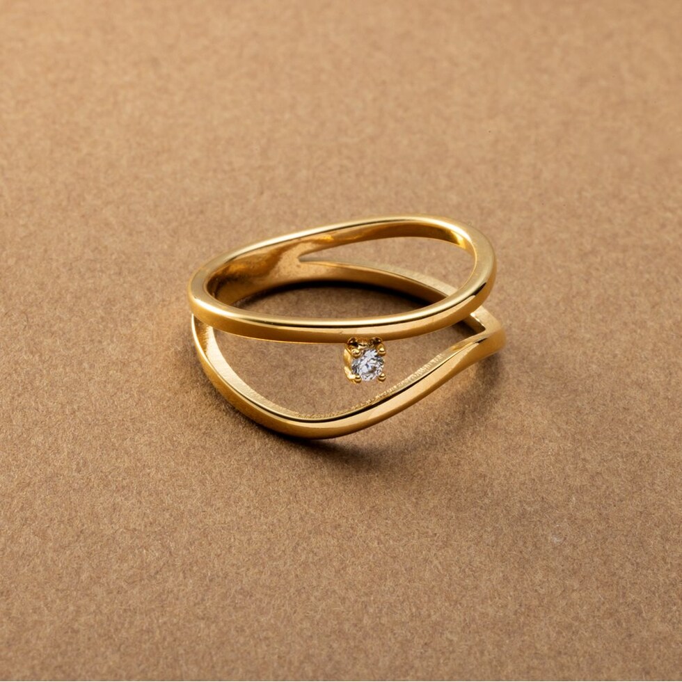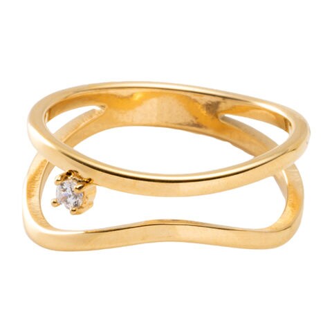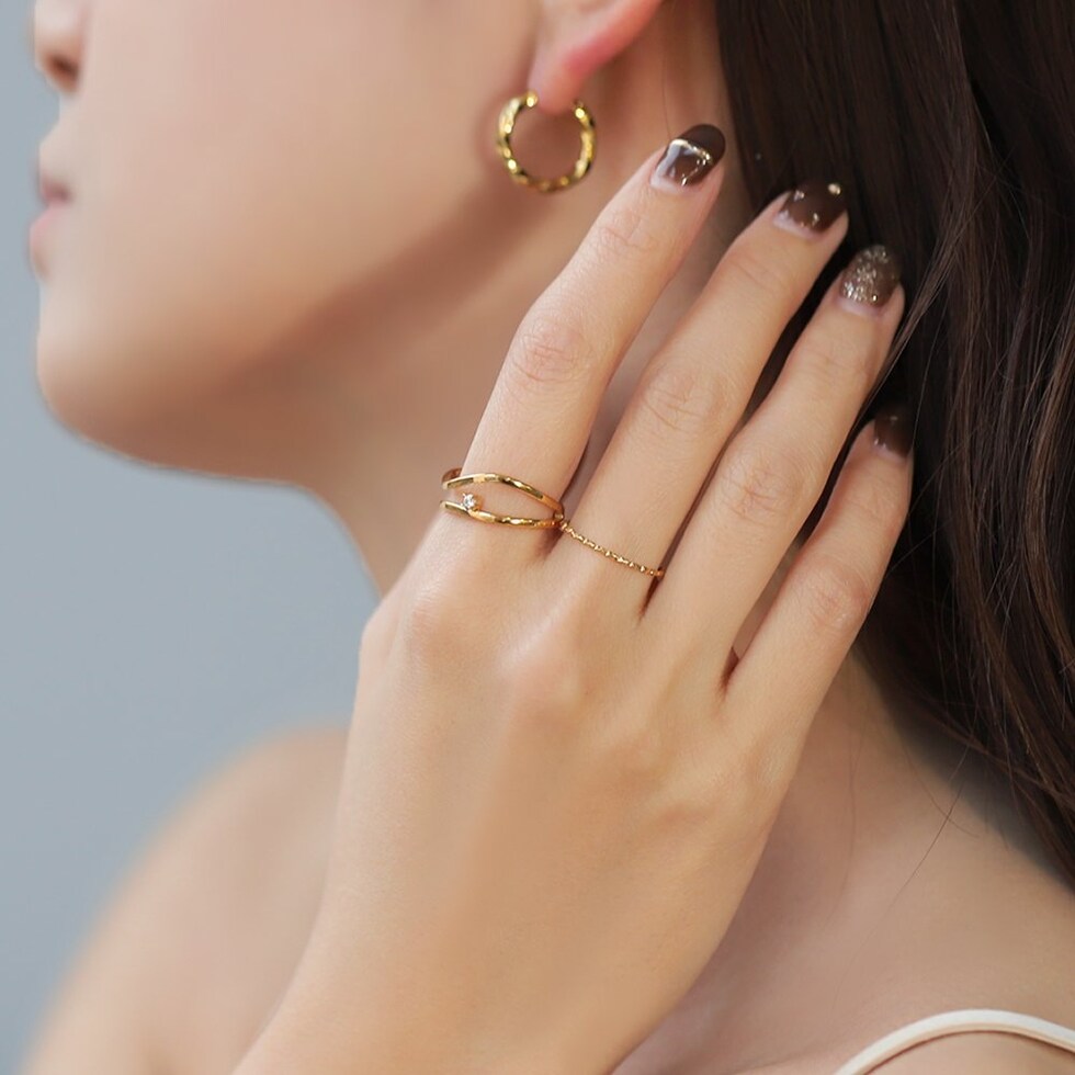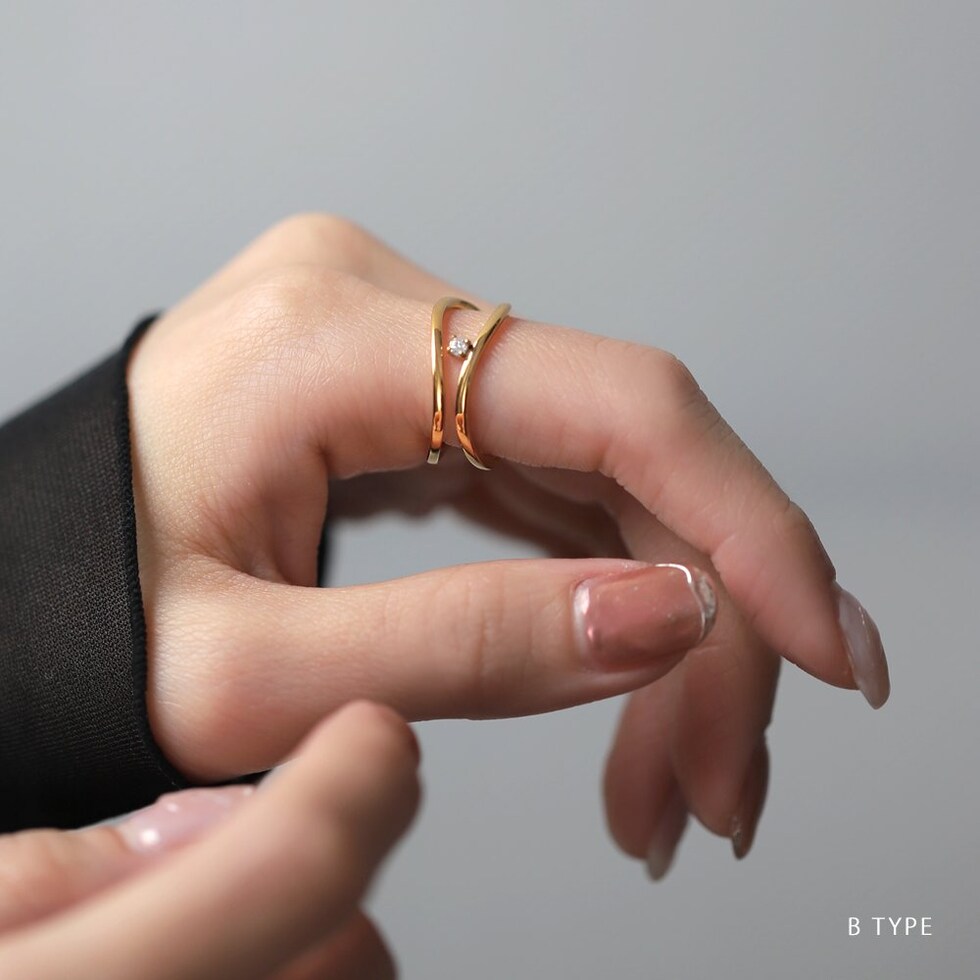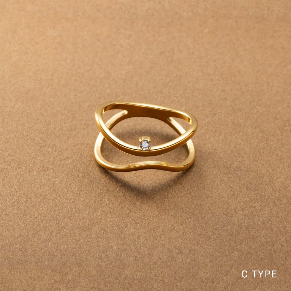 ひと粒のビジューを添えたダブルウェーブラインの3TYPEステンレス製リング。緩やかにカーブする2つのメタルラインを合わせた“オトナの定番”レイヤード風デザイン。3タイプからお好みのウェーブラインを選んで◎