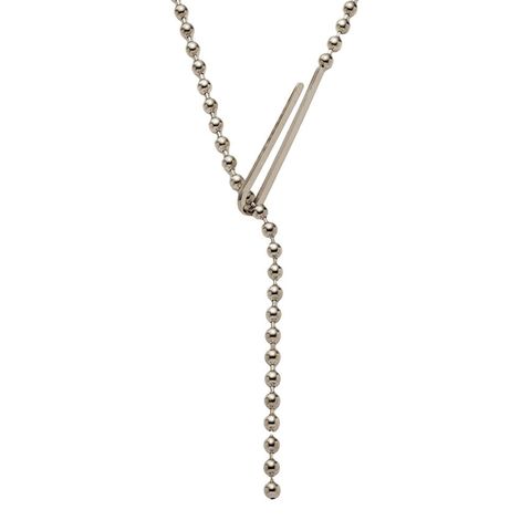 メタルボールチェーンをオーバル型の留め具に引っ掛けて使うY字ネックレス。艶めくボールチェーンが、コーデに程よいアクセントを添えてくれるひと品◎留め具を後ろにしてシンプルなチェーンネックレスとしても使えるデザインなのもポイント◎