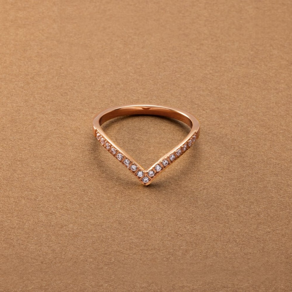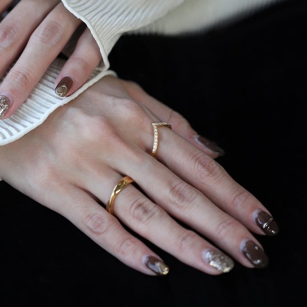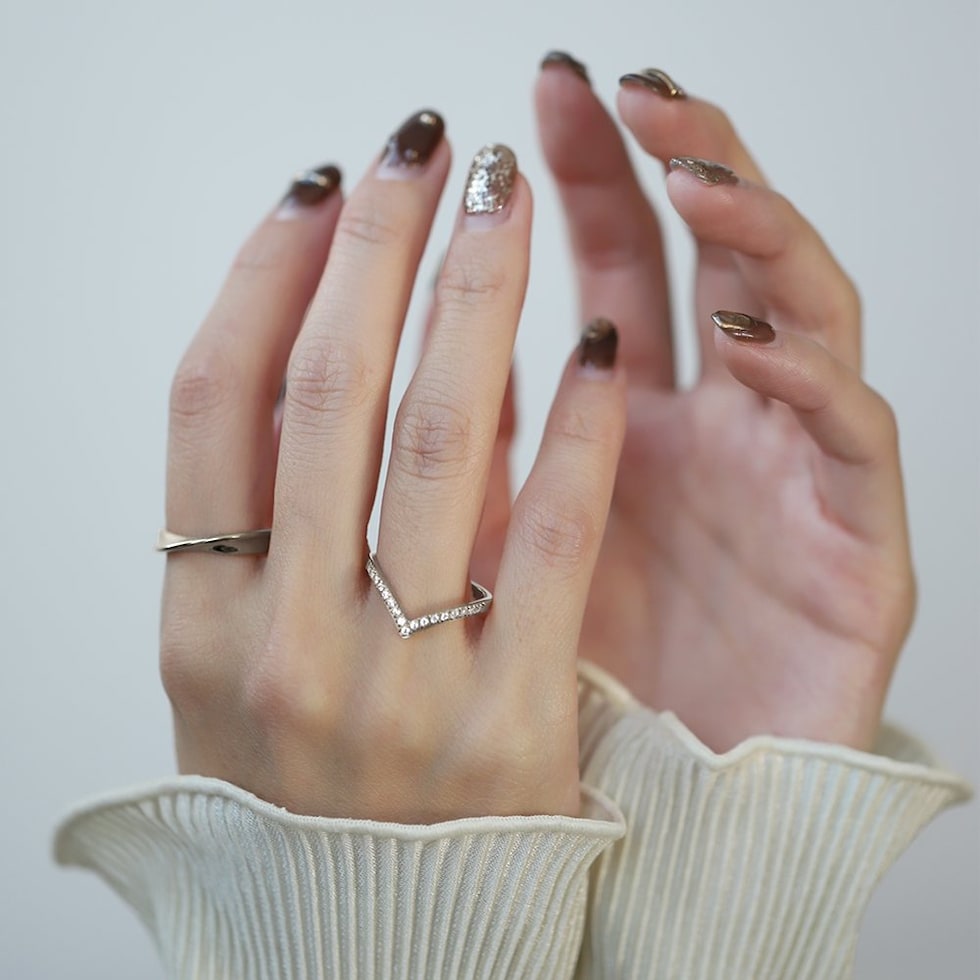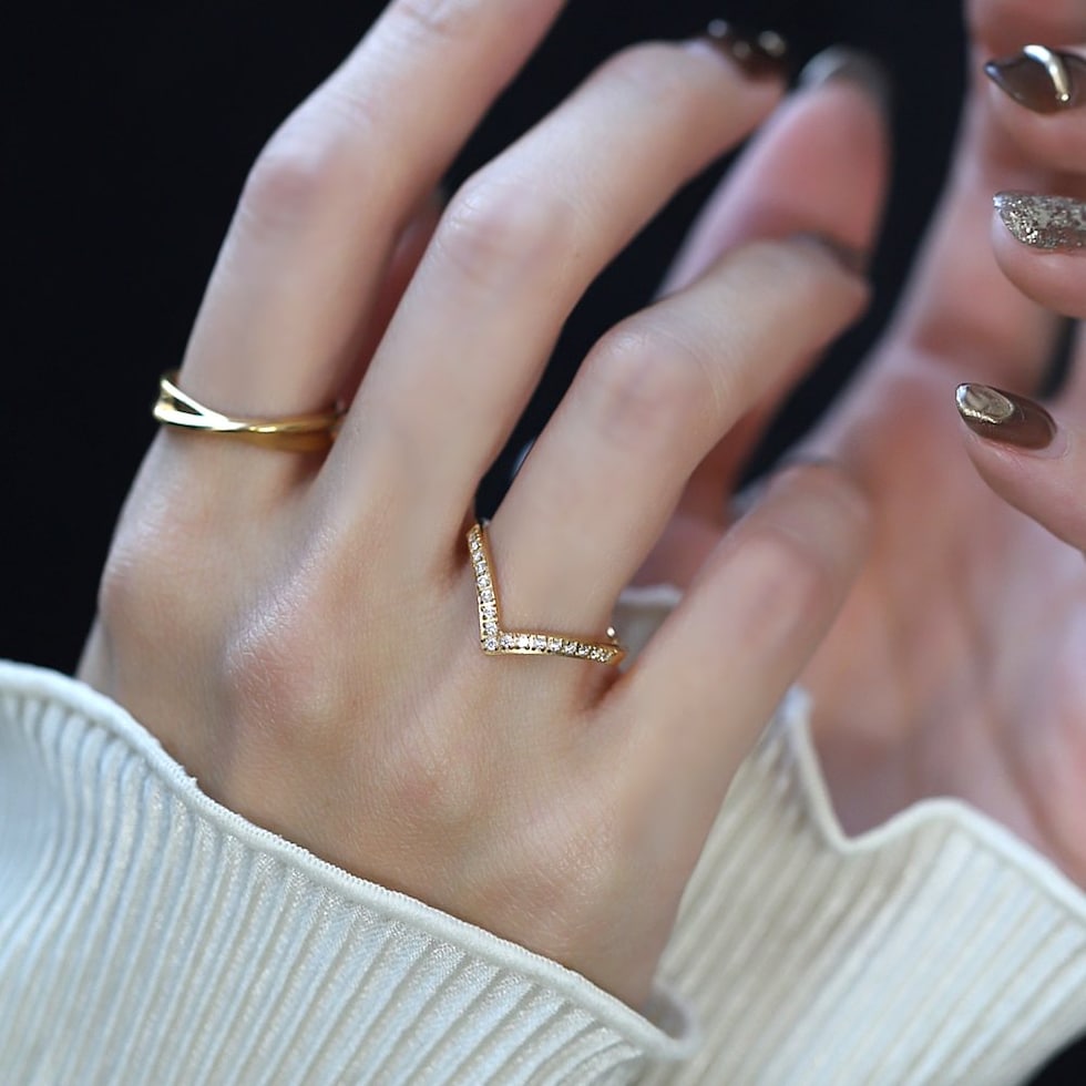 隠れハートのステンレス製V字リング。身に着けるとシャープなV字リングだけど外して見るとハートが隠れてる女心射止める洗練デザイン。V字ラインに埋め込んだ繊細なジルコニアがキラキラと煌めく手元を演出。大切な方への贈り物にはこれ一択。