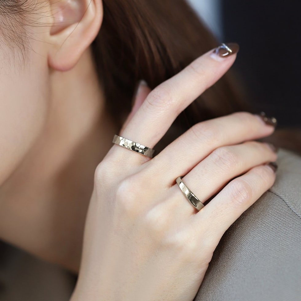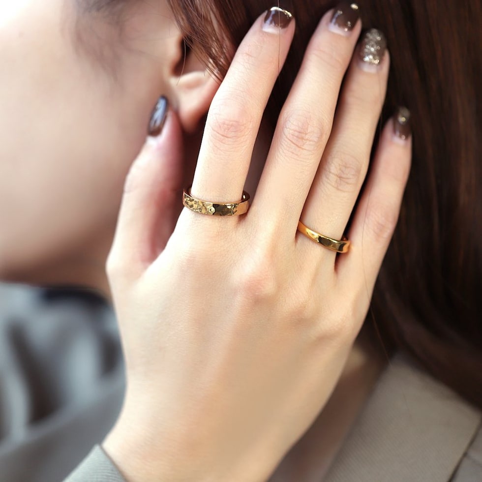 “たたき”を効かせたシンプルなステンレス製リング。表面にたたき加工を施したちょっぴりヴィンテージライクな逸品。やっぱりシンプルかつスタイリッシュに決めたいオトナの女性に寄り添う定番アイテムです。