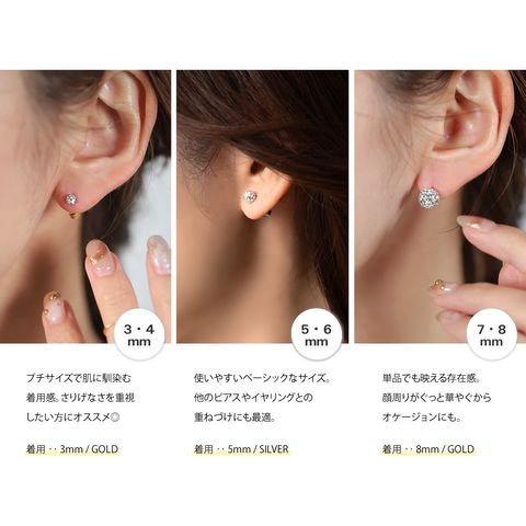 キャッチが落ちないネジロック式のスタッドピアス。3mm~8mmの6サイズ、シルバー/ゴールドのカラーから選べる全12種類。繊細に煌めくパヴェとビジューが煌くキャッチで前後どちらから見ても可愛い◎円柱型のキャッチがつまみやすく着けやすいのも嬉しいpoint♪錆びにくく傷に強いステンレス製です。