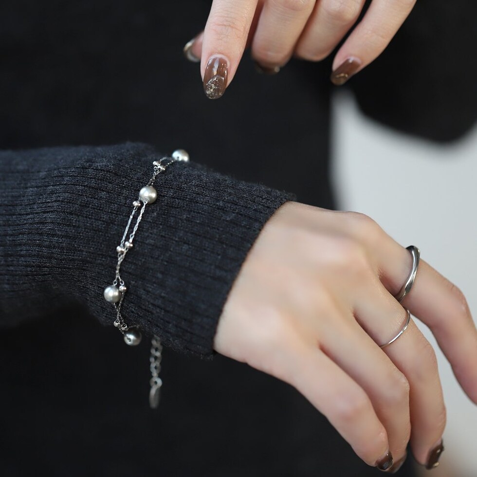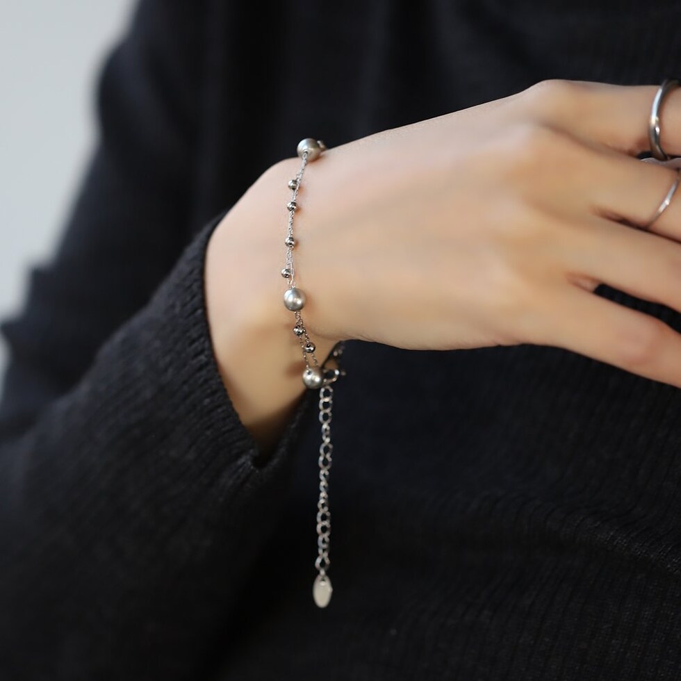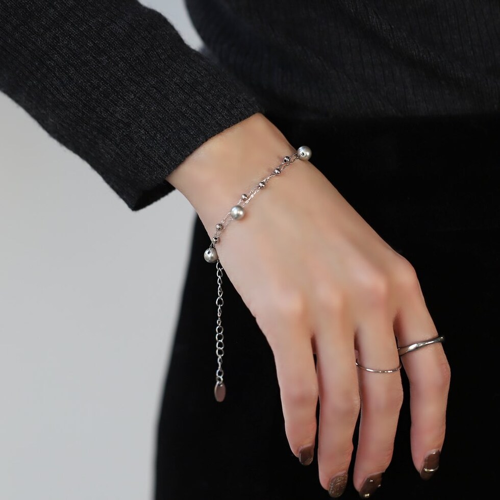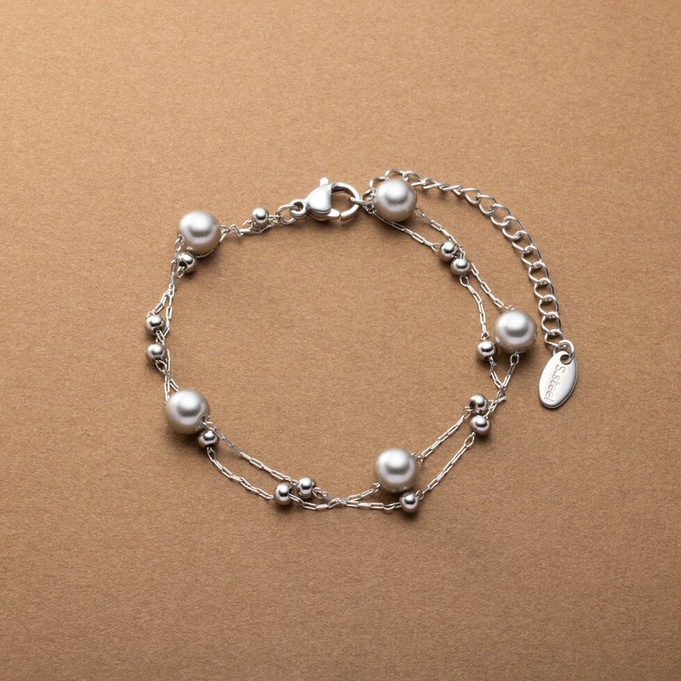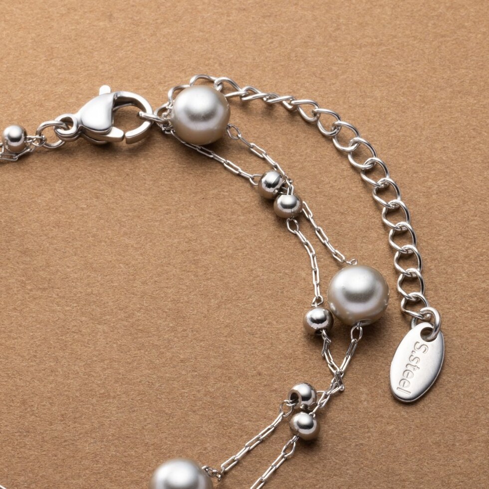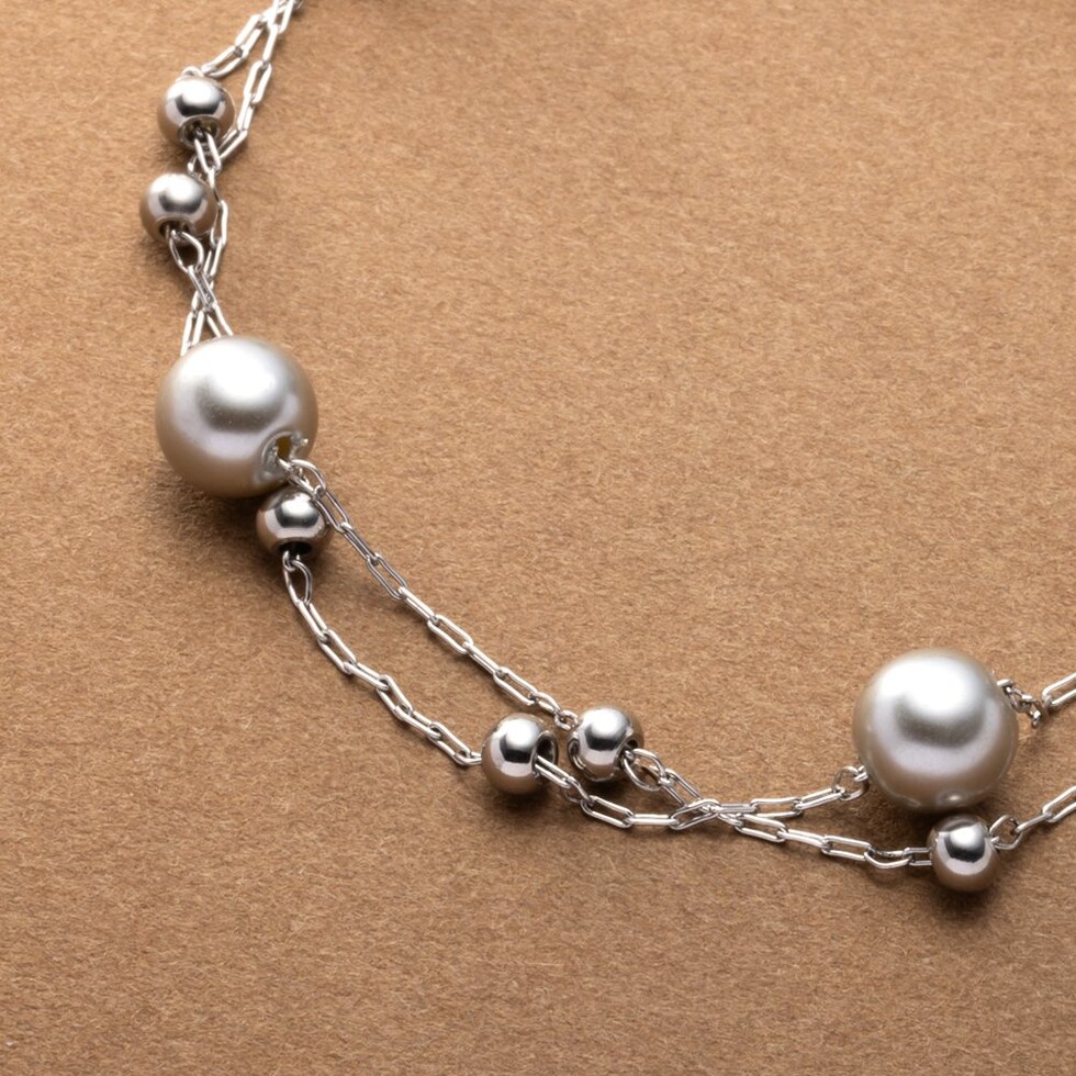 華奢なオーバルチェーンにメタルボールとグレーパールを配した2連ブレスレット。上品に煌めくMIXデザインが、手元にさりげないアクセントを添えてくれるひと品。錆びにくく傷に強いステンレス製で、デイリーに活躍してくれます。長時間の着用も安心の低アレルギー素材です。