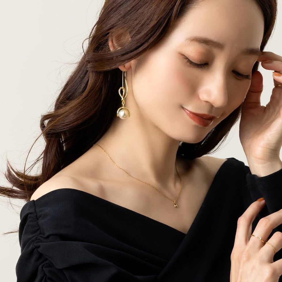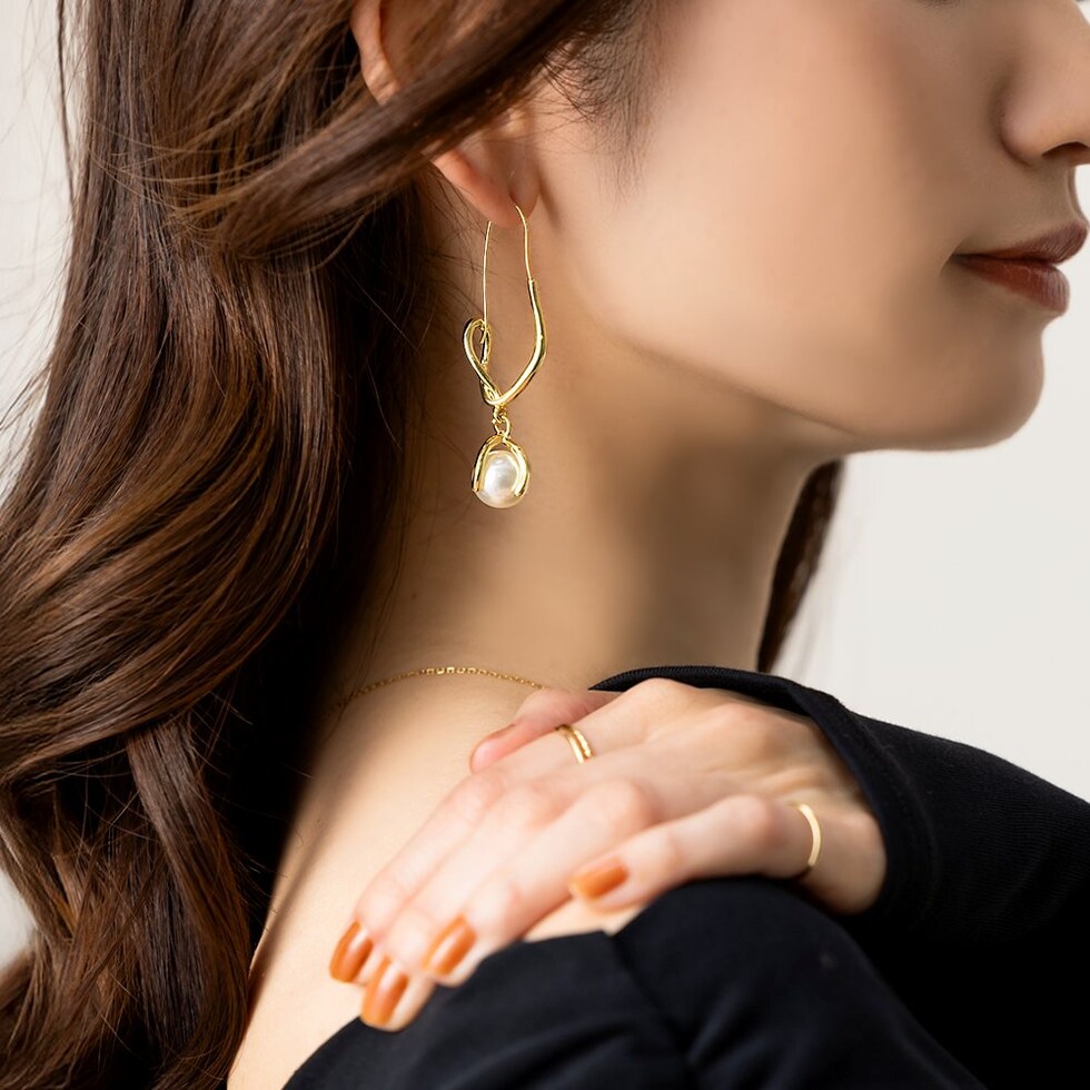 一粒パールと存在感を放つメタルデザインのフックピアス。他にはないニュアンスたっぷりなフォルムがコーデを格上げしてくれるひと品。周りと差がつくオススメのアイテムです。
