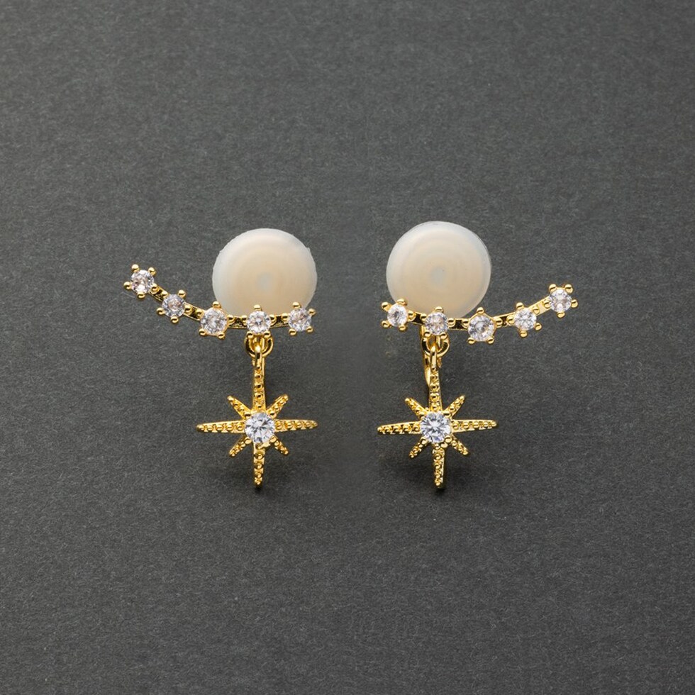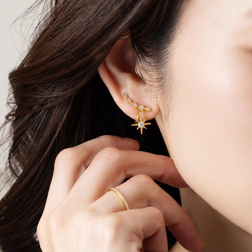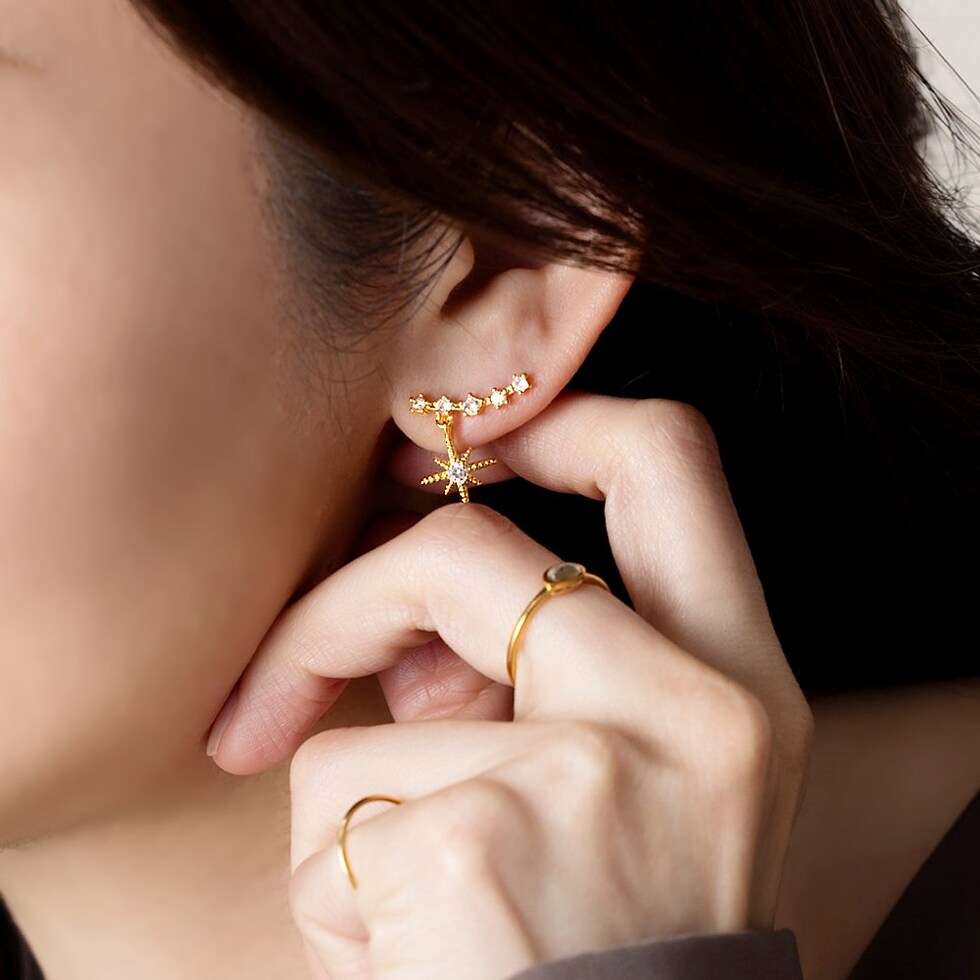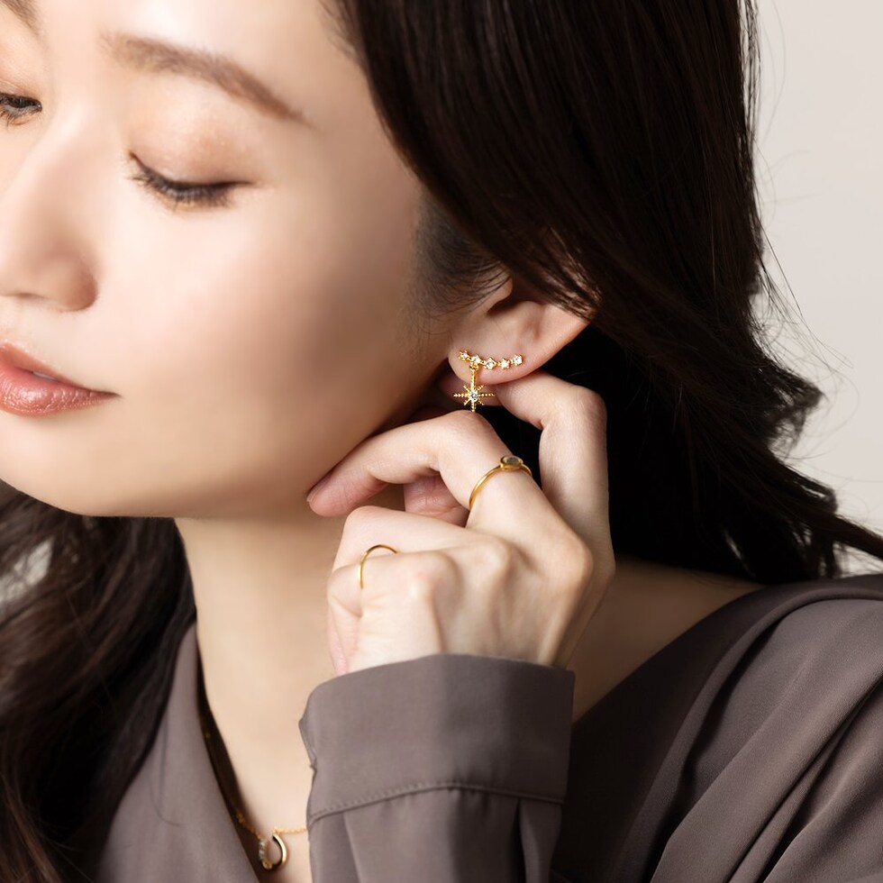 神秘的に揺れるスターイヤリング。5粒のジルコニアを並べたカーブビジューラインの下でスターモチーフが揺れる眩い煌めきデザインで耳元華やか。痛くなりにくいのが嬉しいシリコンカバー付きで耳たぶをしっかりとホールドしてくれます◎