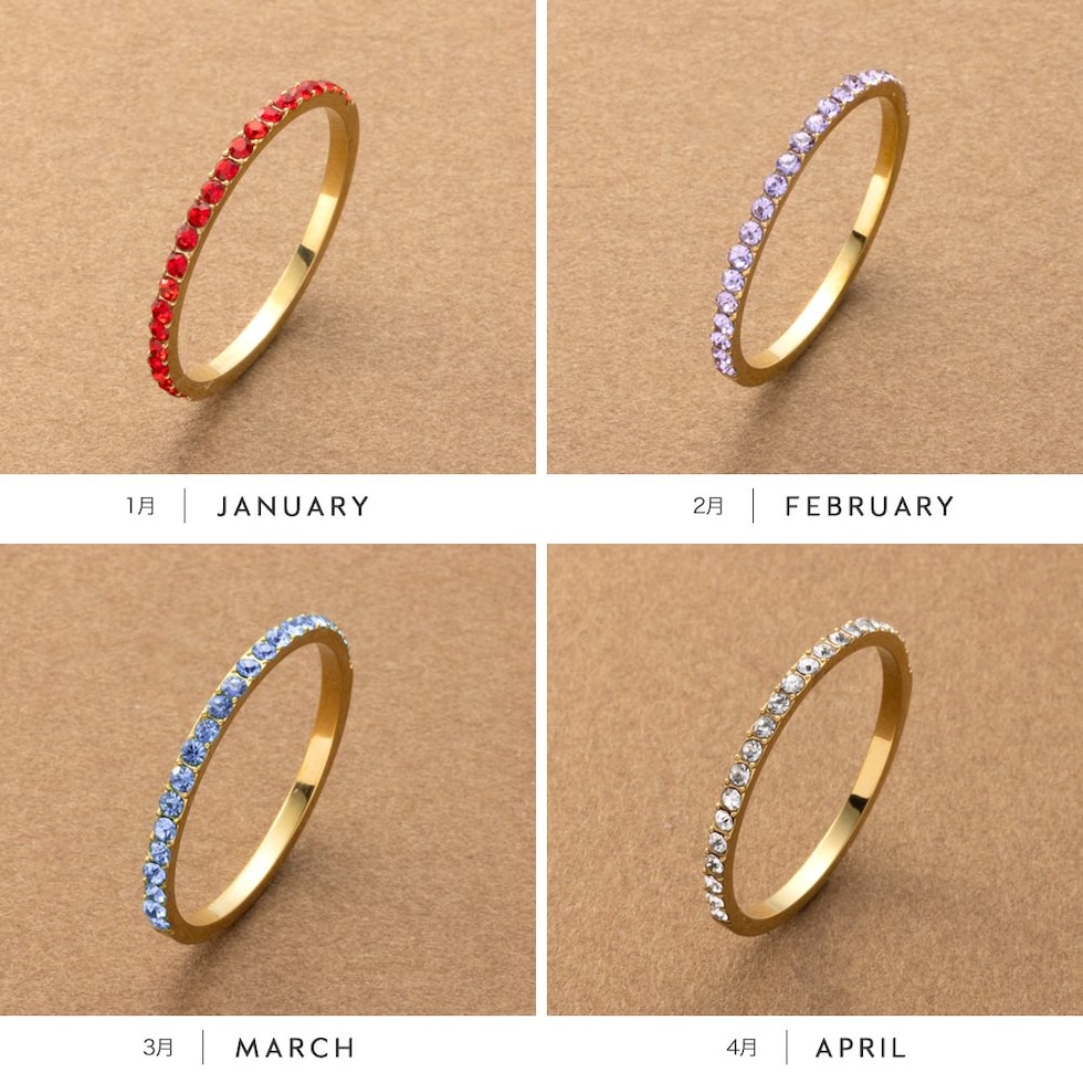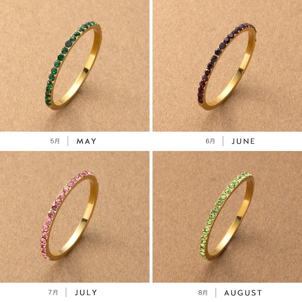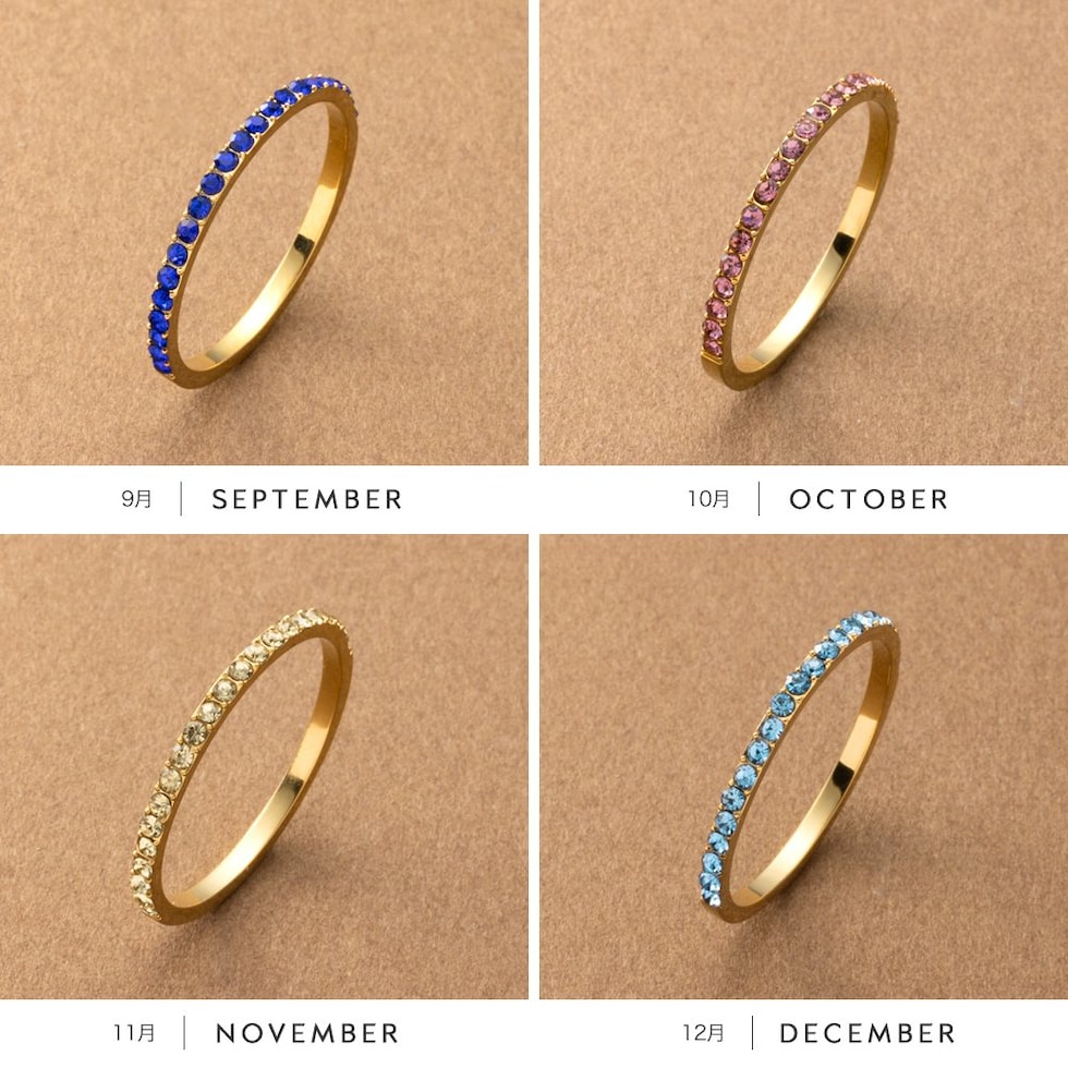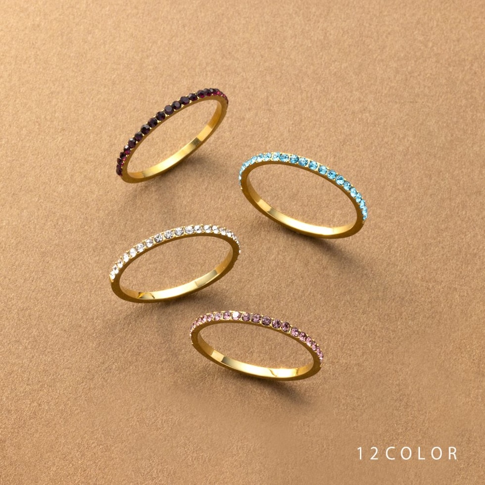 並んだカラービジューがリッチで上品な印象を演出するハーフエタニティリング。誕生月をイメージしたビジューが手元にアクセントを添えてくれます。シンプルなデザインと錆びにくく傷に強いステンレス製でデイリーに大活躍。長時間の着用も安心の低アレルギー素材です。