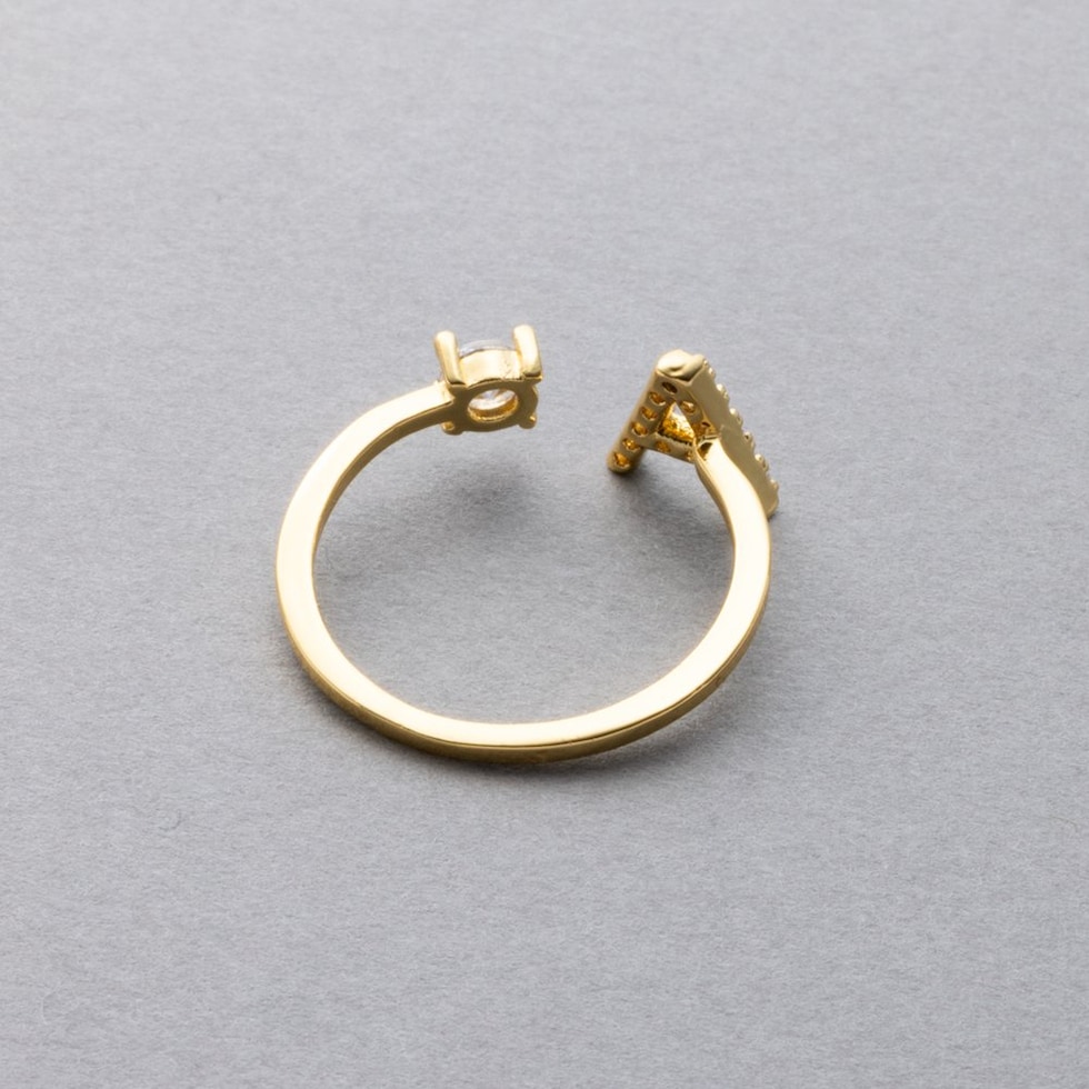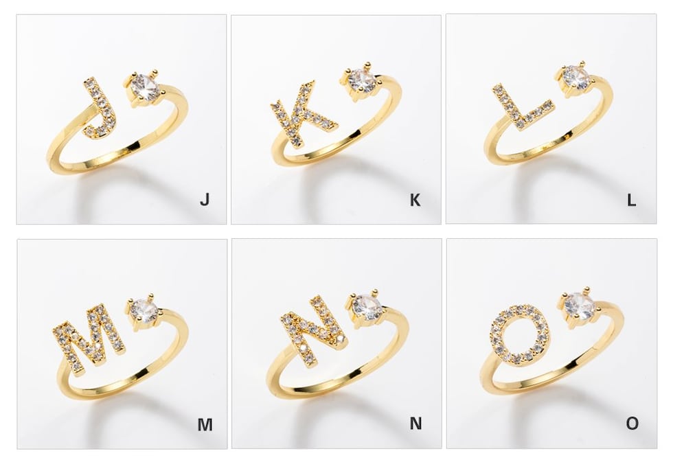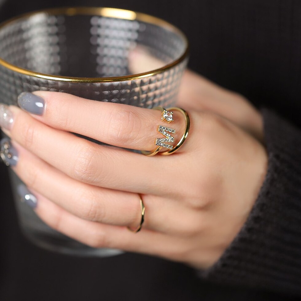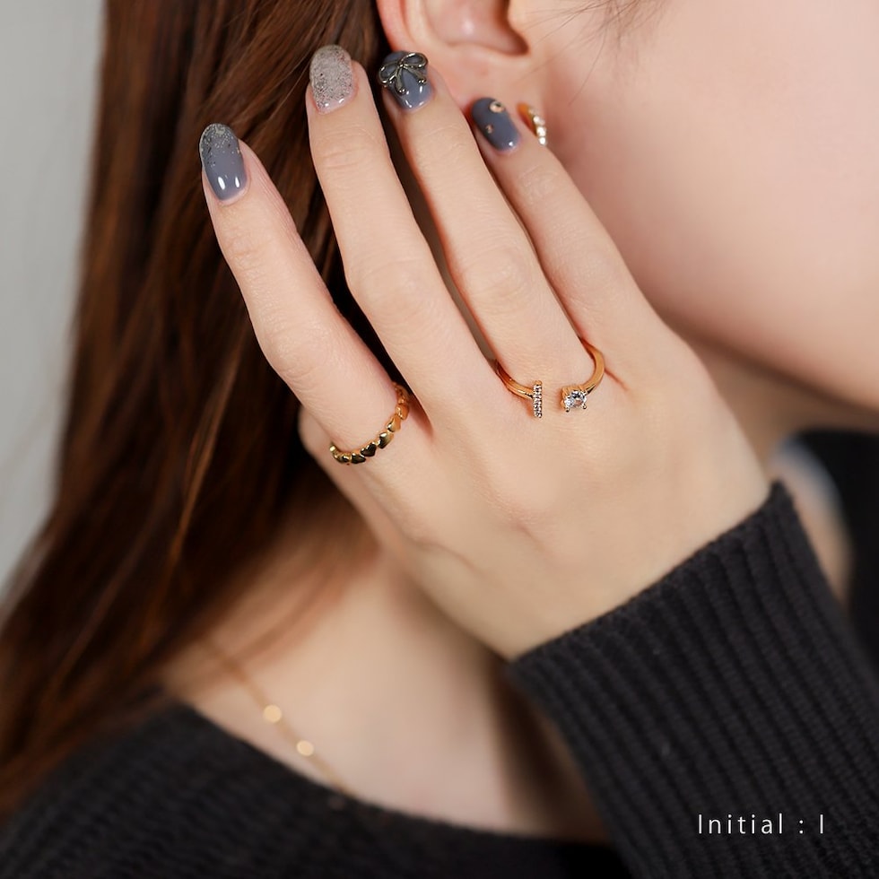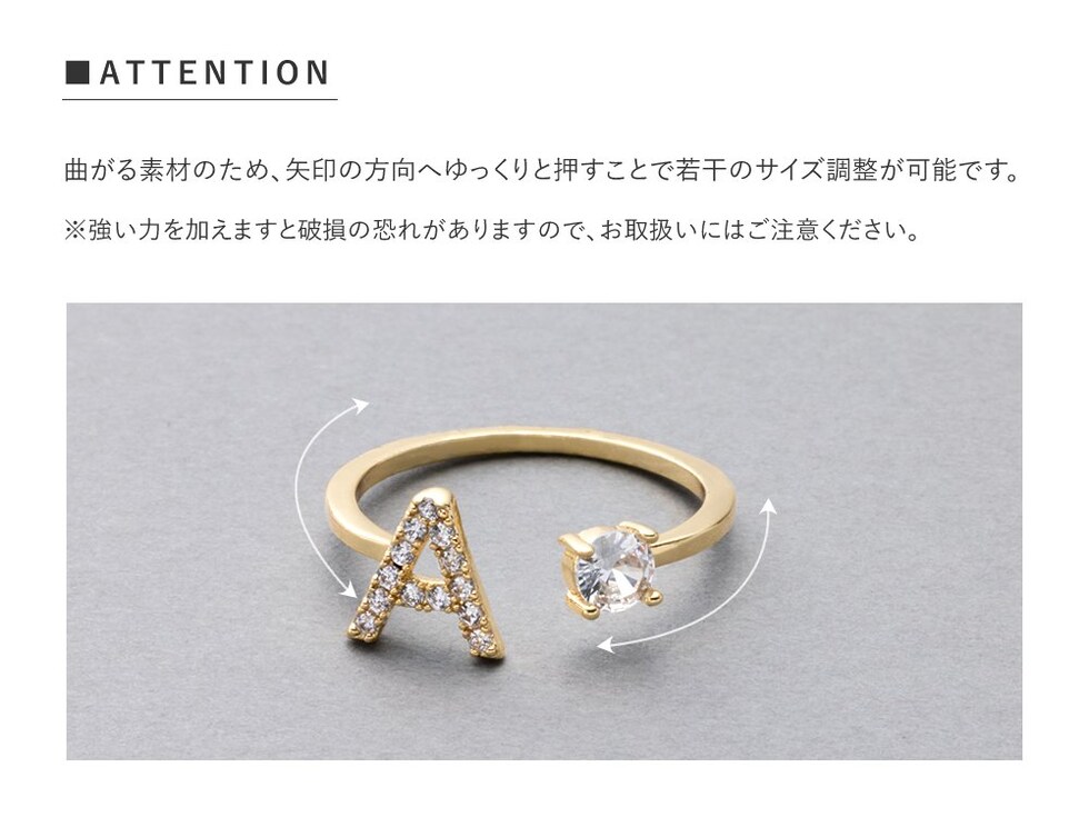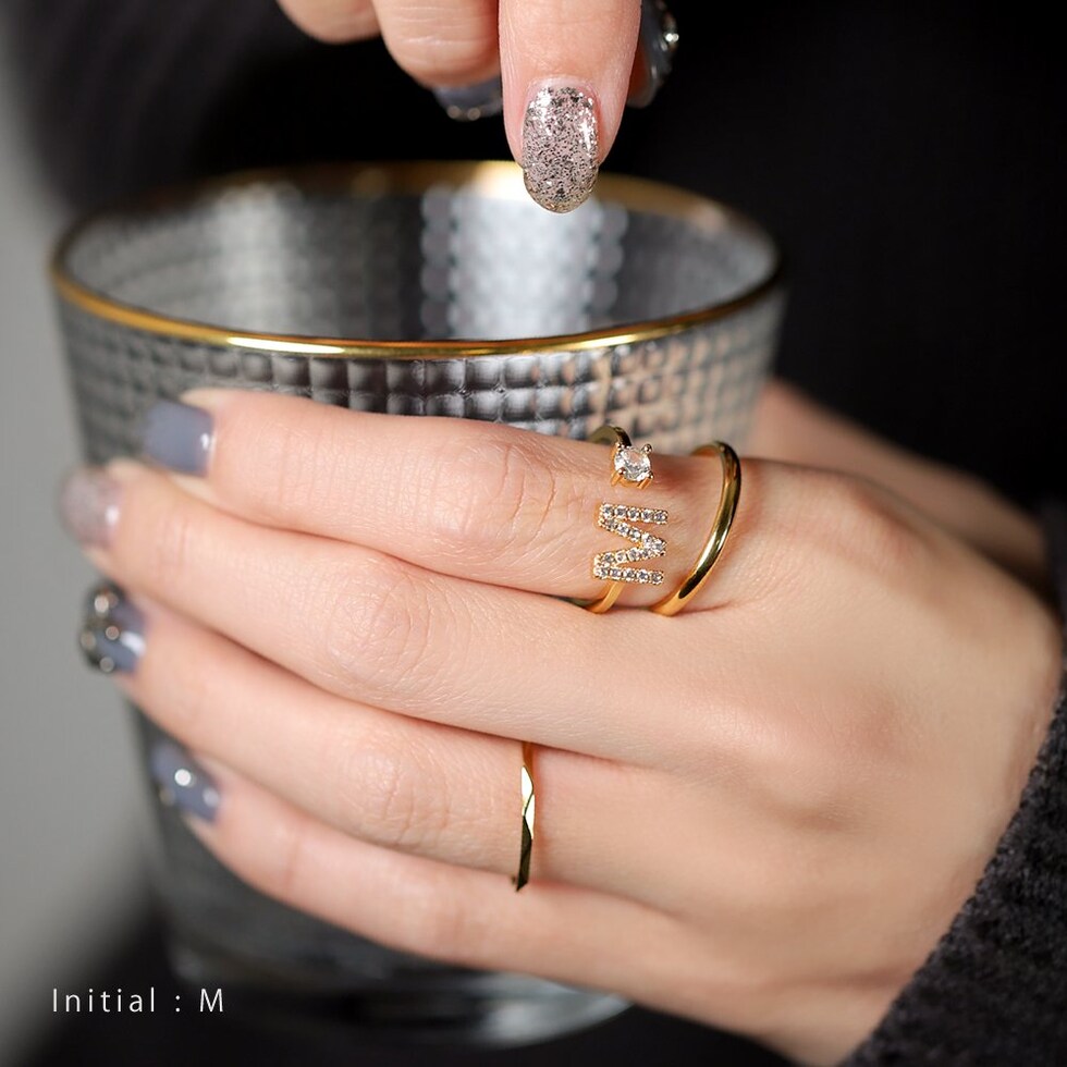 大粒なビジューとイニシャルに沿う小粒なビジューが指先で煌めくイニシャルリング。サイズ調整可能なオープンデザインで、お好みの指に着けられるのも嬉しいひと品。特別感のあるイニシャルは贈り物にもぴったりなアイテムです。