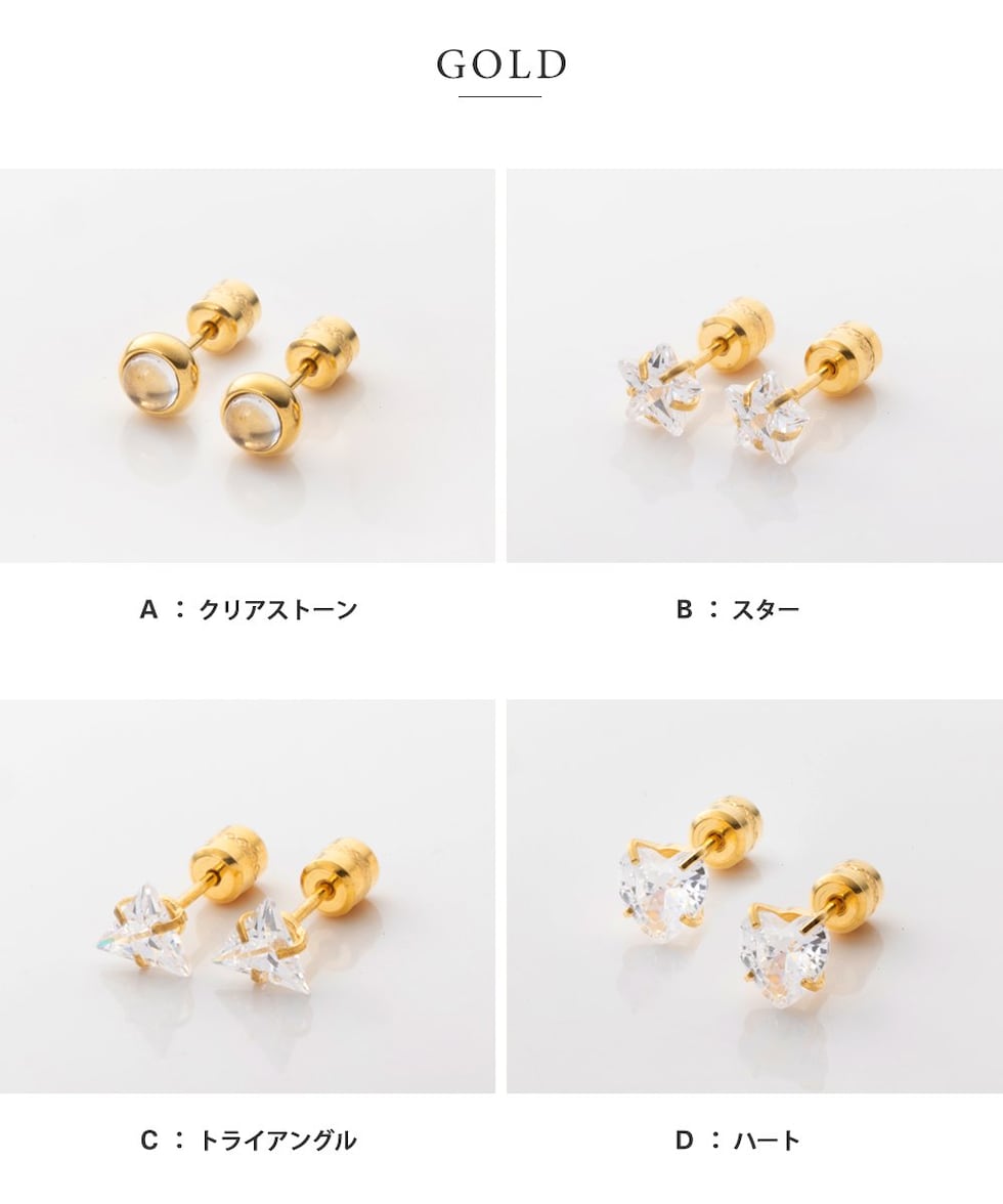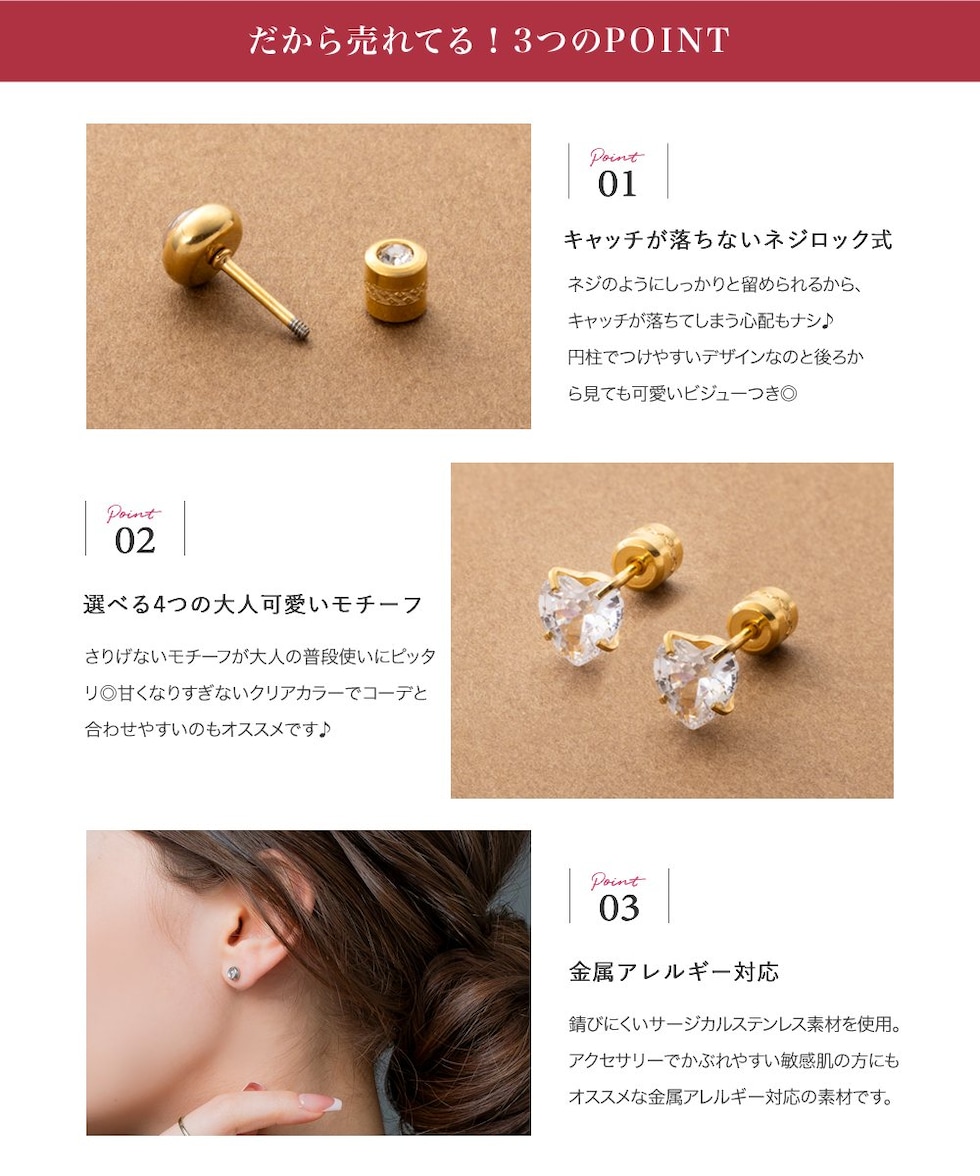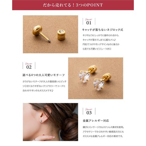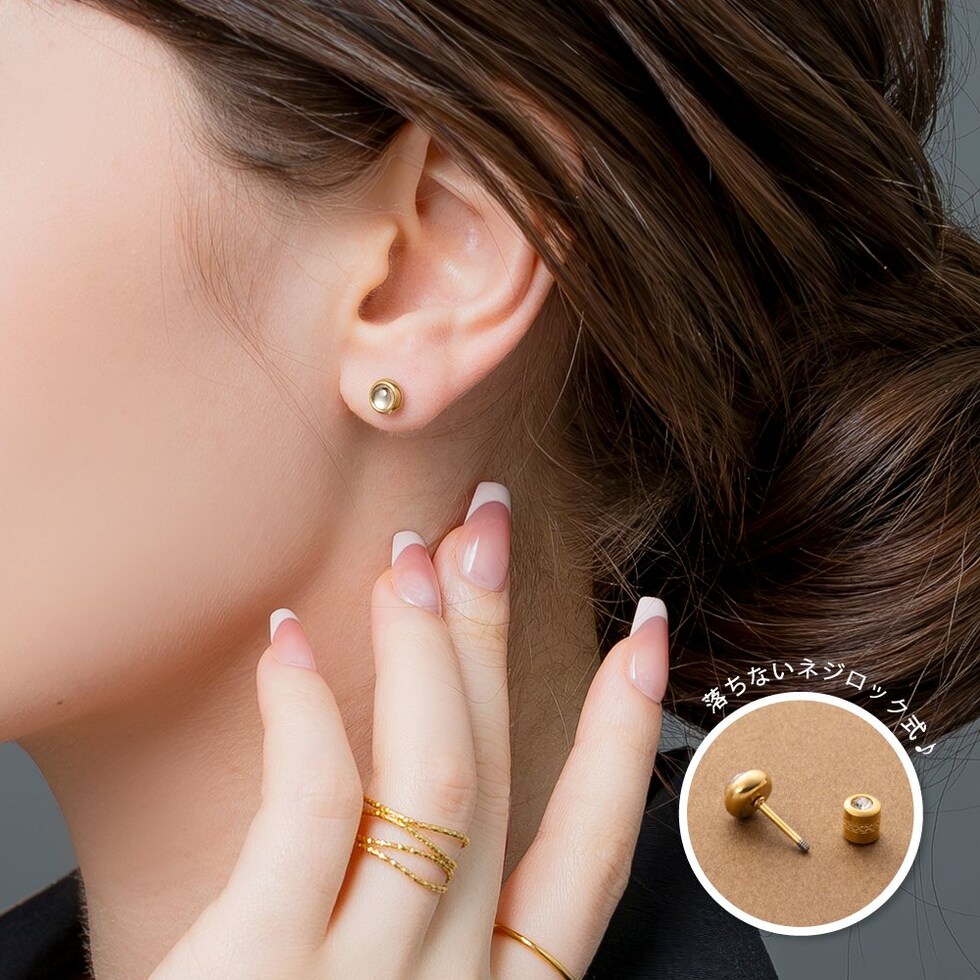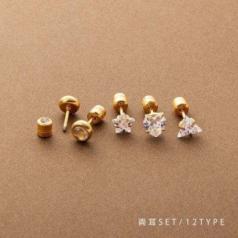 全12タイプから選べるステンレス製ネジロック式ピアス。ネジのようにしっかり留められるキャッチにはビジューも施し、後ろ姿も抜かりなく仕上がります。クリアストーンやスターなどベーシックから遊び心のあるモチーフまで複数買いもオススメ◎