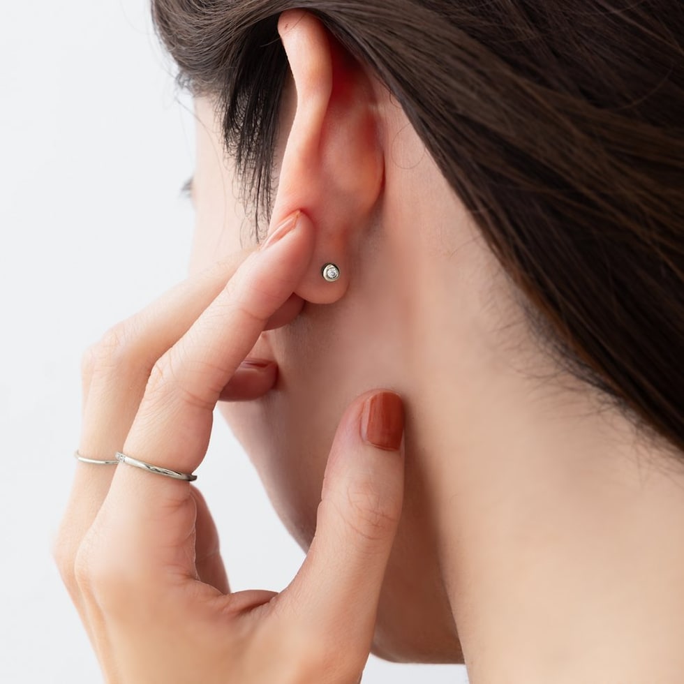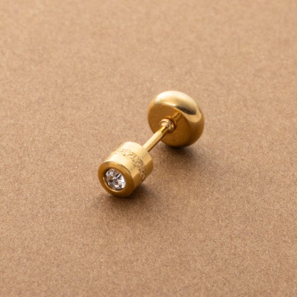 ネジのようにしっかりと留められるから、キャッチが落ちてしまう心配もナシ♪円柱でつけやすいデザインなのと後ろから見ても可愛いビジューつき◎