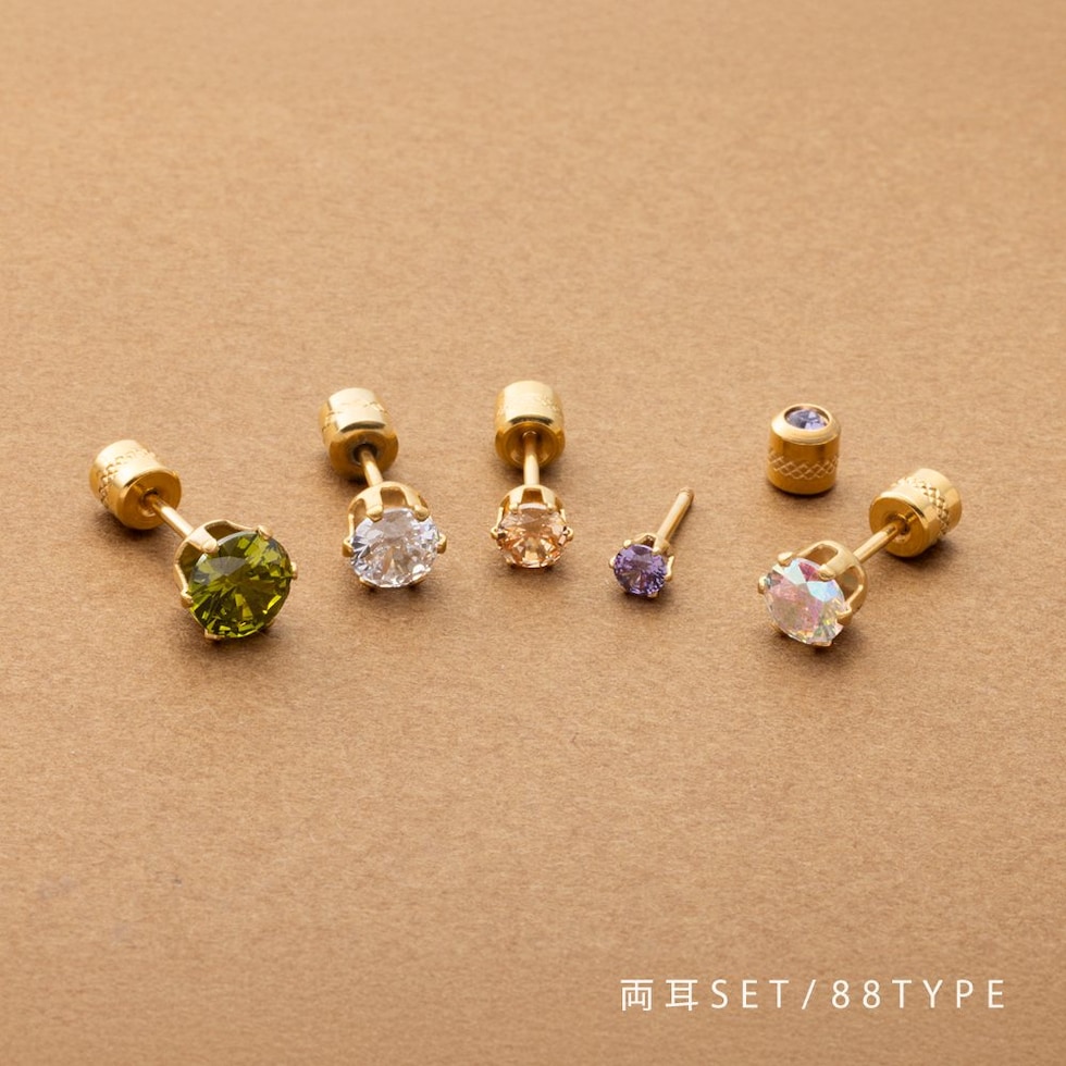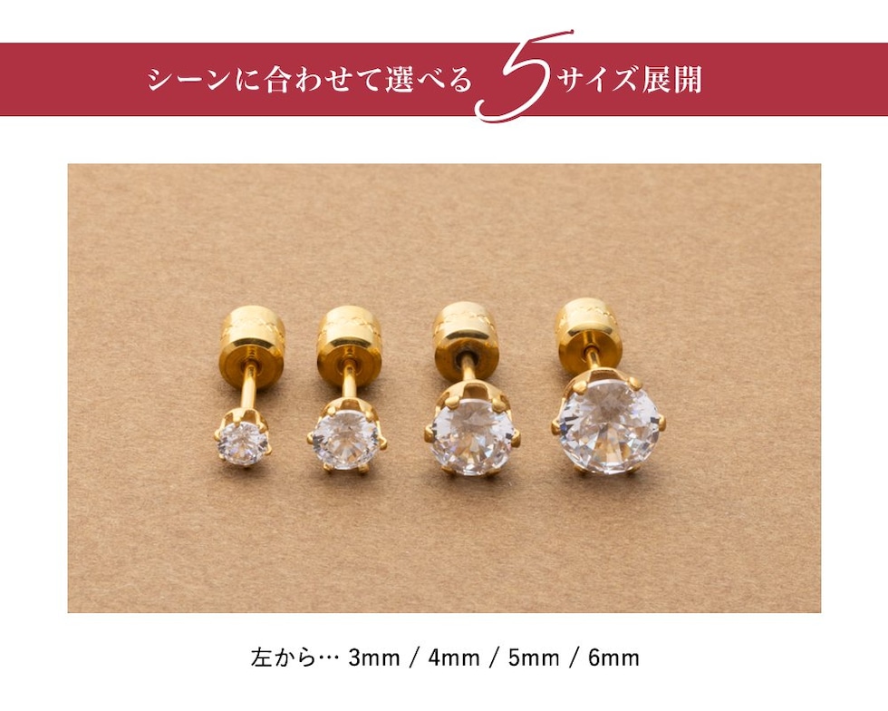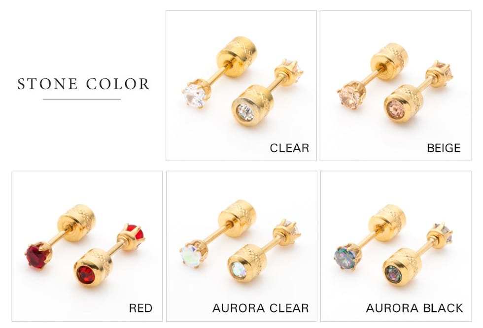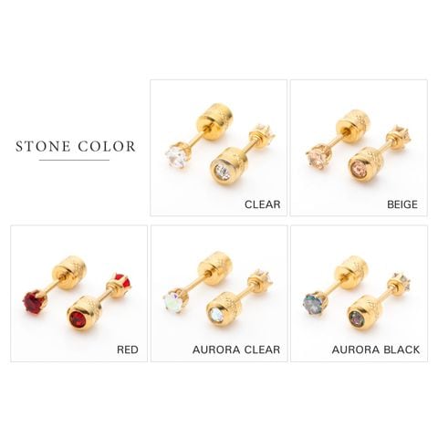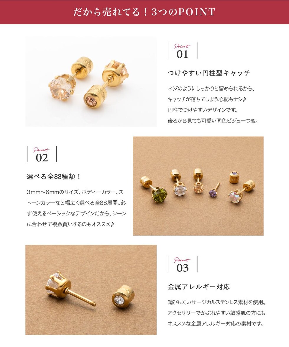 キャッチが落ちないネジロック式のスタッドピアス。3mm~6mmのサイズ、ボディーカラー、ストーンカラーなど幅広く選べる全88展開です。クラウン型の台座でビジューがより一層煌くデザインです。同色のビジューが煌くキャッチで、前後どちらから見ても可愛い◎必ず使えるベーシックなデザインだから、シーンに合わせて複数買いするのもオススメ♪錆びにくく傷に強いステンレス製です。