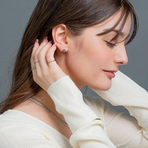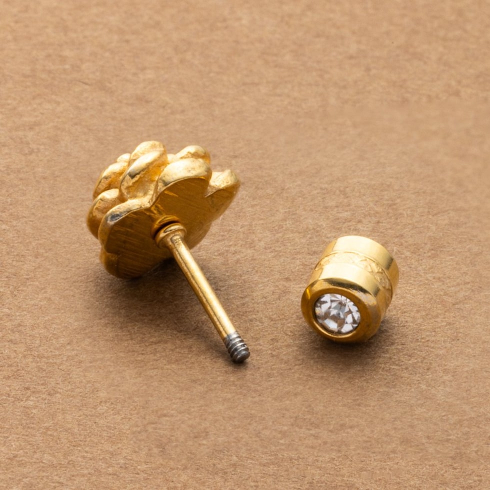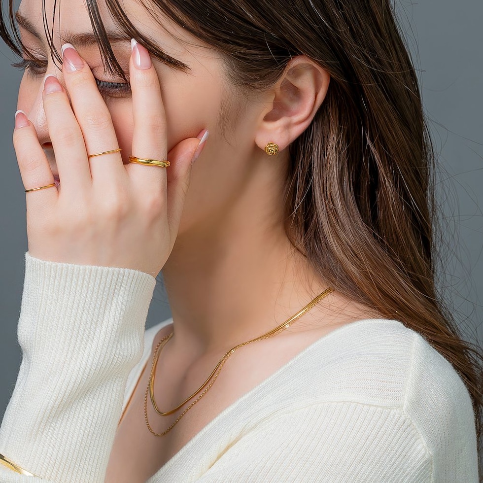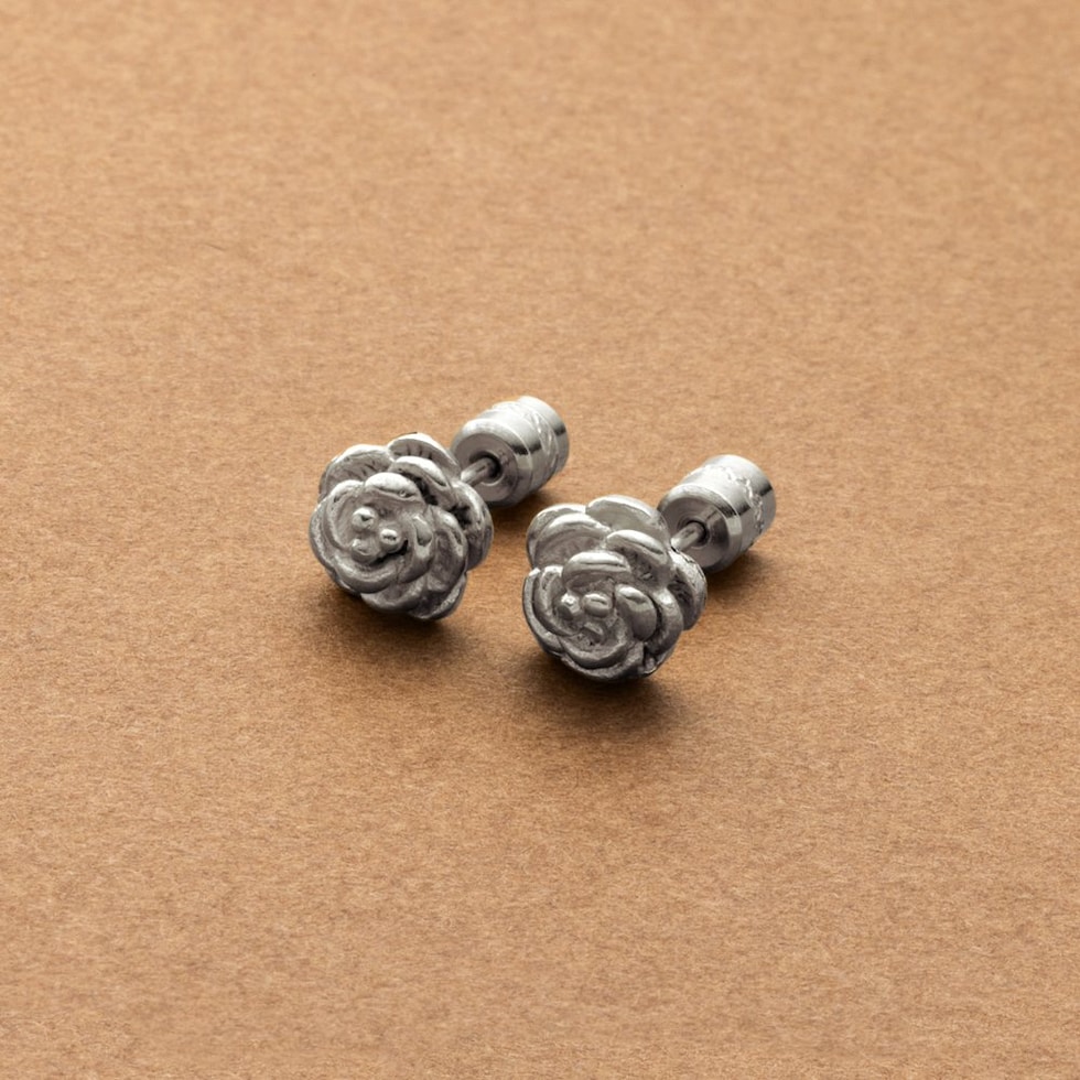 カメリアフラワーのネジロック式スタッドピアス。さりげないアクセントを添えてくれるメタルフラワーとビジュー煌めくキャッチで、前後どちらから見ても可愛い。コーデや気分に合わせて楽しめるアイテムです◎錆びにくいステンレス製でデイリーに活躍しそう。