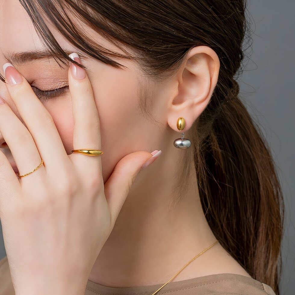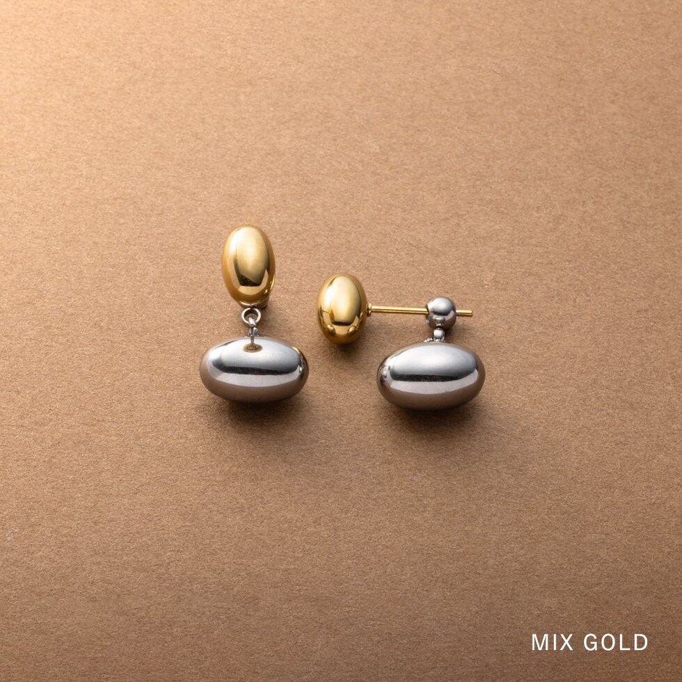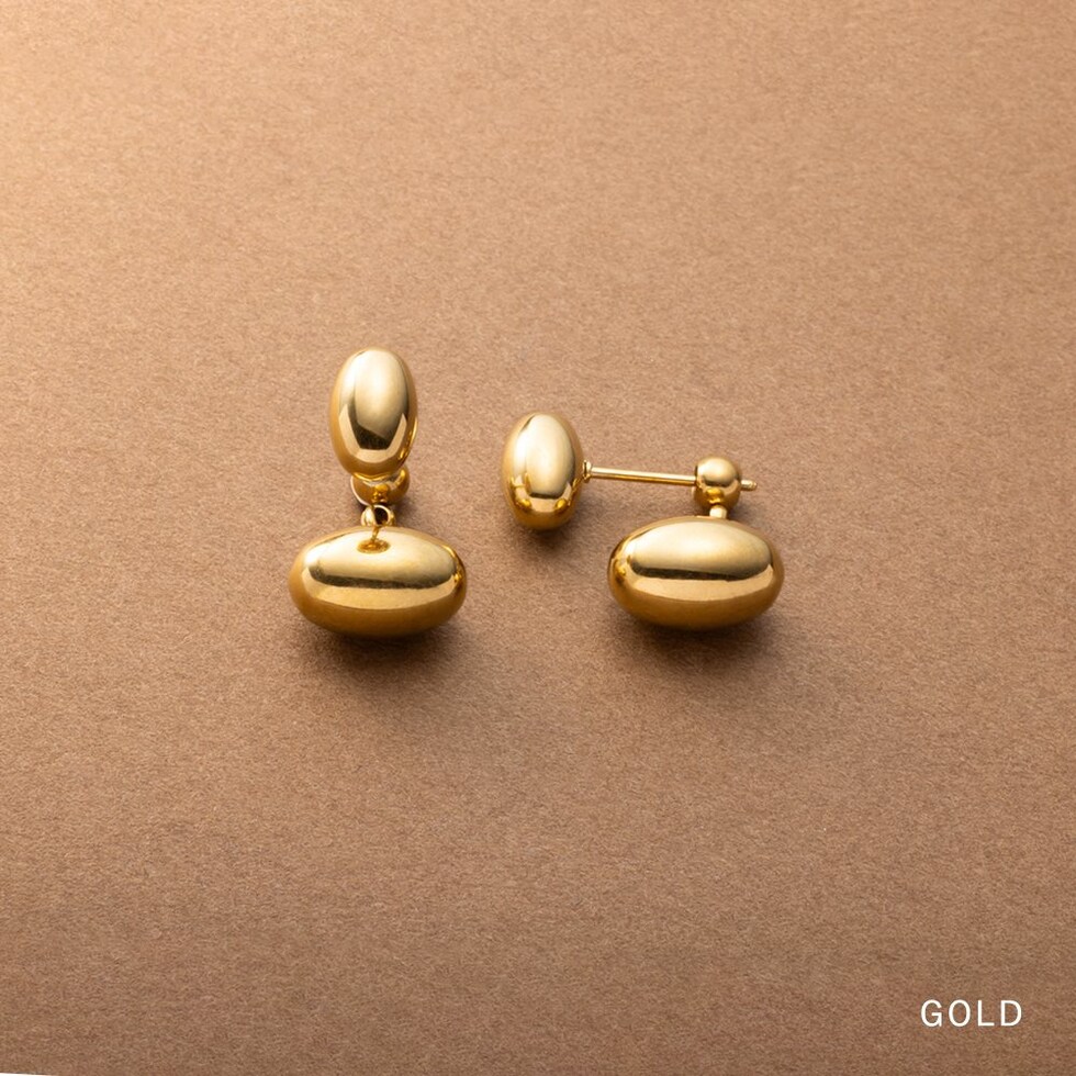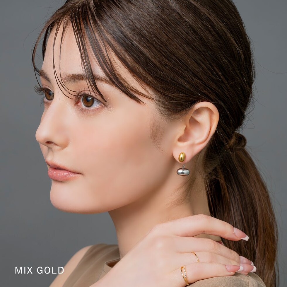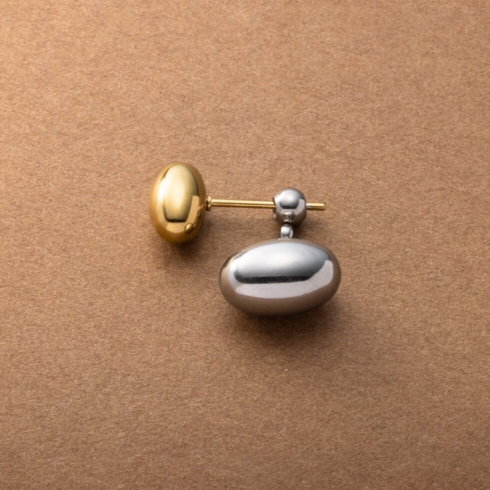 ぷっくりとしたフォルムが卵のようなダブルモチーフのバックキャッチピアス。立体的なフォルムがどの角度から見ても抜かりない可愛さを演出◎耳裏でちょい揺れするモチーフと、バイカラーで個性的なデザインが大人っぽい品格を演出。錆びにくく傷に強いステンレス製で、長時間の着用も安心の低アレルギー素材です。