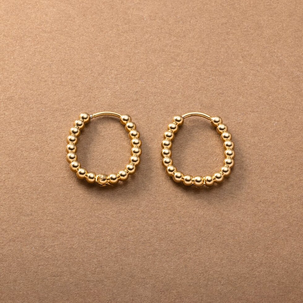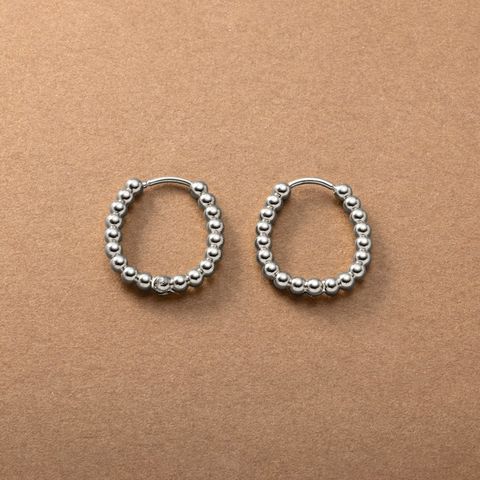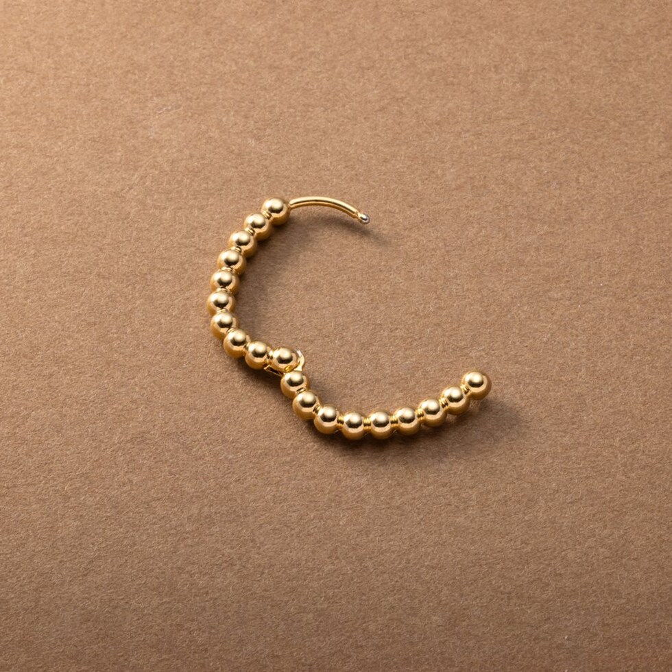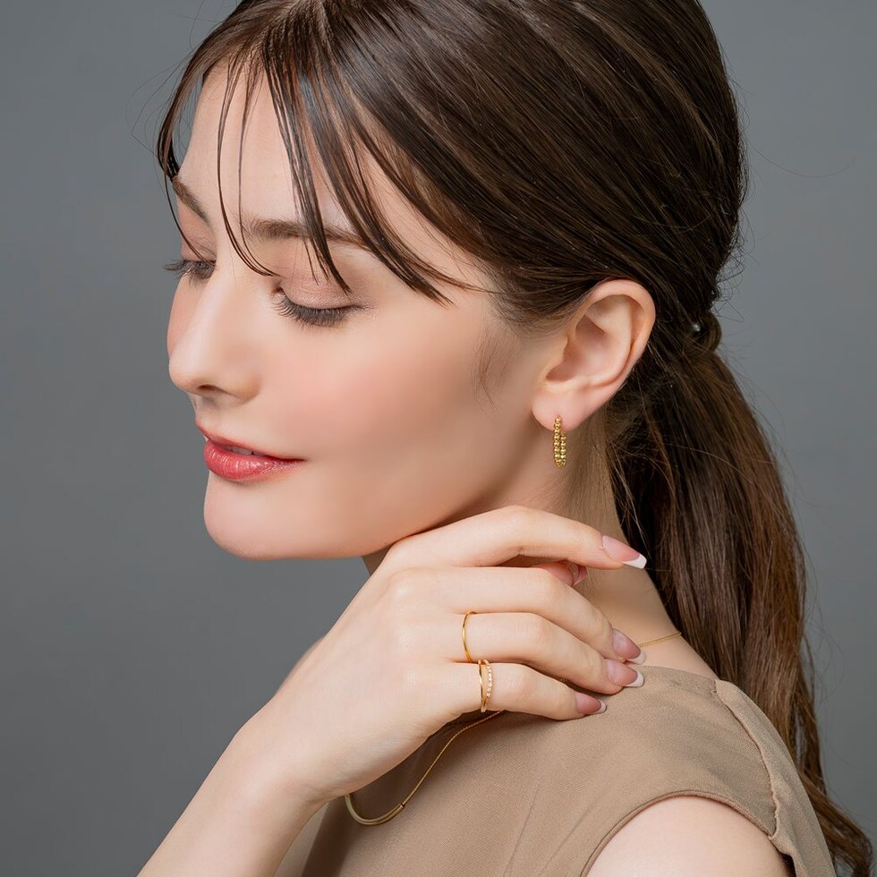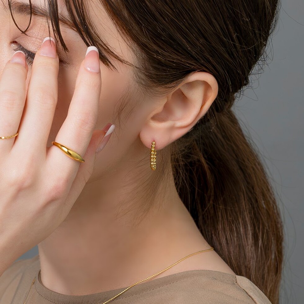 小さなメタルボールを連ねたような開閉式キャッチレスピアス。メタルの艶めきと個性的な形が目を惹くデザインで、横顔をグッと印象づけてくれます。キレイめはもちろんカジュアルスタイルにもおすすめです。錆びにくく傷に強いステンレス製で、長時間の着用も安心の低アレルギー素材です。