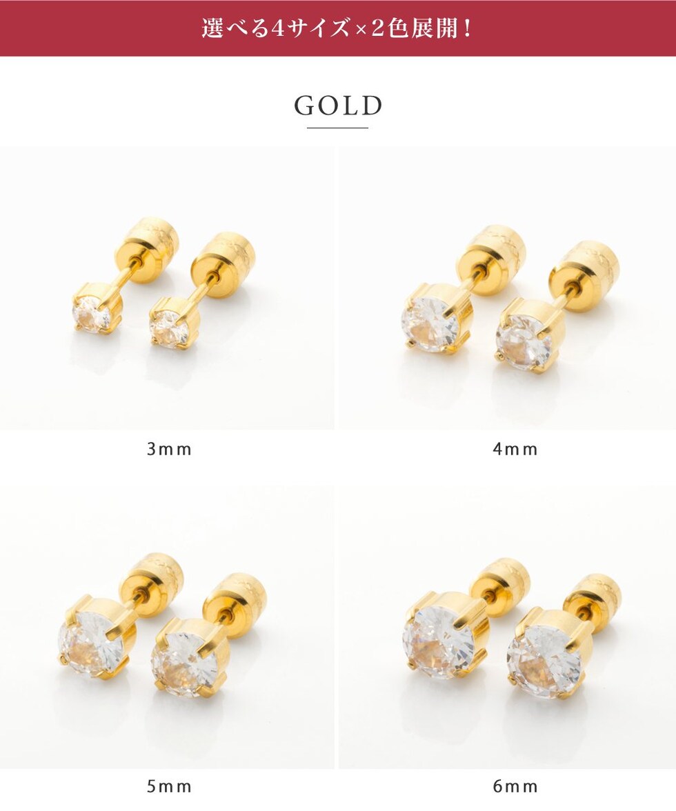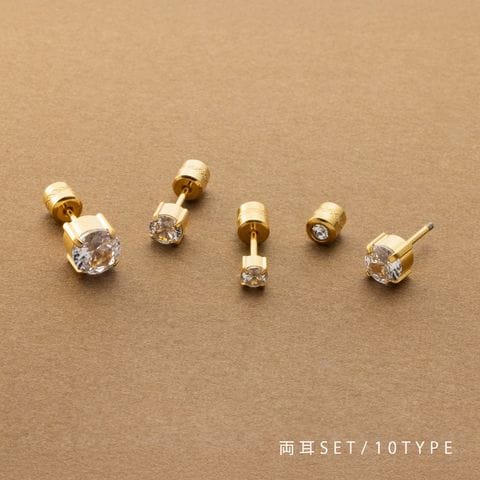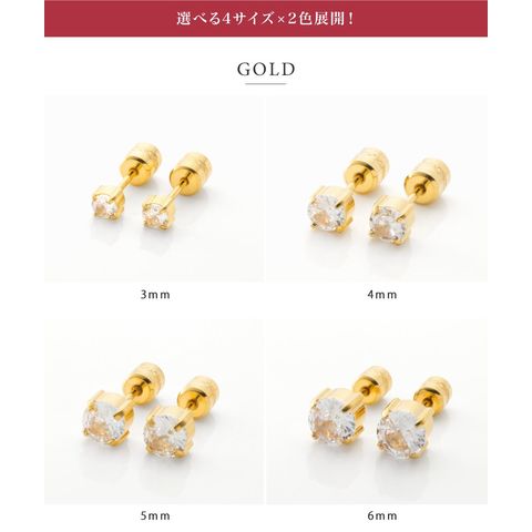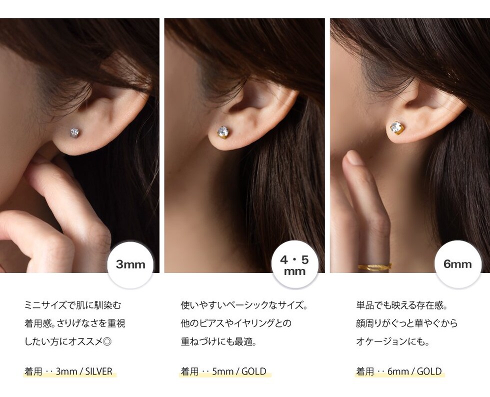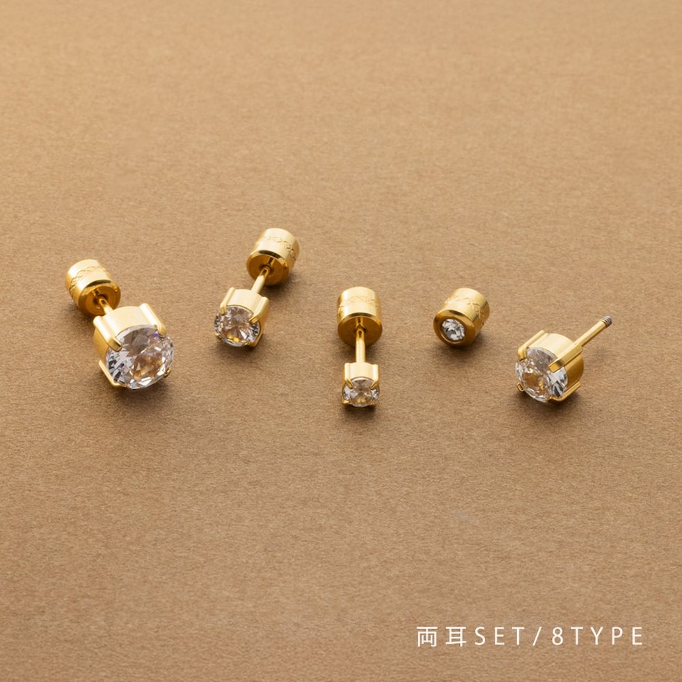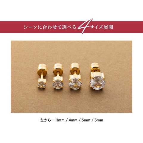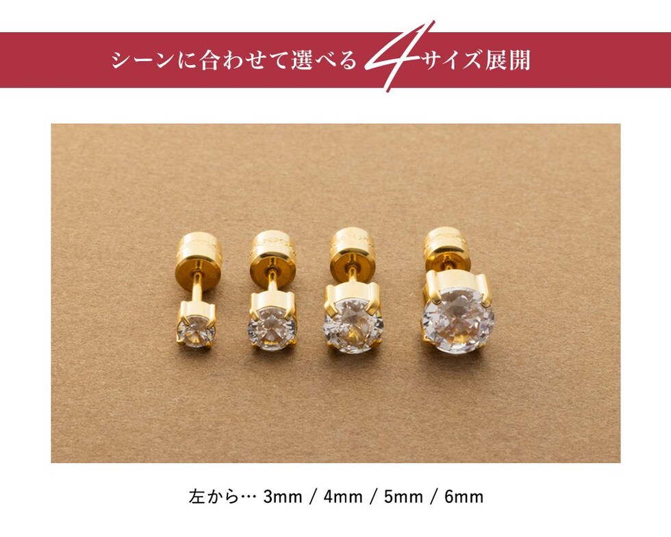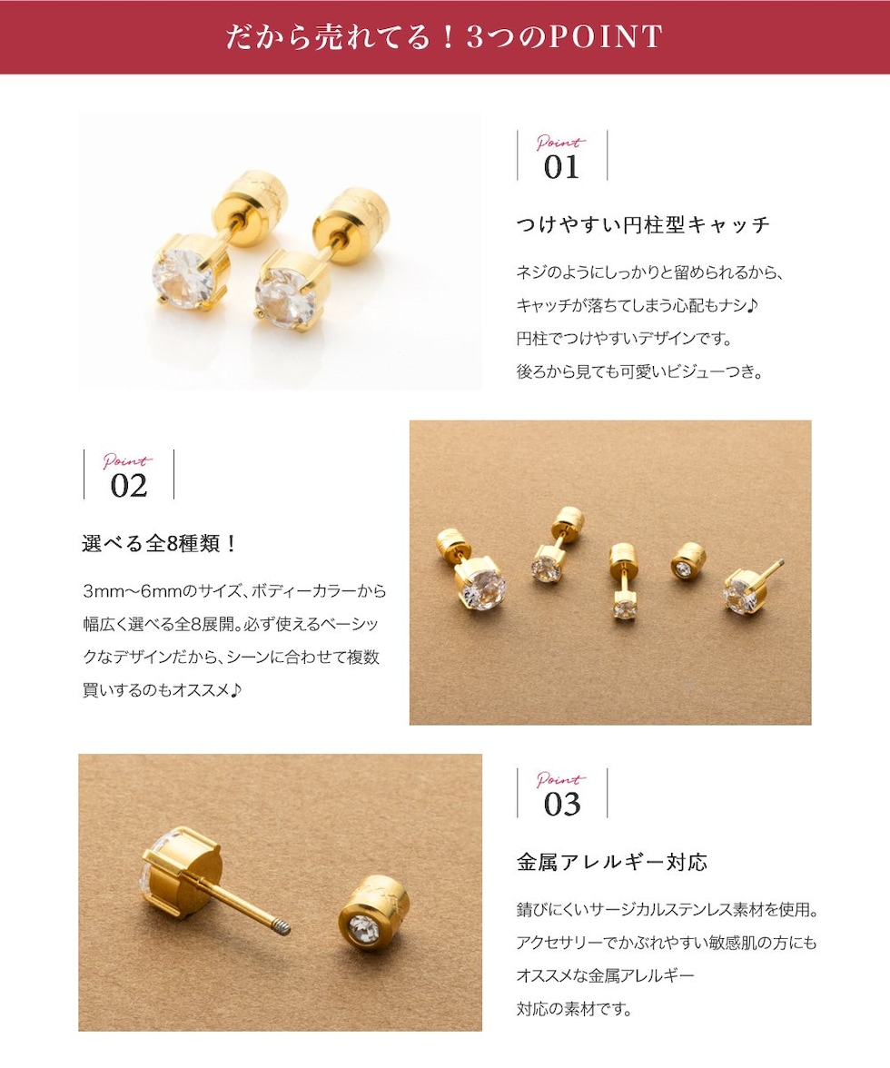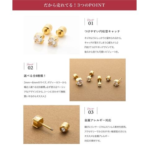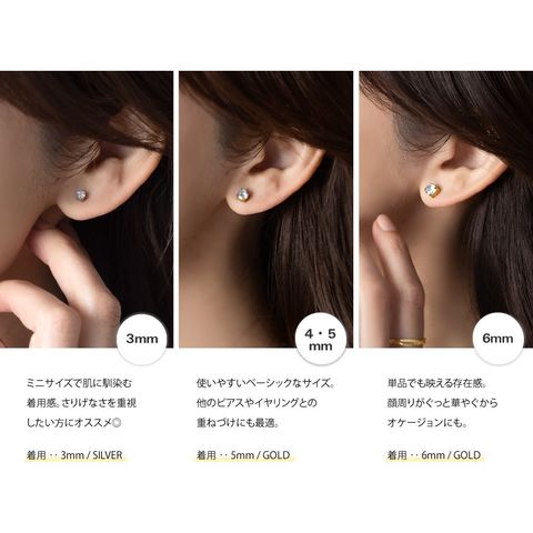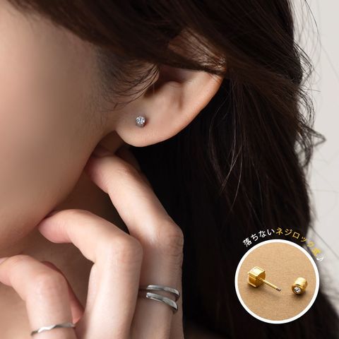 キャッチが落ちないネジロック式のスタッドピアス。3mm~6mmのサイズ、ボディーカラーなど選べる全8展開です。シンプルですっきりとした台座で他のピアスやイヤリングとの相性も◎。必ず使えるベーシックなデザインだから、シーンに合わせて複数買いするのもオススメ。錆びにくく傷に強いステンレス製です。