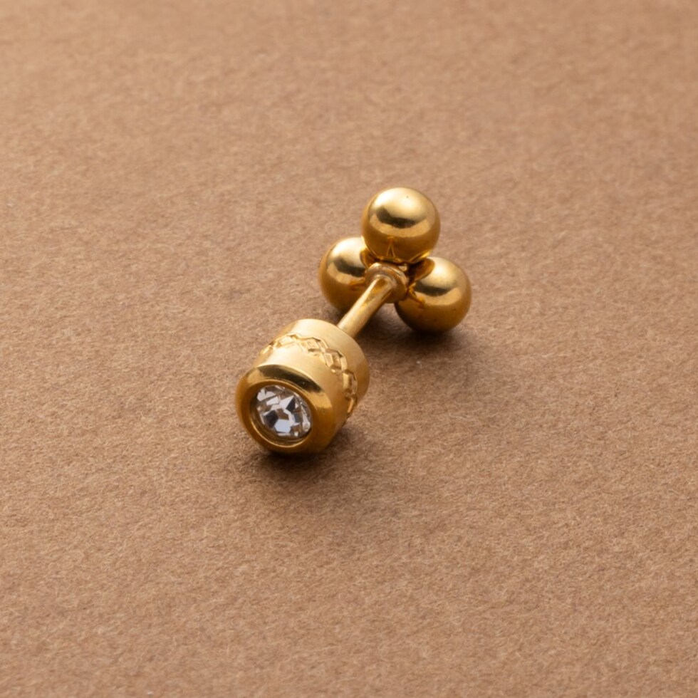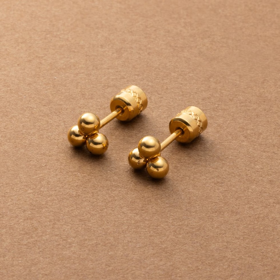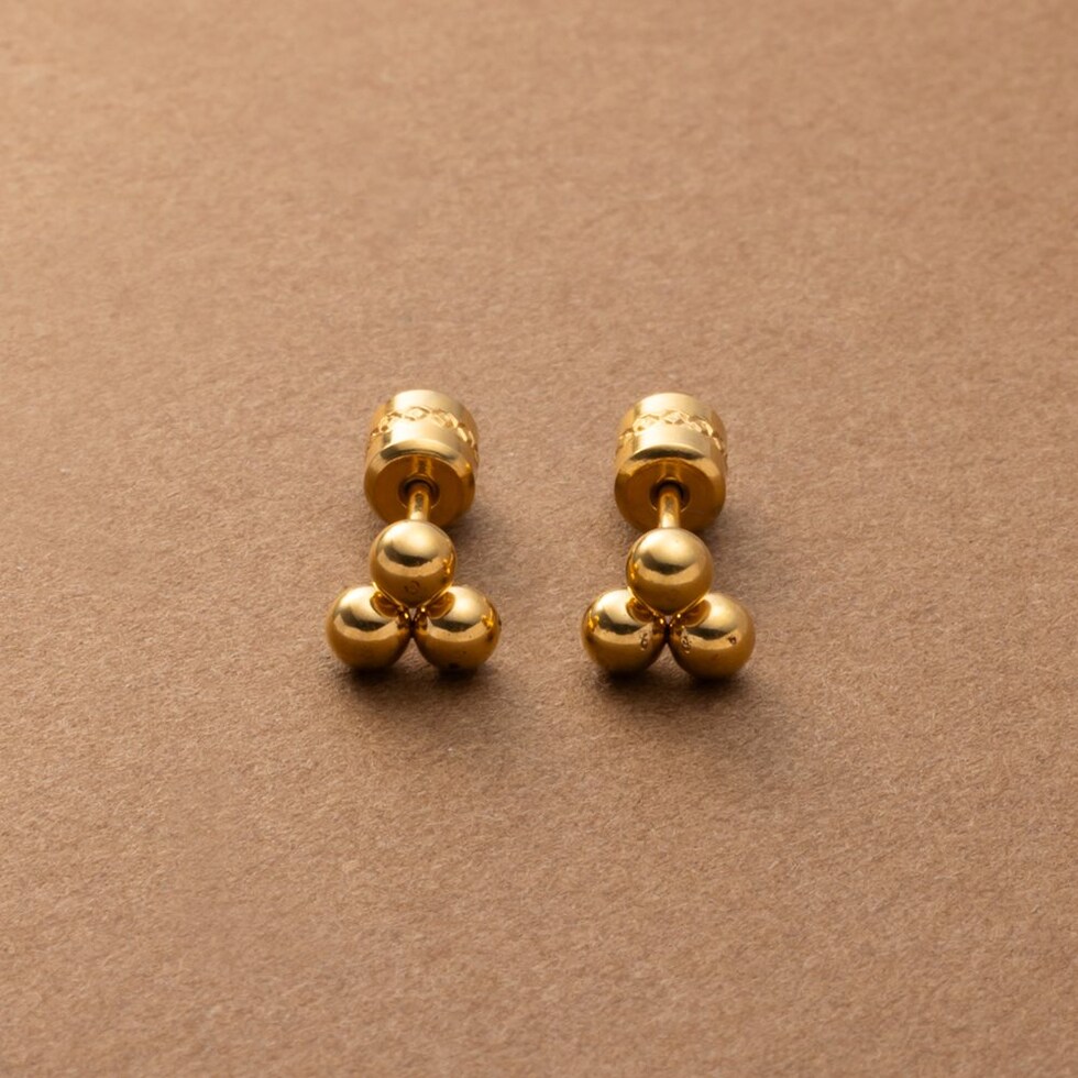 三角ボールのステンレス製ネジロック式ピアス。極小ボールを三角形に並べた。とっても華奢で繊細な粒々としたフォルムがどこかリュクスな印象。ネジロック式のキャッチ部分に埋め込んだ一粒ジルコニアが後ろ姿をさりげなく輝かせる洗練デザインです◎
