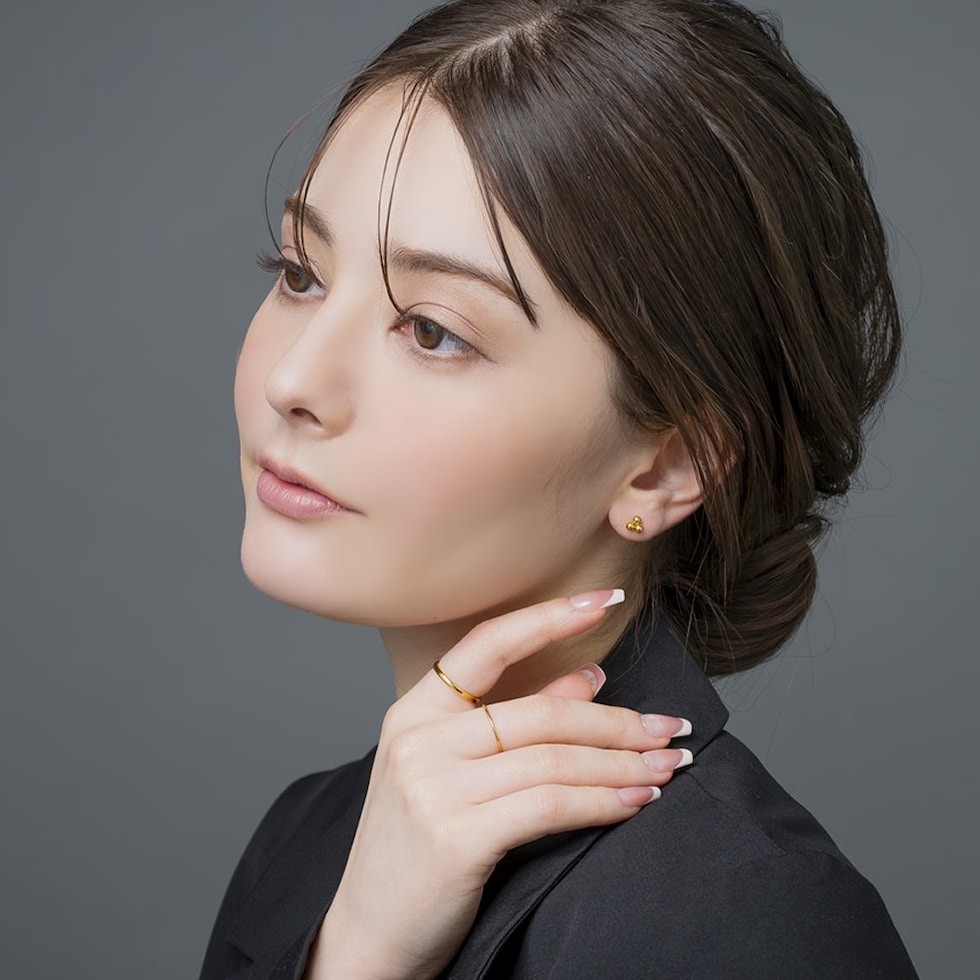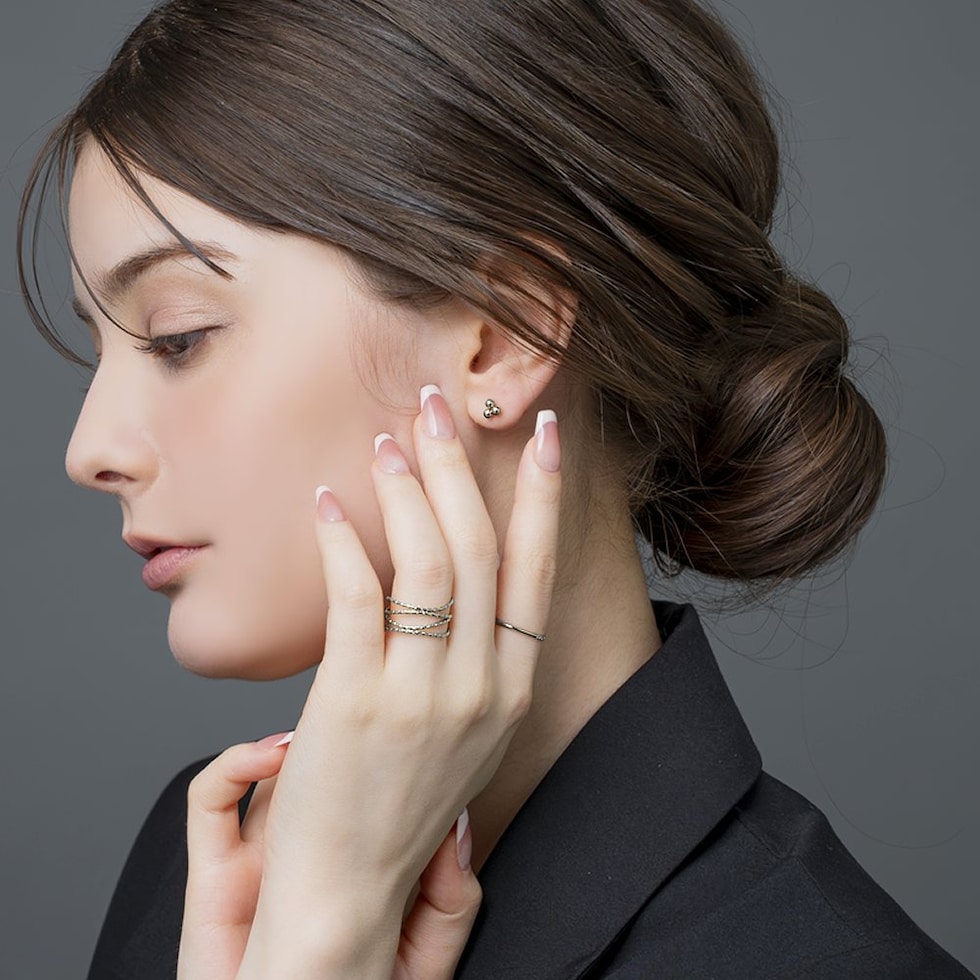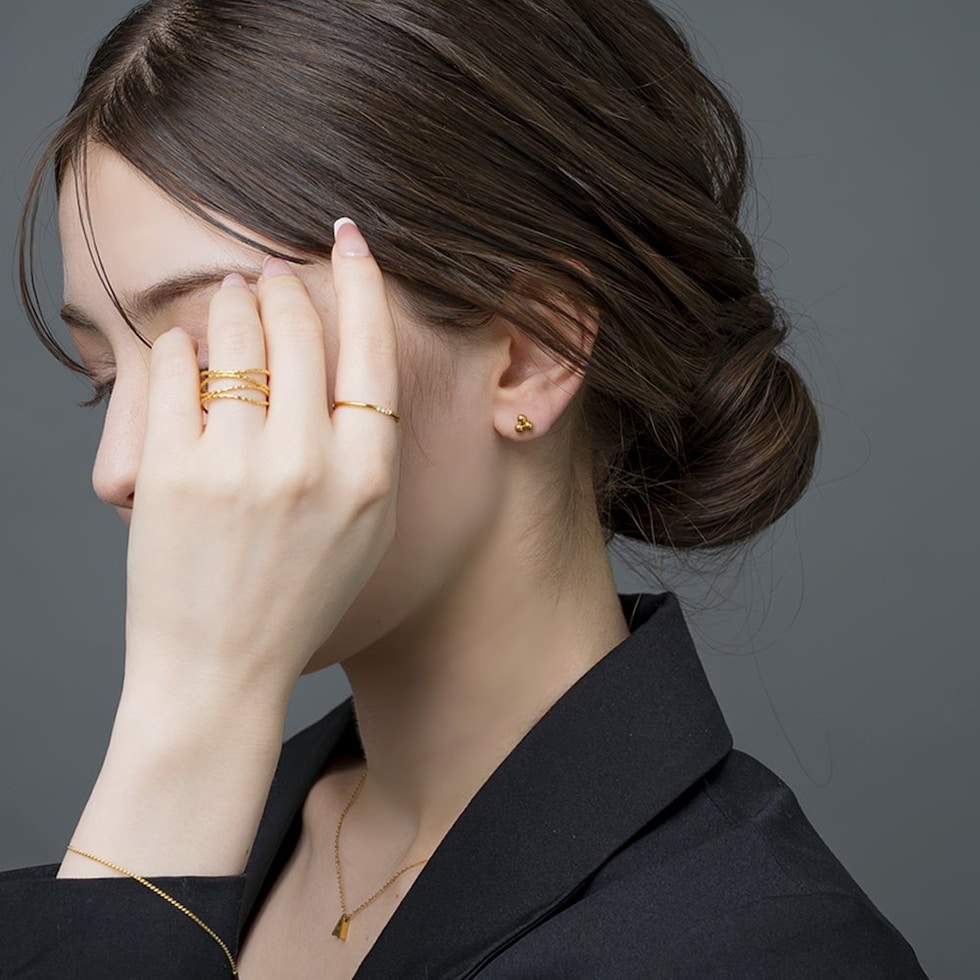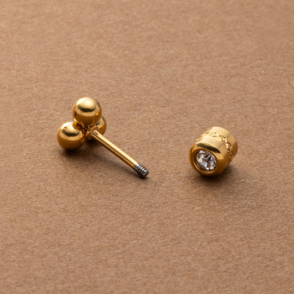 三角ボールのステンレス製ネジロック式ピアス。極小ボールを三角形に並べた。とっても華奢で繊細な粒々としたフォルムがどこかリュクスな印象。ネジロック式のキャッチ部分に埋め込んだ一粒ジルコニアが後ろ姿をさりげなく輝かせる洗練デザインです◎