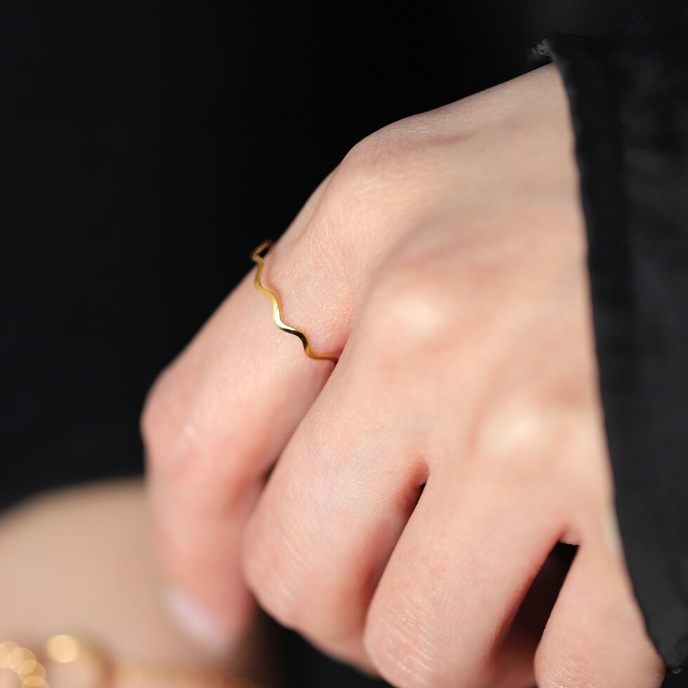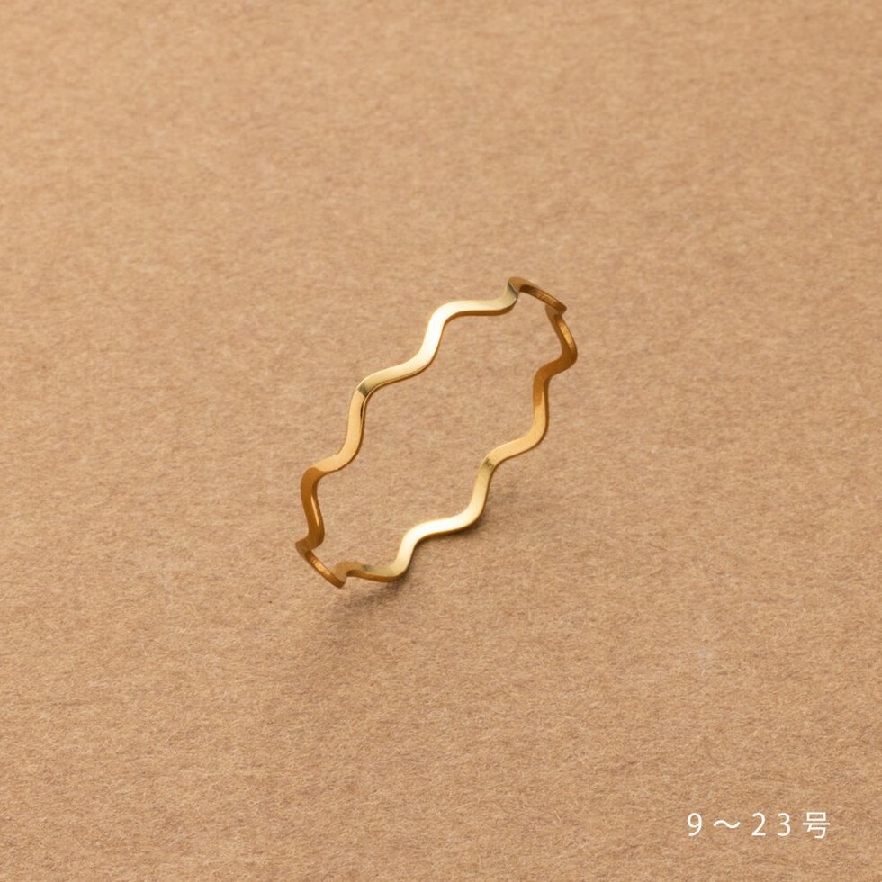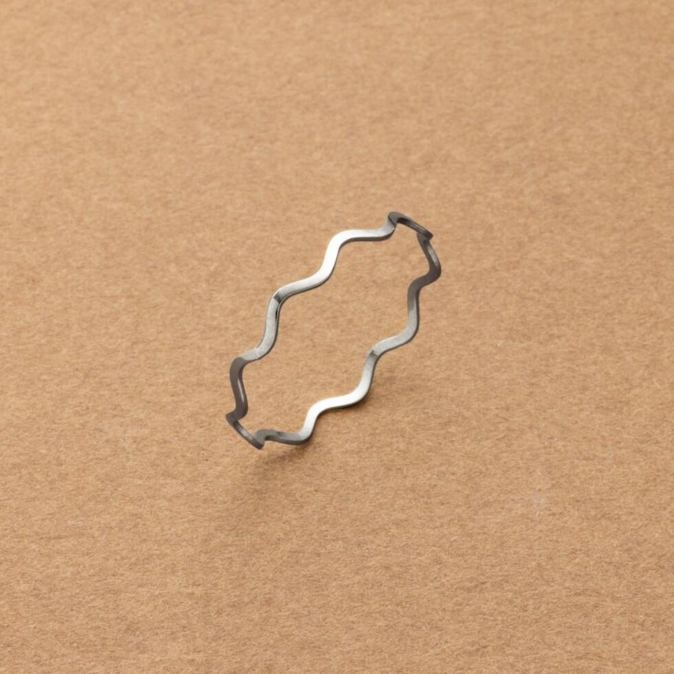 肌にスッと馴染むステンレス製ウェーブリング。緩やかに波打つ華奢なシルエットと、さりげなく艶めくデザインが手元にこなれたアクセントを添えてくれる。錆びにくく傷に強いステンレス製で、他のリングとの重ね付けにもオススメです。