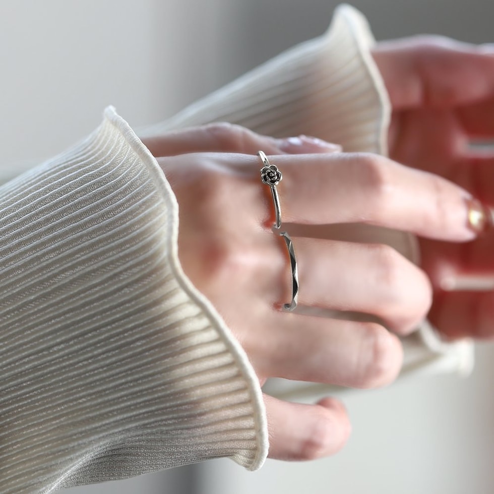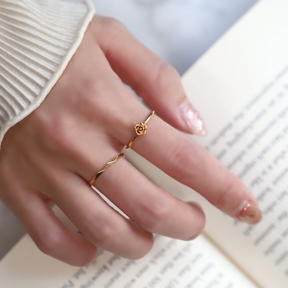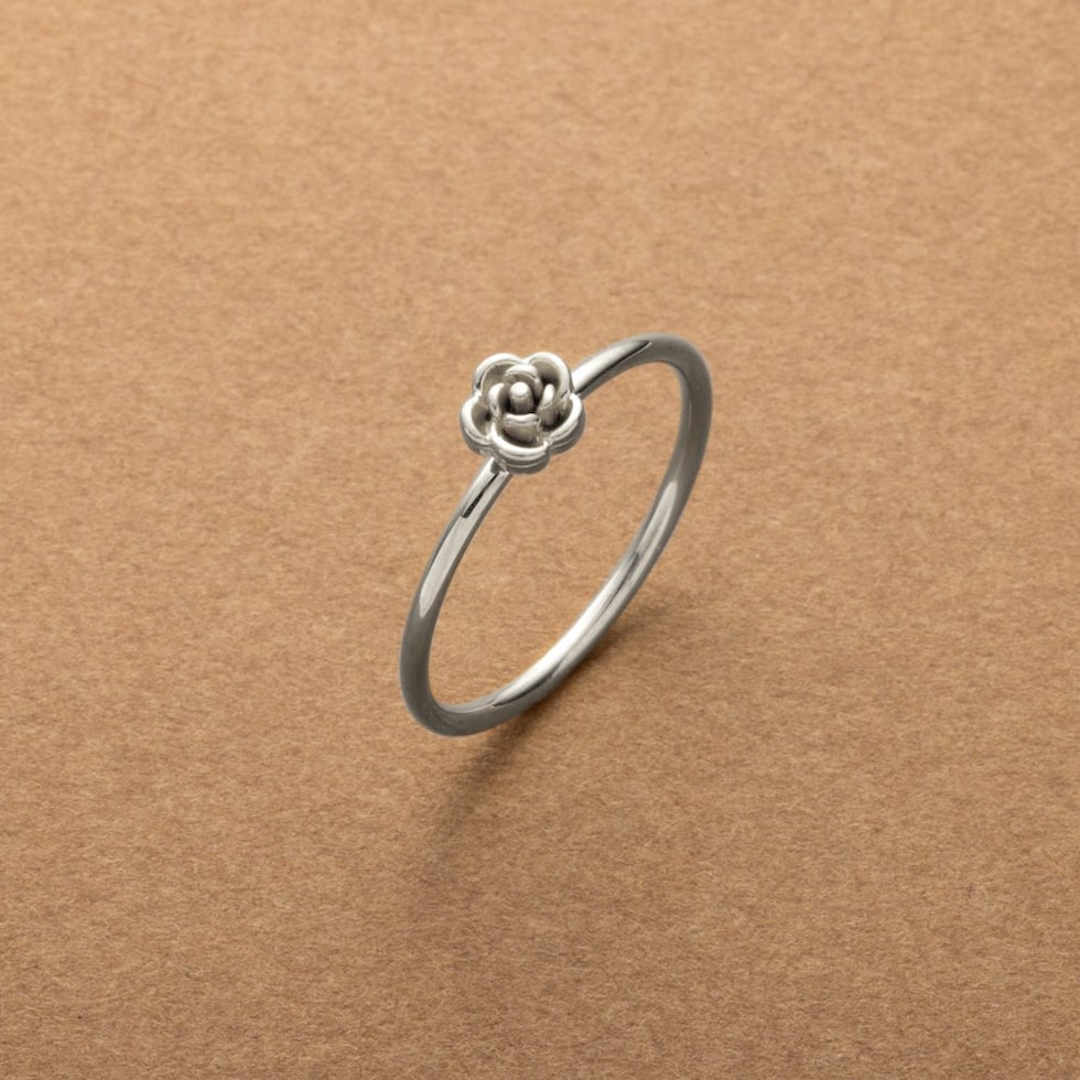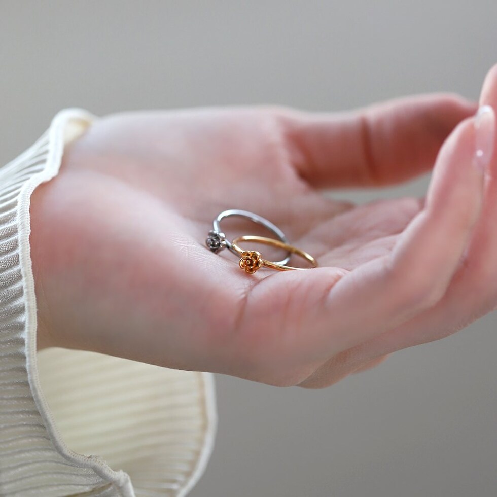 立体感あるローズフラワーの華奢デザインリング。凹凸のあるメタルフラワーが上品に艶めき、甘くなりすぎないデザインで大人の女性にぴったりなアイテム◎錆びにくく傷に強いステンレス製で、デイリーに活躍してくれます。長時間の着用も安心の低アレルギー素材です。