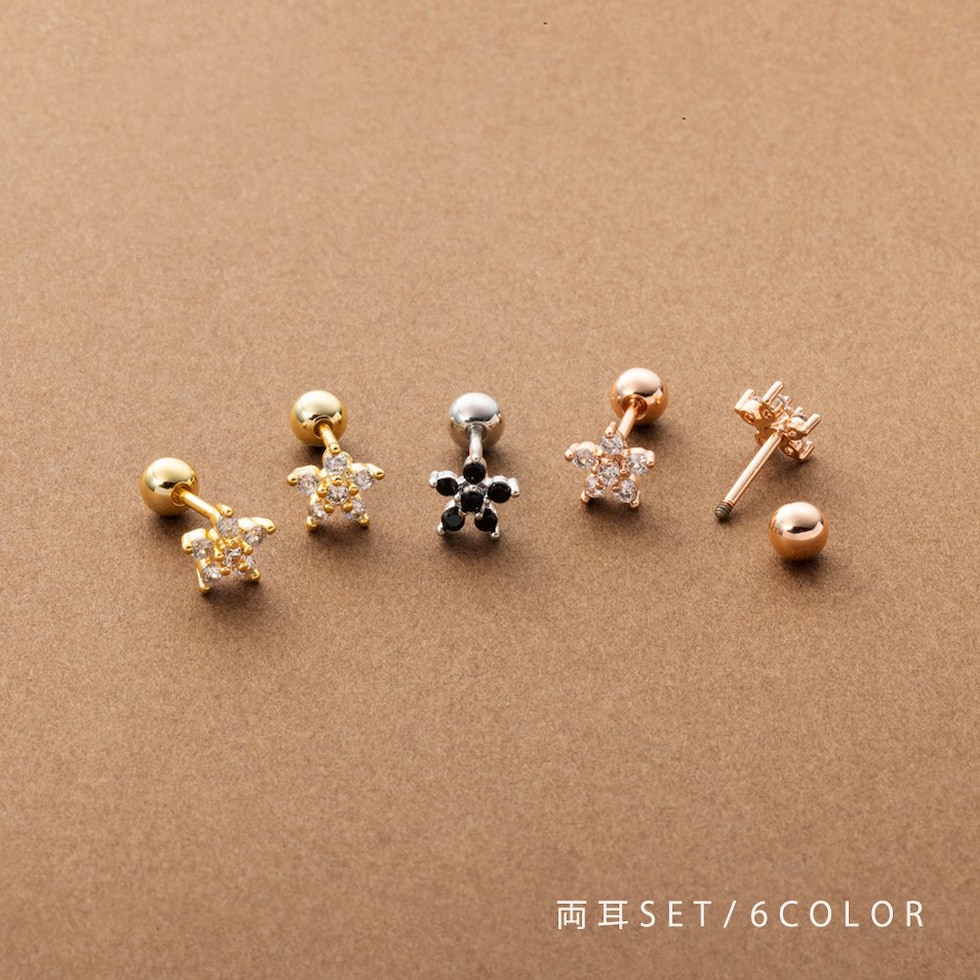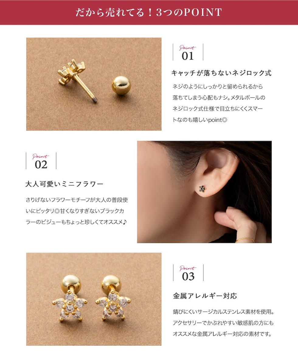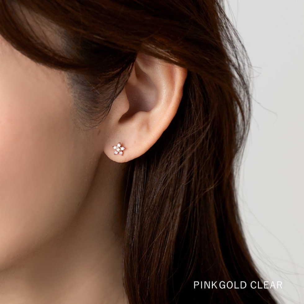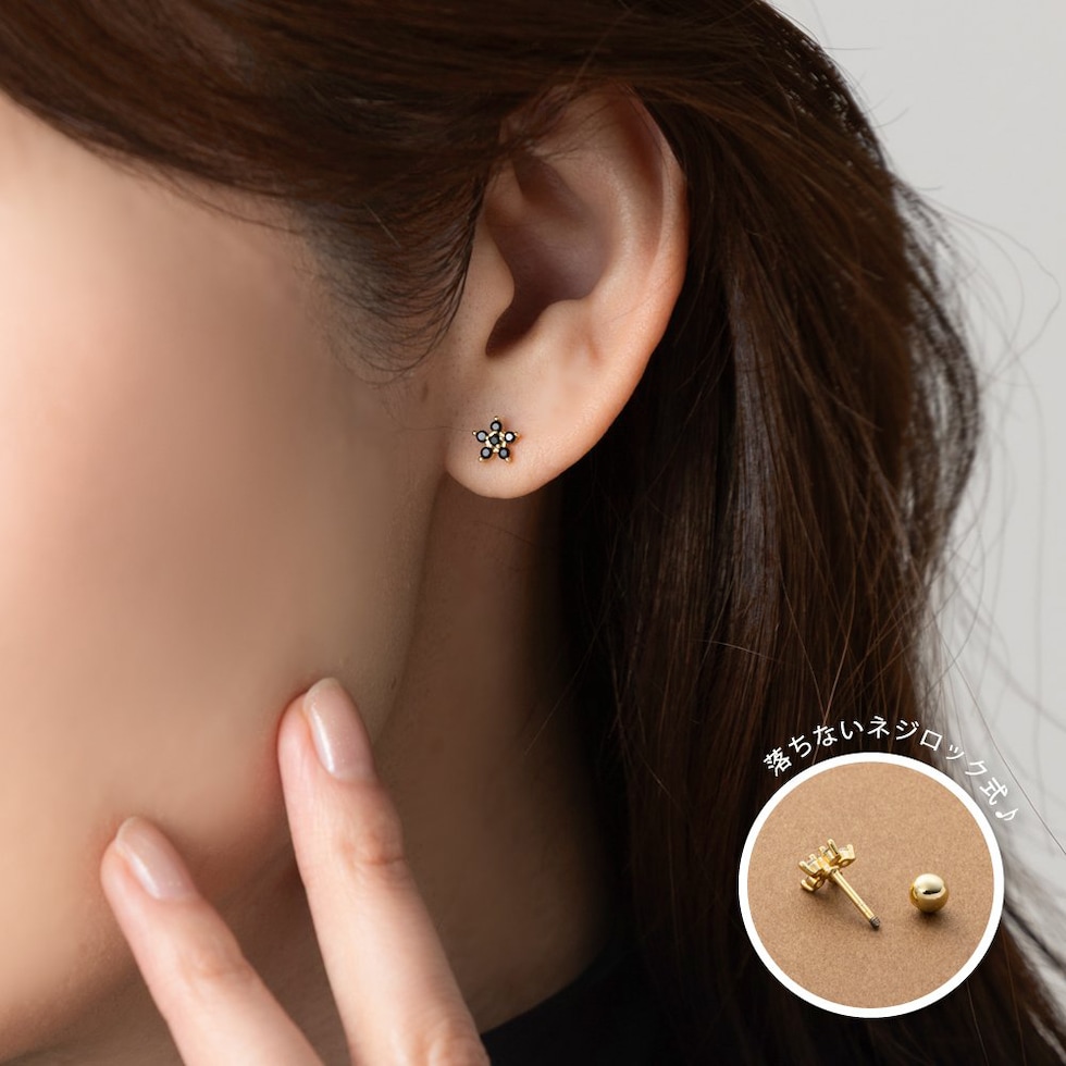 大人可愛いミニフラワーのビジューが煌めくネジロック式スタッドピアス。小粒なメタルボールのキャッチでスマートに着けられるひと品。低アレルギー素材のステンレス製で、デイリーに活躍してくれるアイテムです。