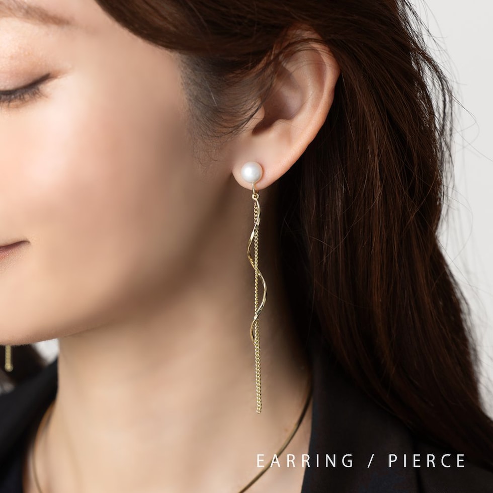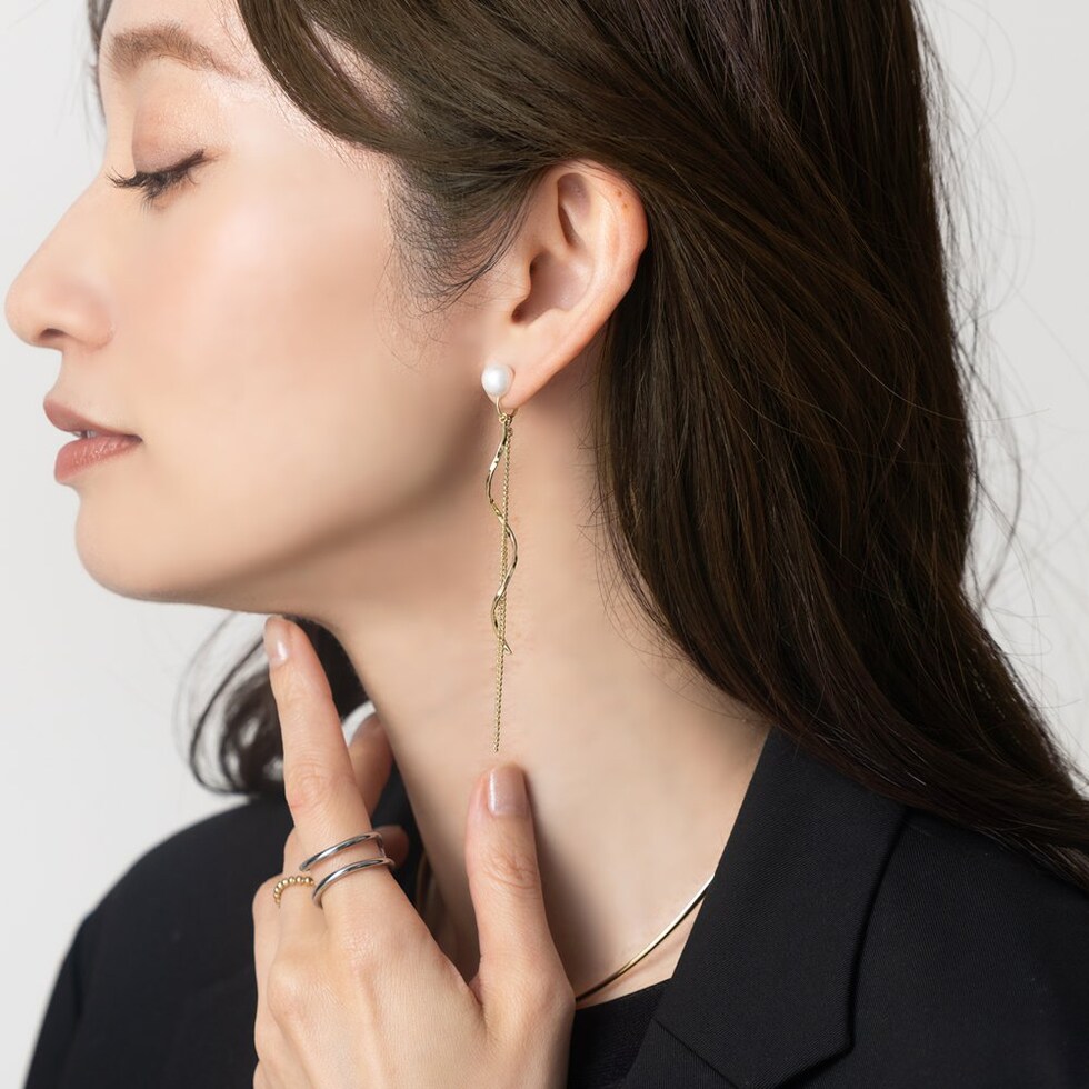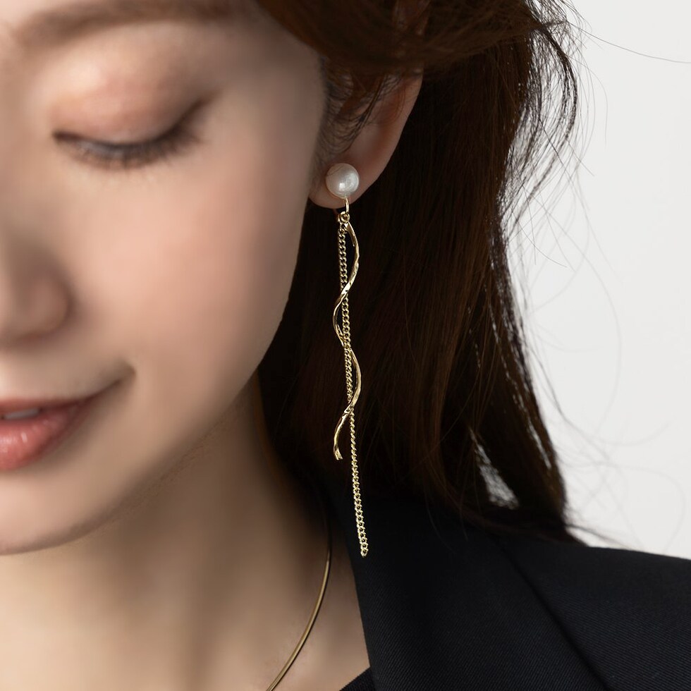 艶めくパールにウェーブラインメタルとチェーンを合わせたイヤリング/ピアス。動くたびに揺らめくチェーンがスタイリングのアクセントに◎イヤリングはシリコンキャッチ付き&調整可能な金具で、ピアスのようにすっきり見えるのがポイント◎ピアスのポスト部分には、低アレルギーのSILVER925を使用しているので、長時間の着用も安心です。