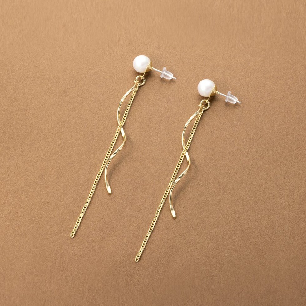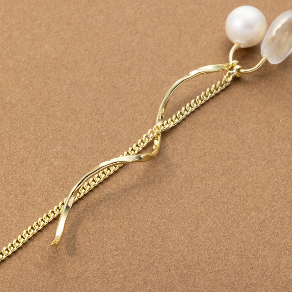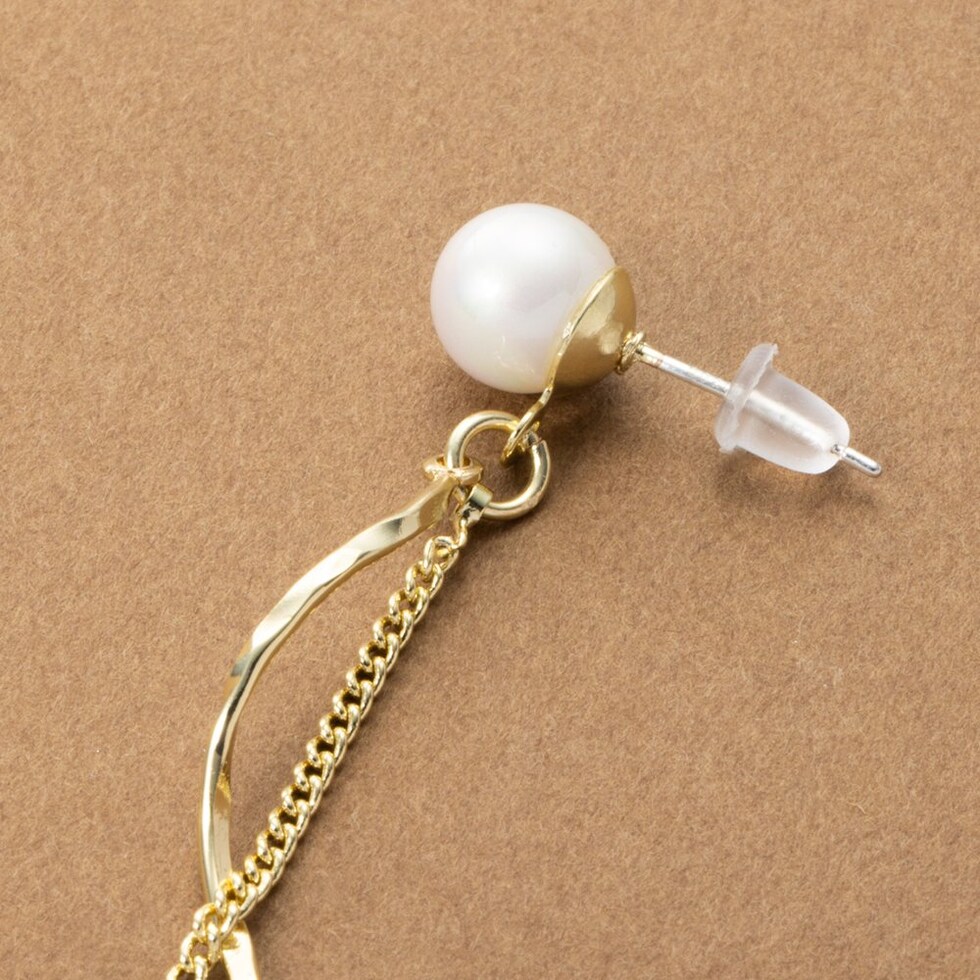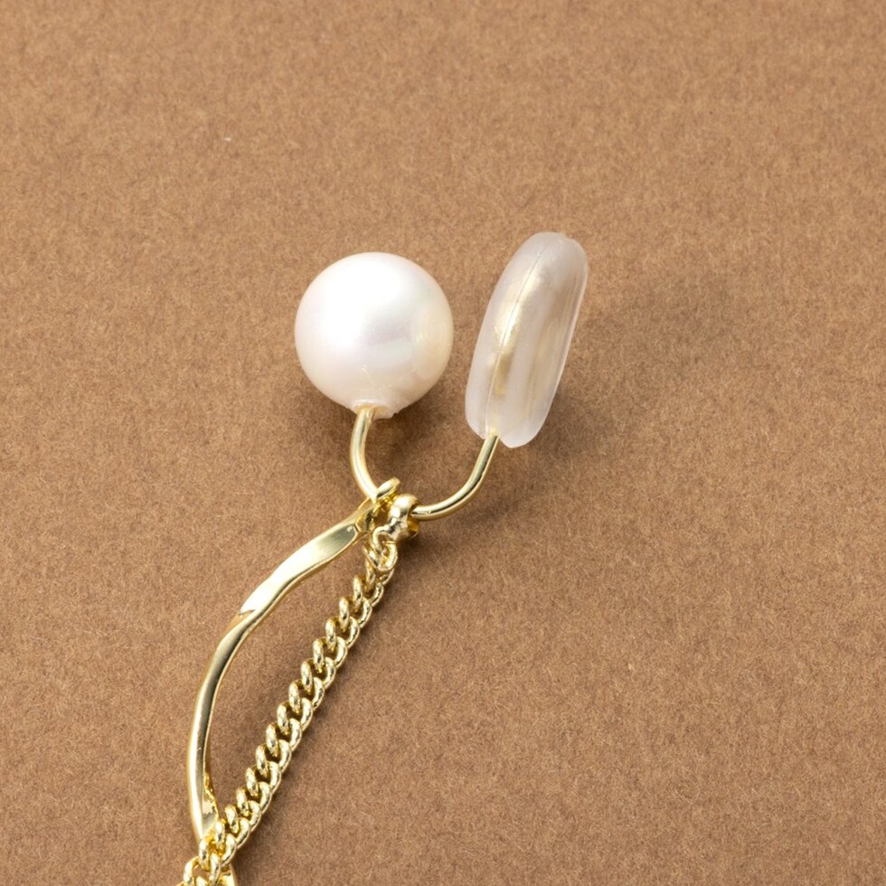 艶めくパールにウェーブラインメタルとチェーンを合わせたイヤリング/ピアス。動くたびに揺らめくチェーンがスタイリングのアクセントに◎イヤリングはシリコンキャッチ付き&調整可能な金具で、ピアスのようにすっきり見えるのがポイント◎ピアスのポスト部分には、低アレルギーのSILVER925を使用しているので、長時間の着用も安心です。