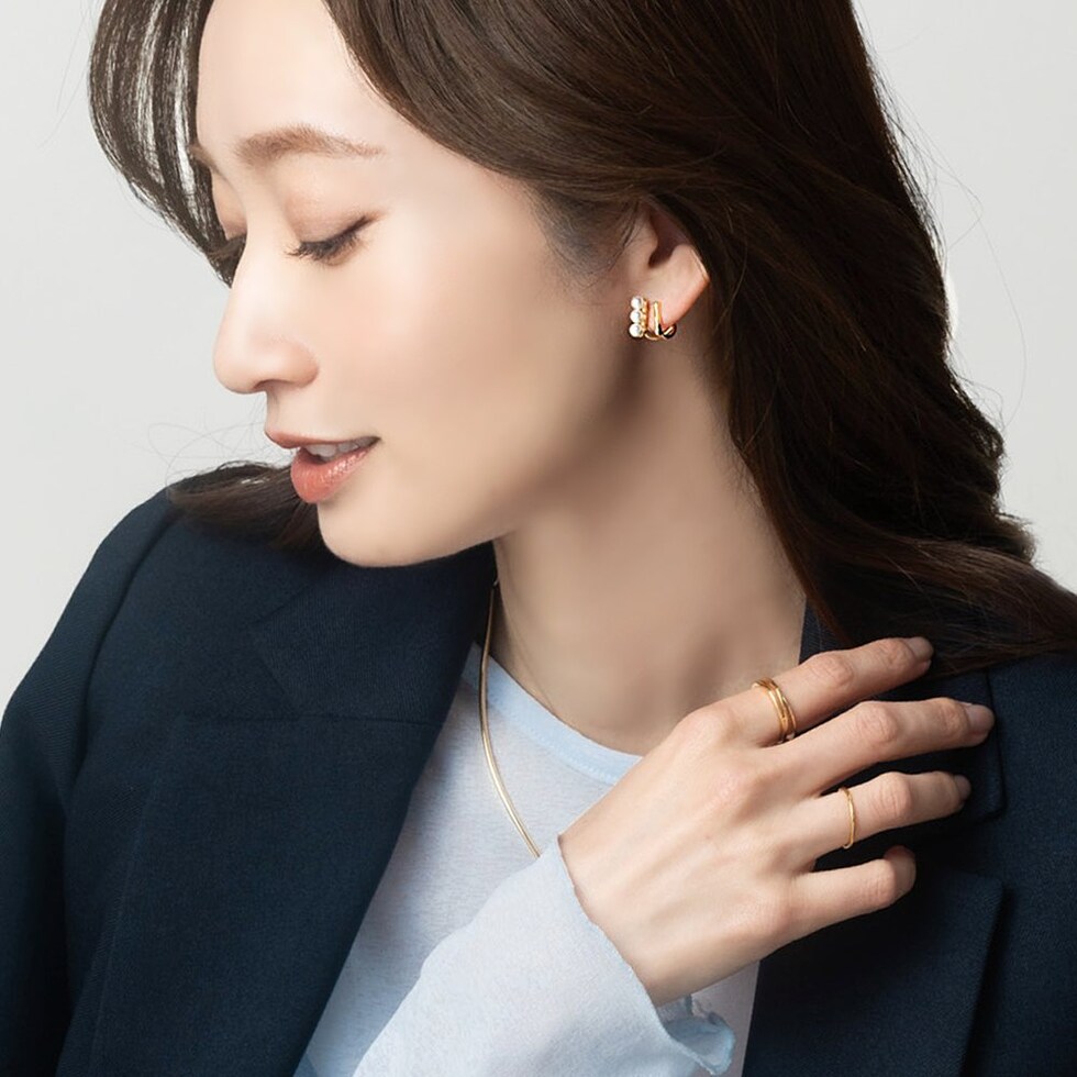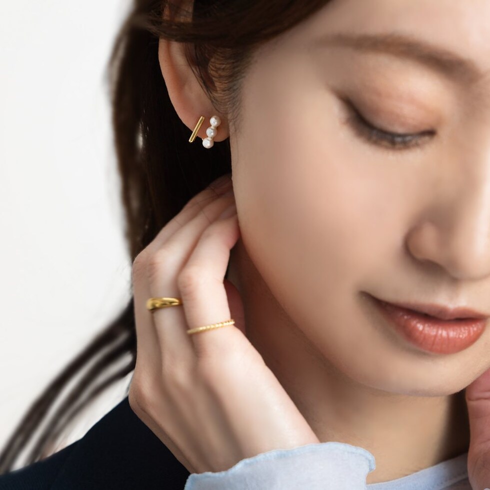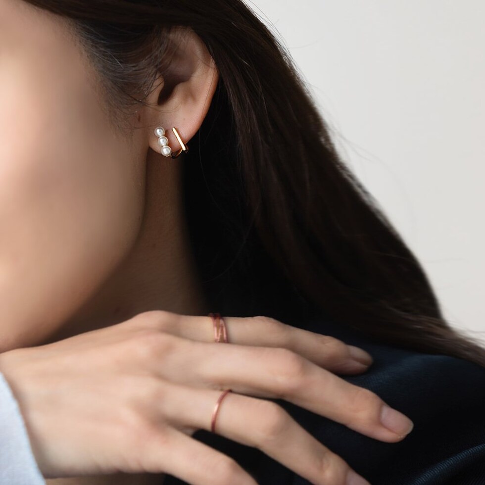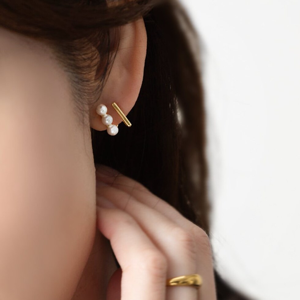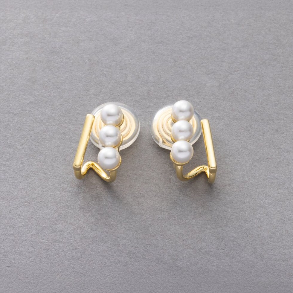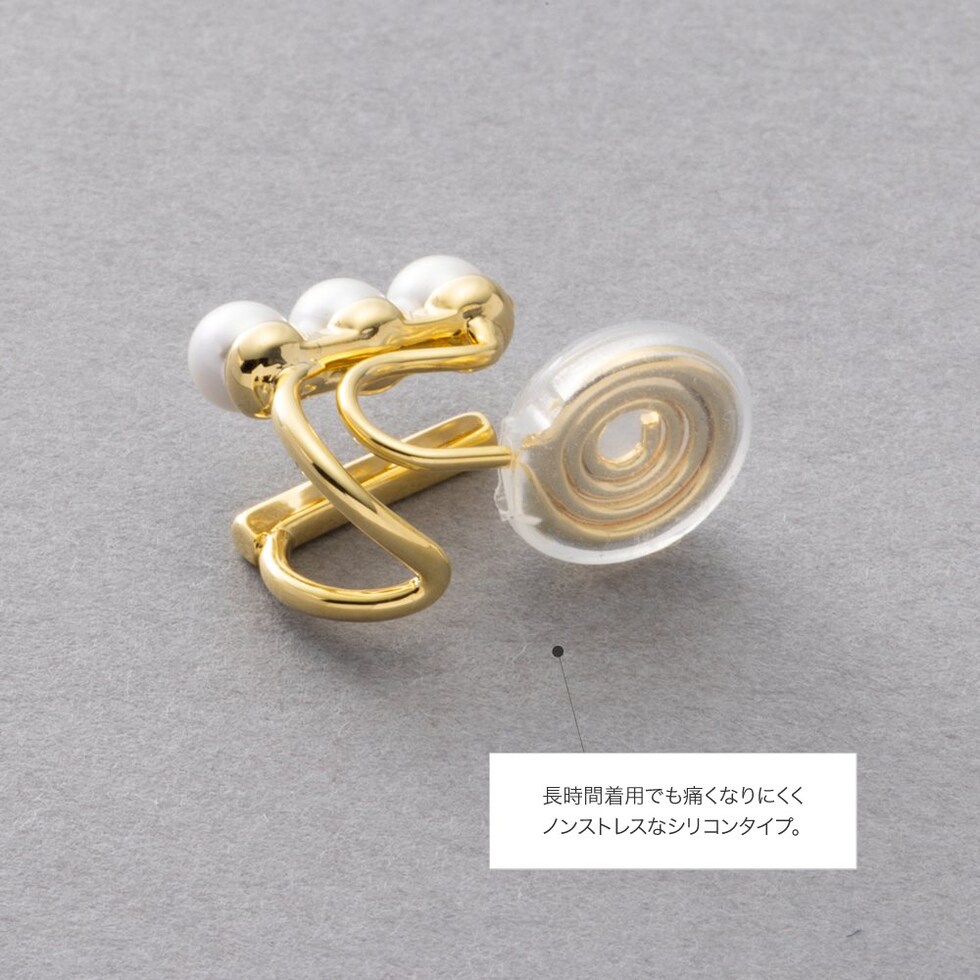 上品な3連パールが艶めくワイヤーフィットイヤリング。さりげなくもアクセントになるデザインが大人に似合うひと品。シリコンキャッチ付き&調整可能なイヤリング金具で、長時間の着用も痛くなりにくく快適です◎