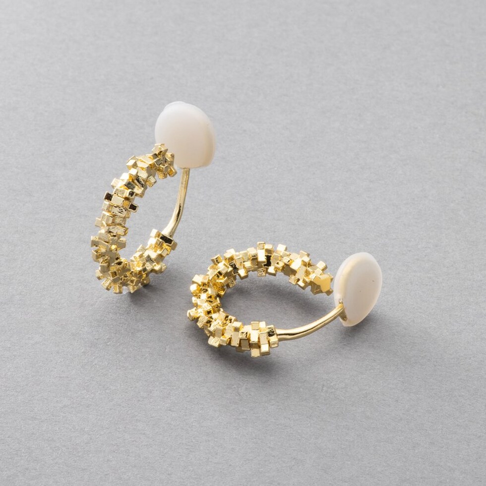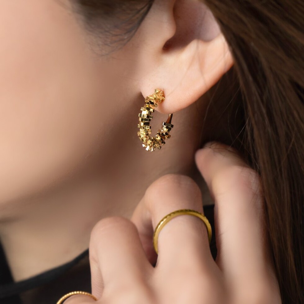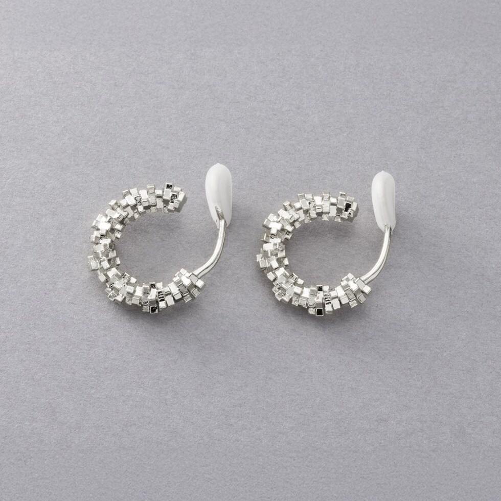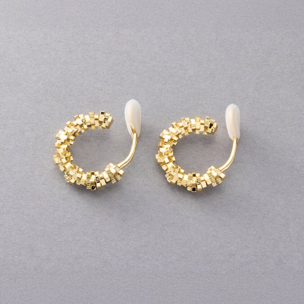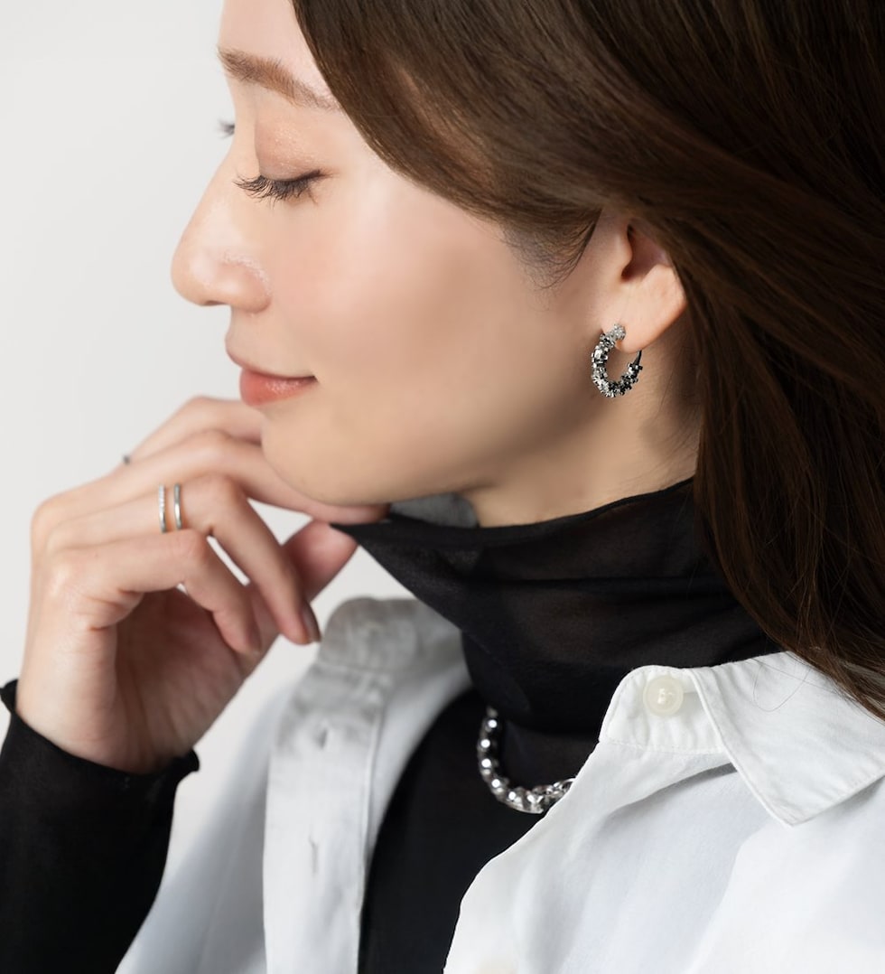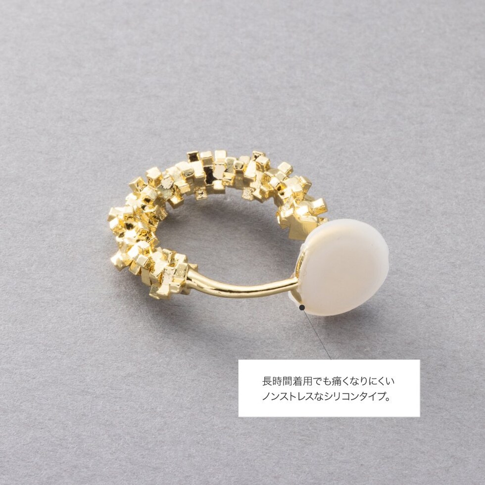 フープデザインのワイヤーフィットイヤリング。凹凸のあるデザインでキラキラとシャープな輝きを放ち、スタイリングのアクセントに◎シンプルに見えてひとひねりある大人っぽいデザインです。シリコンキャッチ付き&調整可能なイヤリング金具でピアスのようにすっきり見えるのがポイント。長時間の着用も痛くなりにくく快適です。