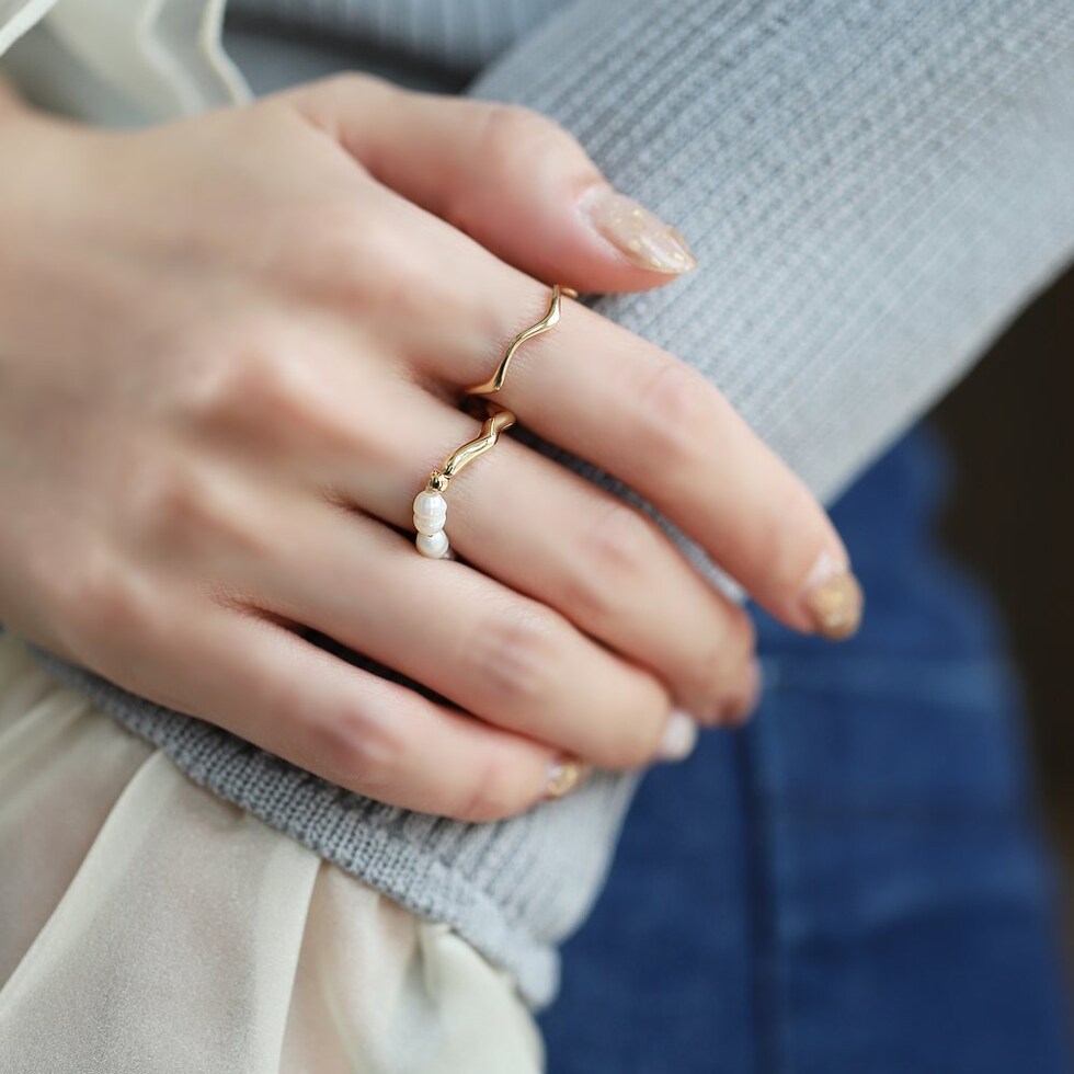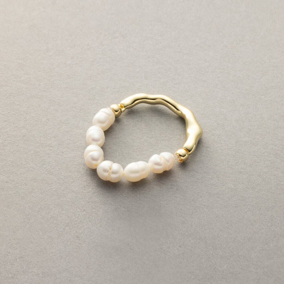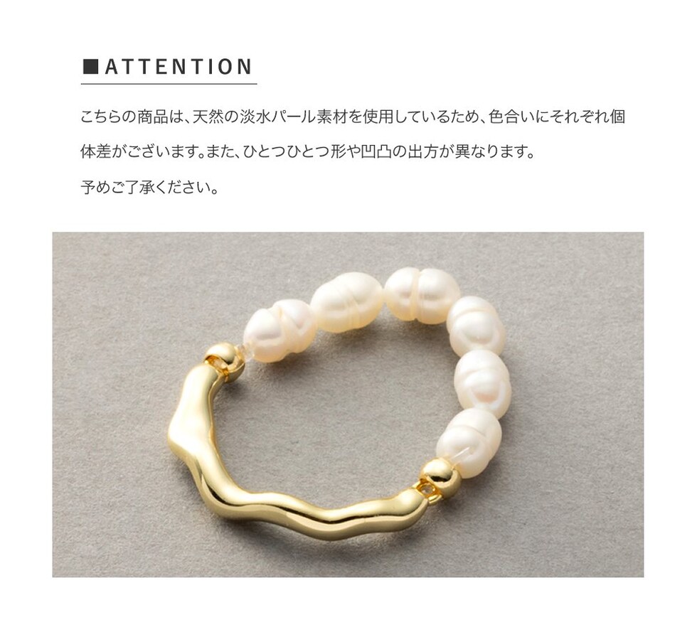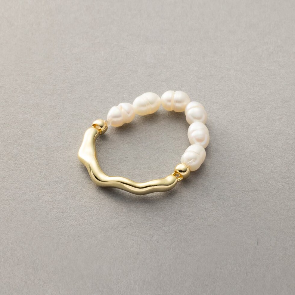 ナチュラルに艶めく淡水パールとクラフト感ある歪なハーフメタルを組み合わせたデザインリング。メタル部分が見えるように着用しても、また違った雰囲気をお楽しみいただけます◎歪な形の艶やかな淡水パールが手元のアクセントとして、さりげなくスタイリングを引き立てます。