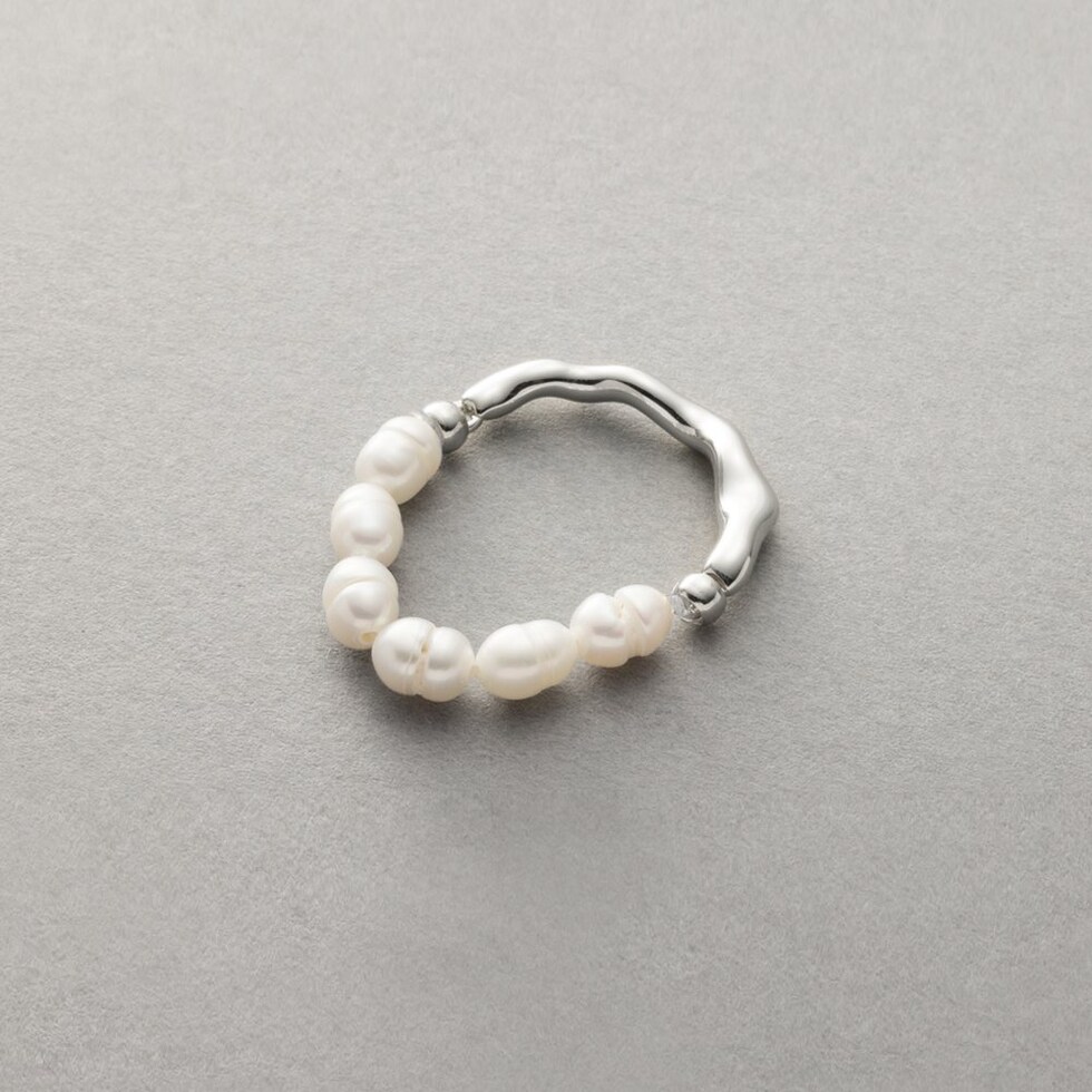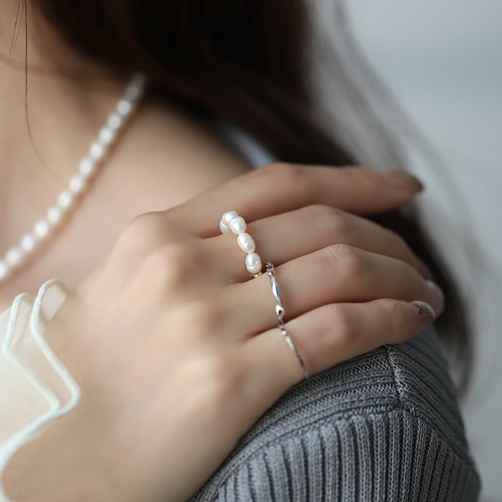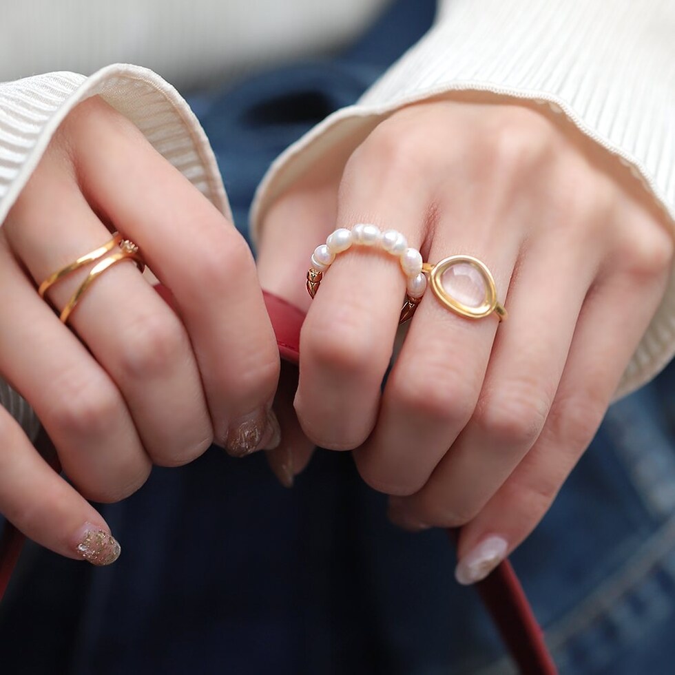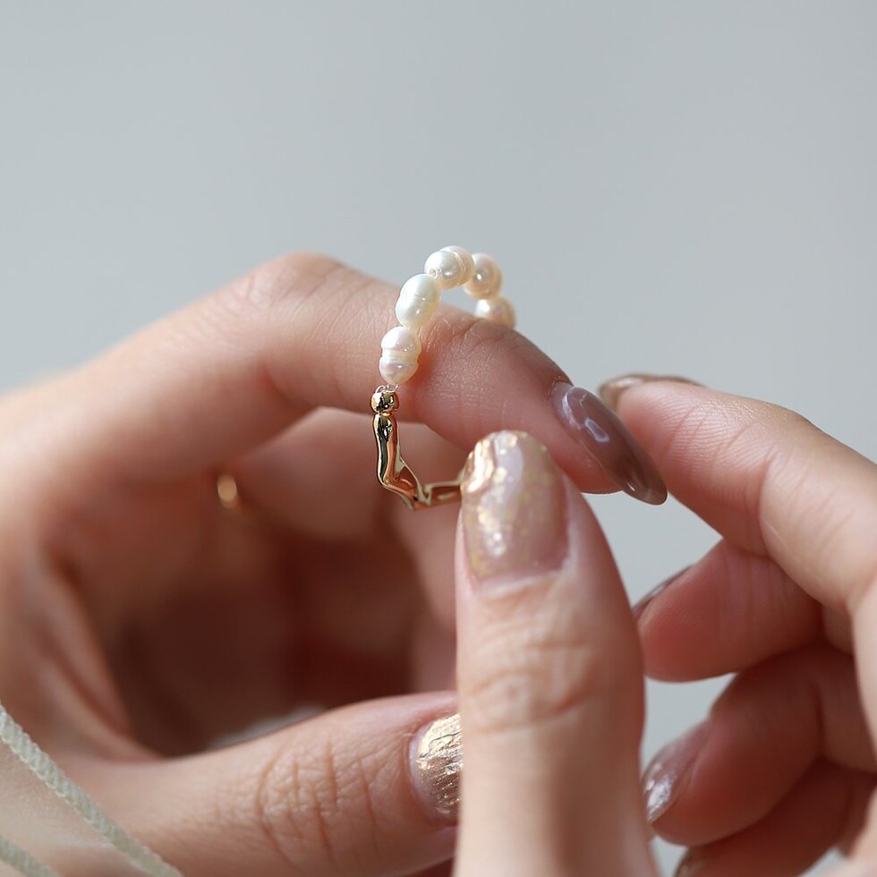 ナチュラルに艶めく淡水パールとクラフト感ある歪なハーフメタルを組み合わせたデザインリング。メタル部分が見えるように着用しても、また違った雰囲気をお楽しみいただけます◎歪な形の艶やかな淡水パールが手元のアクセントとして、さりげなくスタイリングを引き立てます。