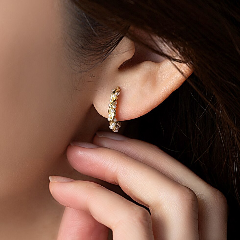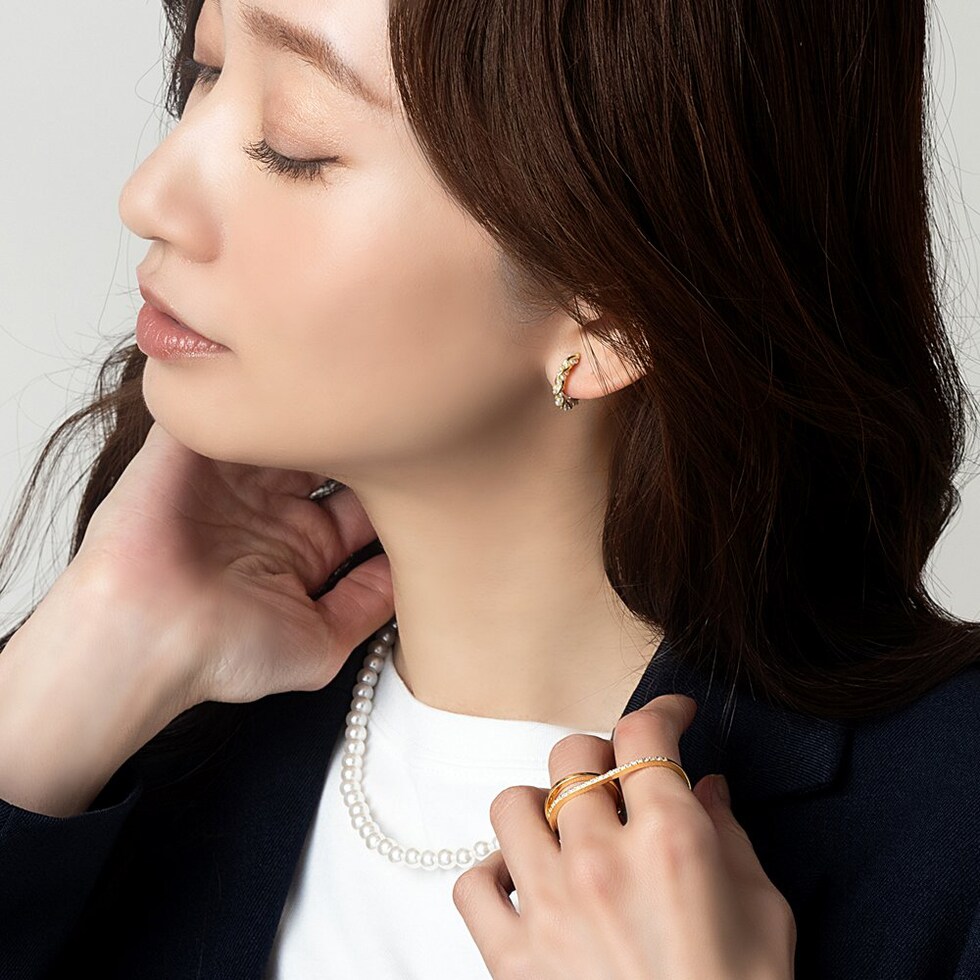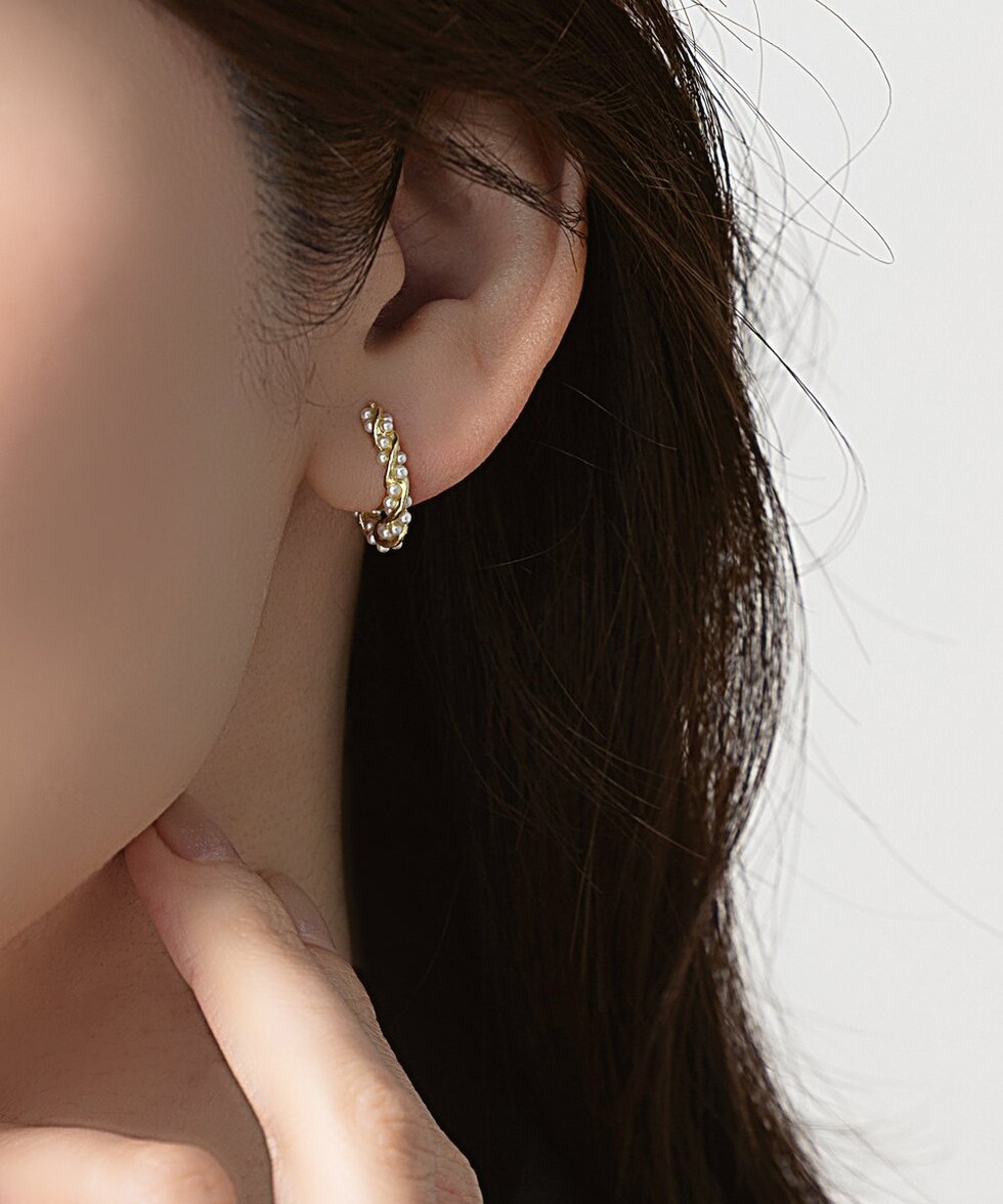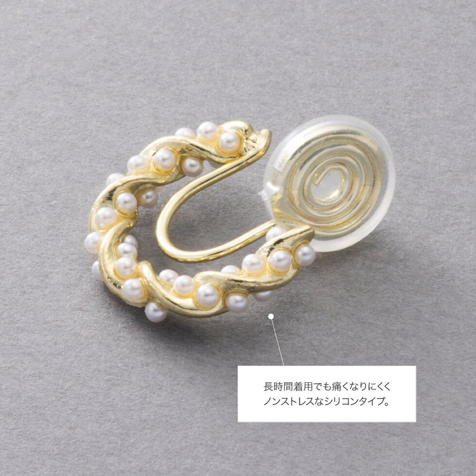パールとメタルをツイストした華やかなワイヤーフィットイヤリング。デイリーにも取り入れやすい程よいサイジングと品よく見えるデザインが大人に似合うひと品。シリコンキャッチ付き&調整可能なイヤリング金具で、長時間の着用も痛くなりにくく快適です◎