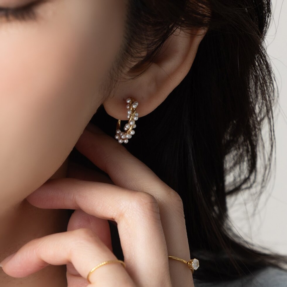 パールとメタルをツイストした華やかなワイヤーフィットイヤリング。デイリーからお呼ばれ・卒入園まで様々なシーンで活躍します◎シリコンキャッチ付き&調整可能なイヤリング金具でピアスのようにすっきり見えるのがポイント。長時間の着用も痛くなりにくく快適です。