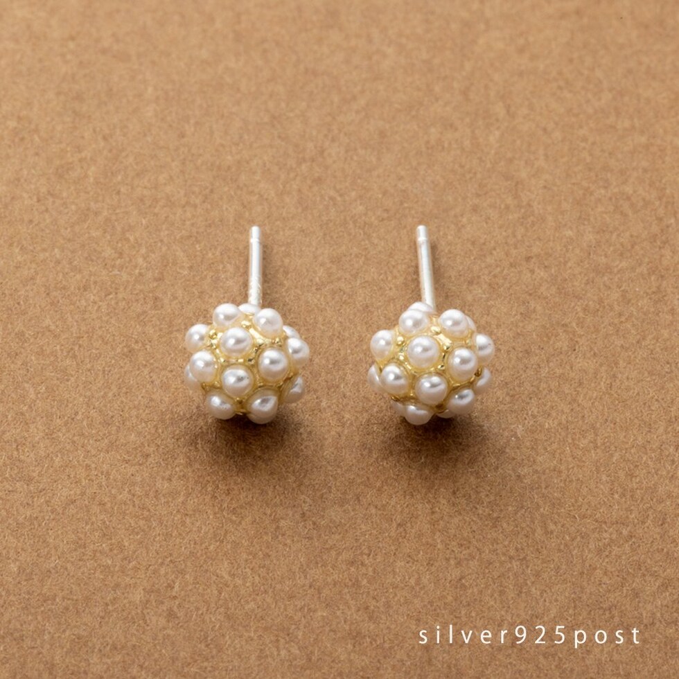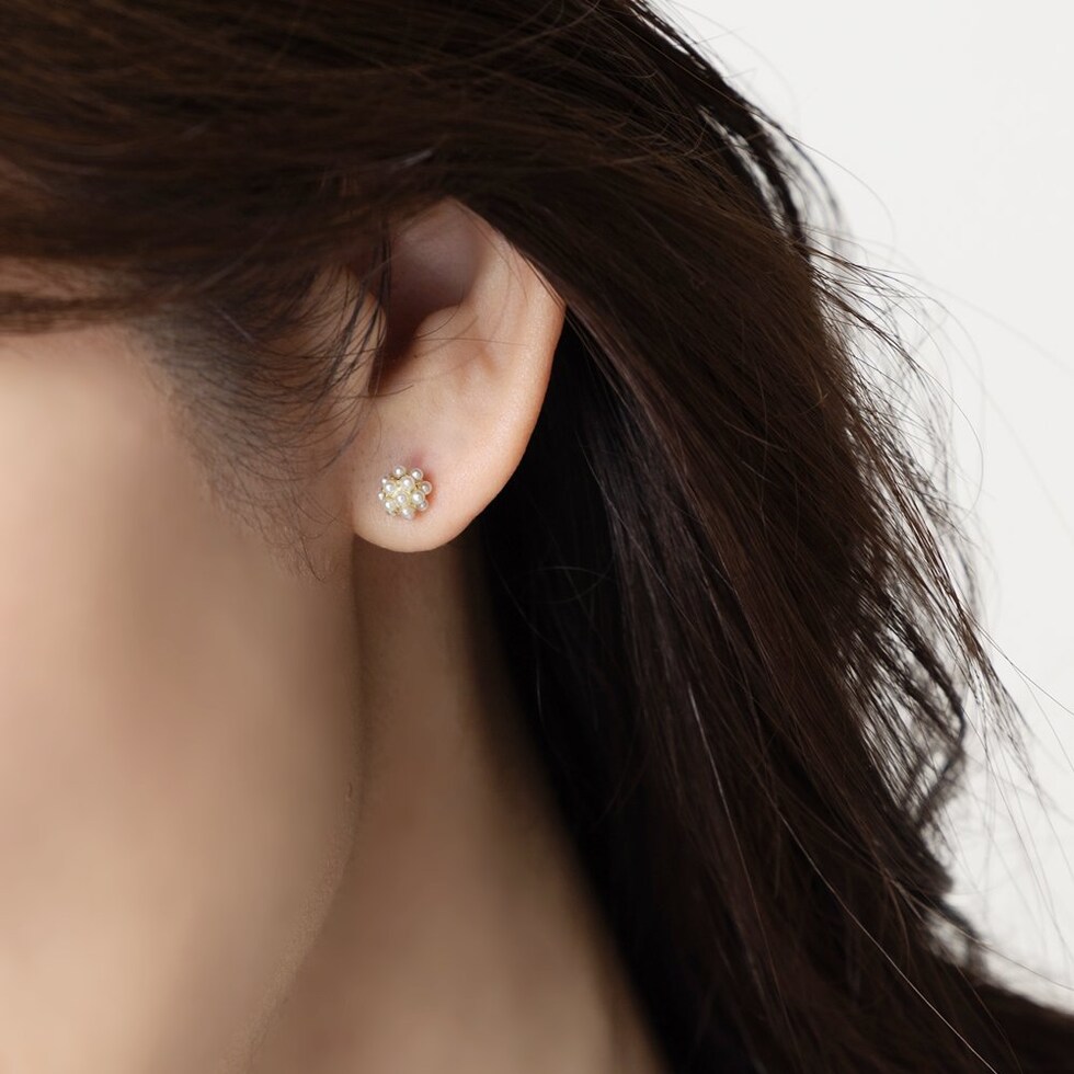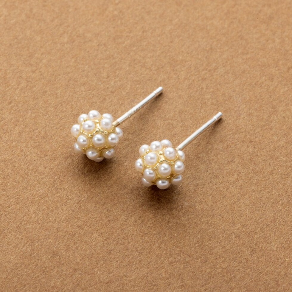 ミニマムパールの華やぎパヴェピアス。ゴールドカラーのメタルボールに極小パールを埋め込んだ粒々としたパヴェデザインで、華奢ながらもさりげなく華やいでお顔周りを明るく飾ってくれます。