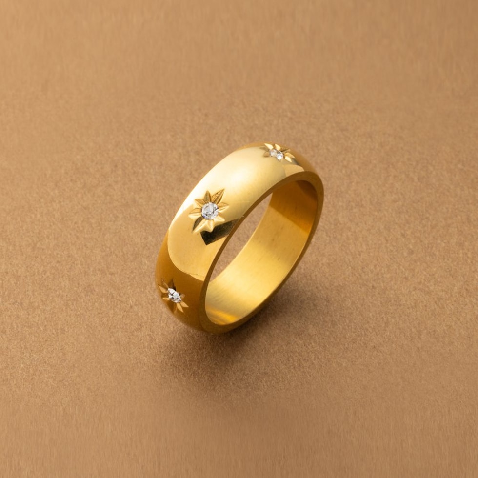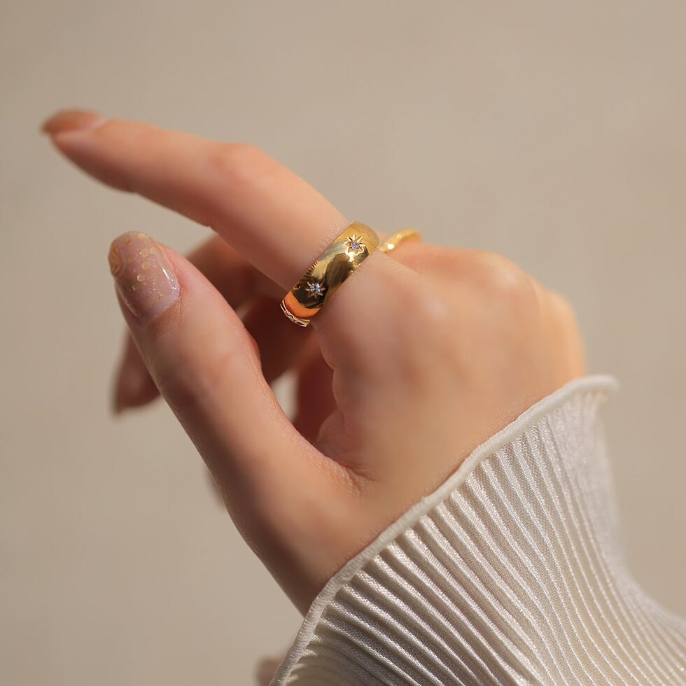 着け心地の良い太めの甲丸リングにスターストーンを配したデザインリング。煌めくビジューと存在感あるシルエットが手元のアクセントに◎錆びにくく傷に強いステンレス製で、デイリーに活躍してくれます。長時間の着用も安心の低アレルギー素材です。