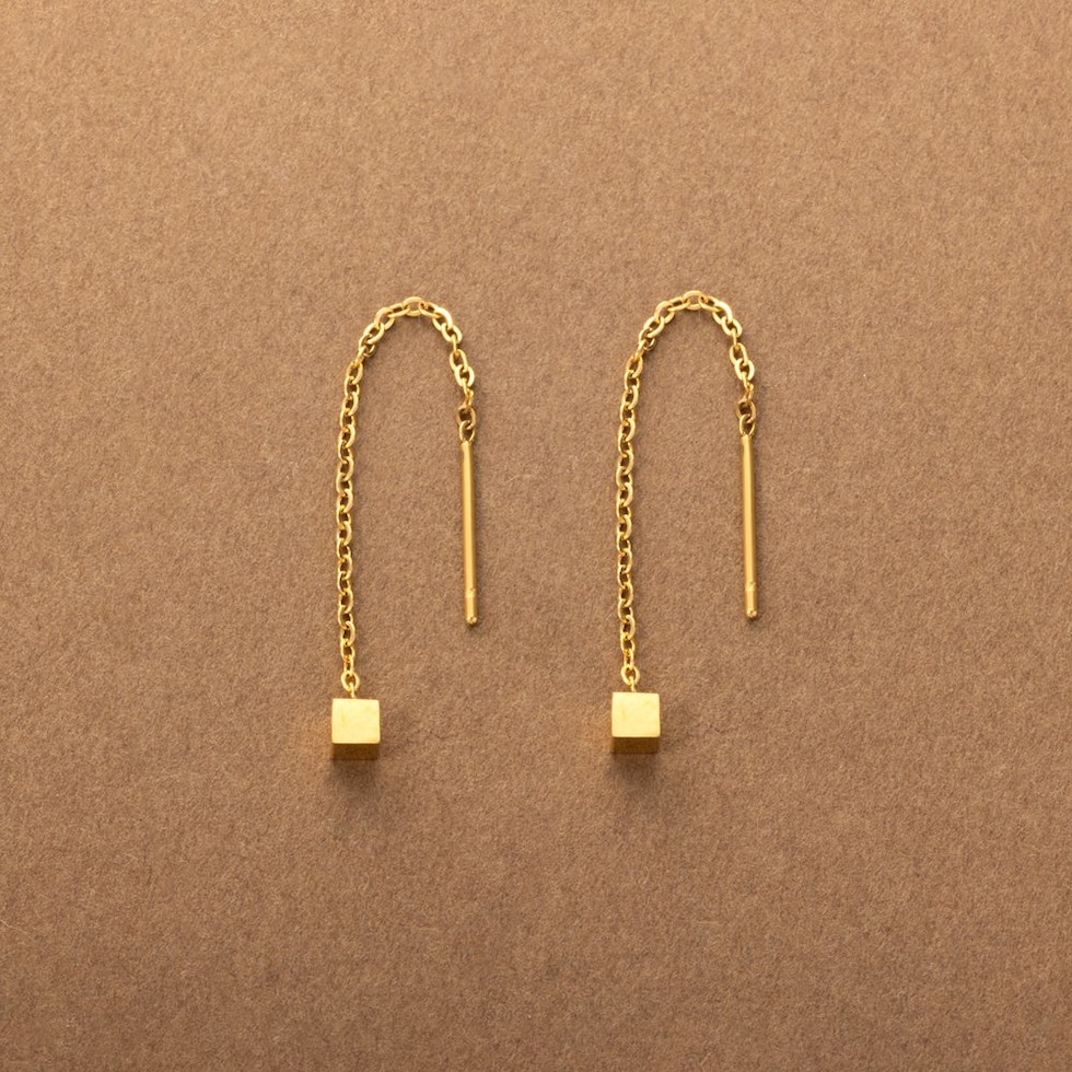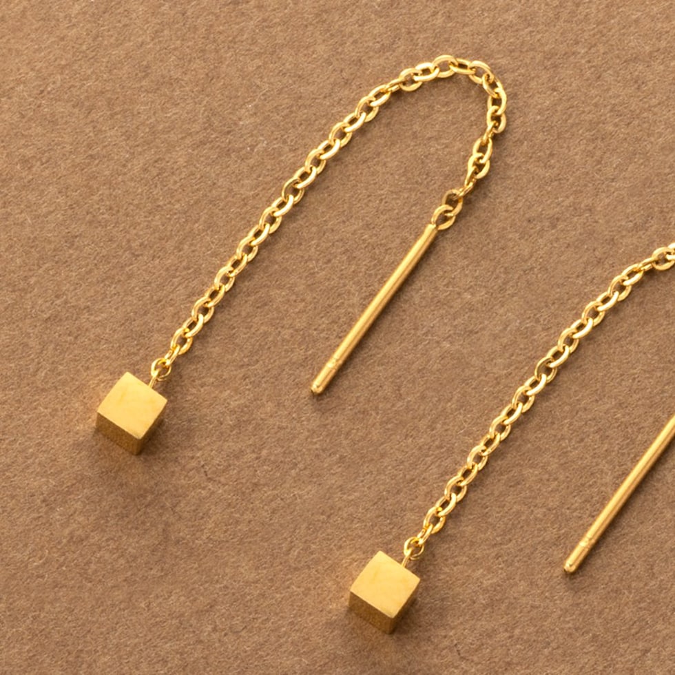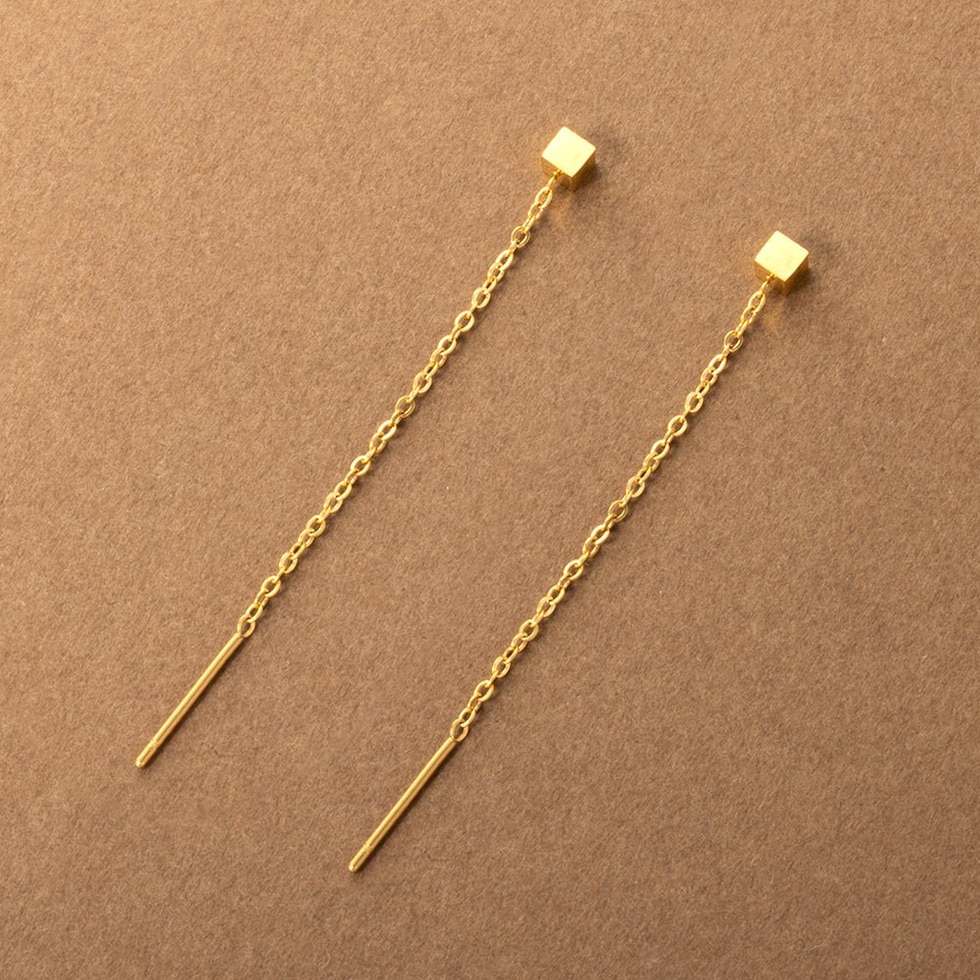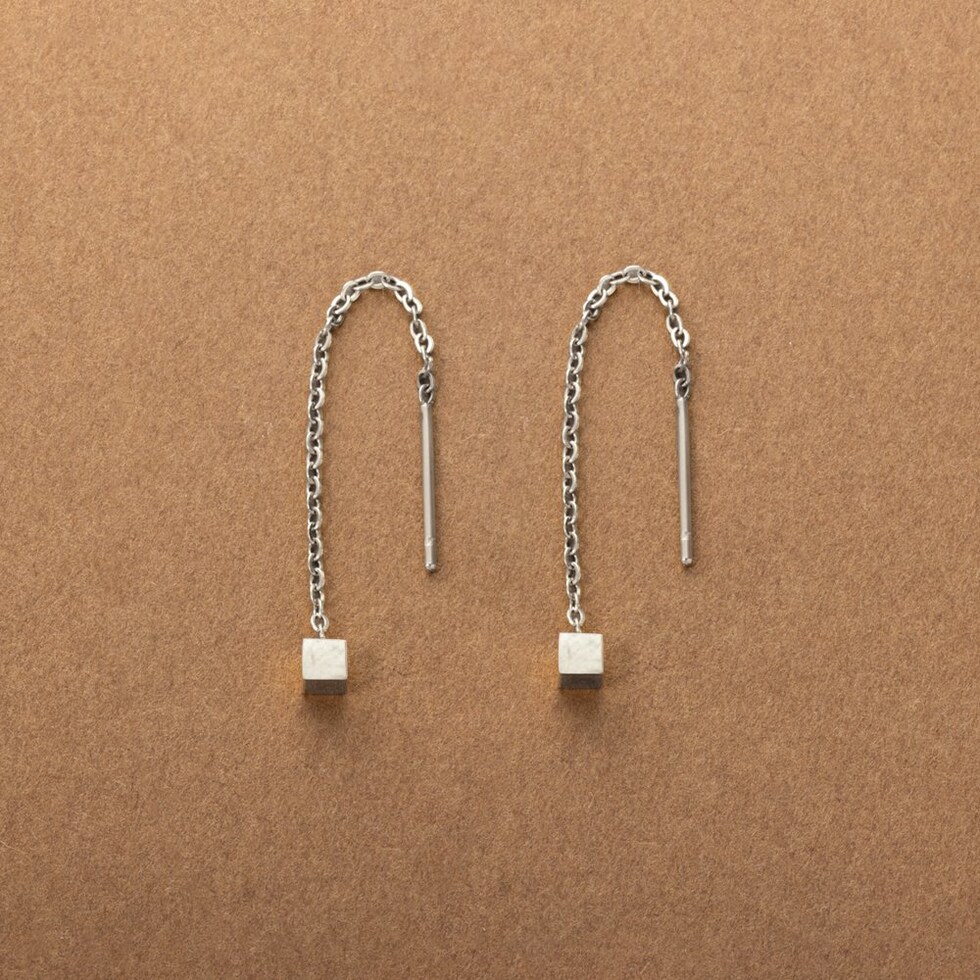 メタルキューブのステンレス製アメリカンピアス。ミディアム丈の絶妙な華奢感がバツグンに上品でセンスあり◎細かく長さ調節できるアメリカンピアスで、あなたのフェイスラインに合わせてこだわりのサイズ感を楽しんで。