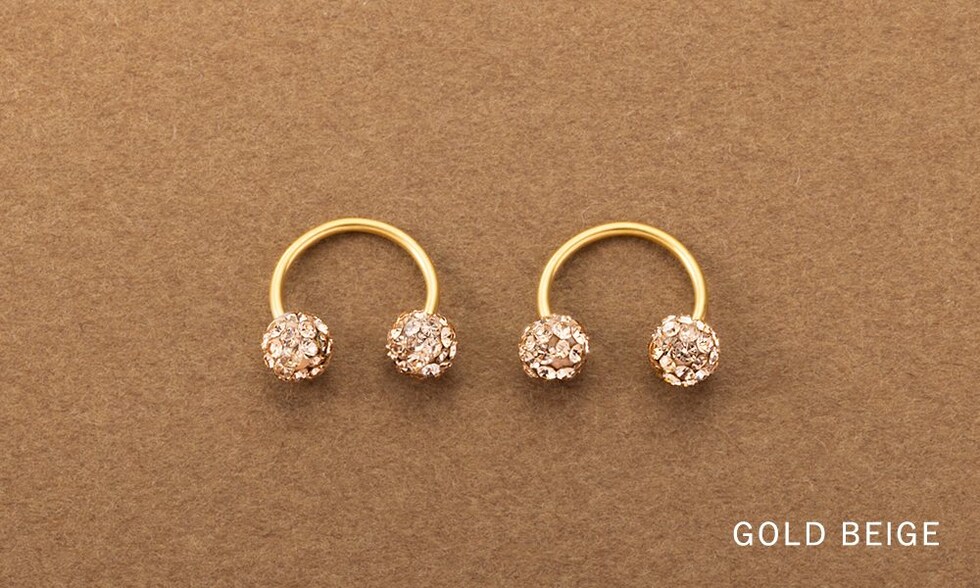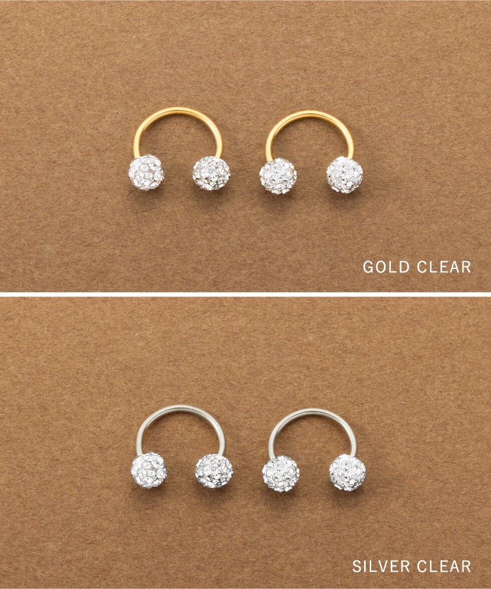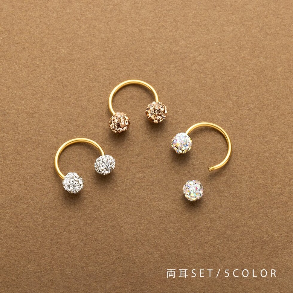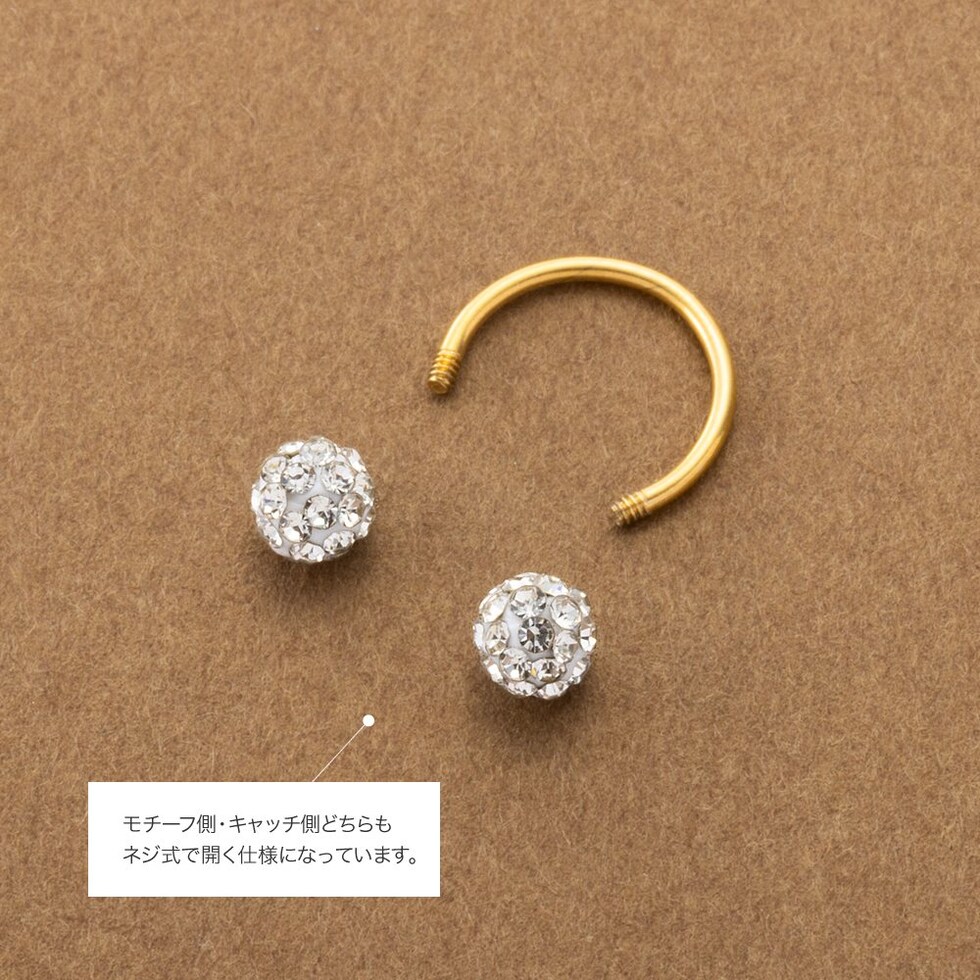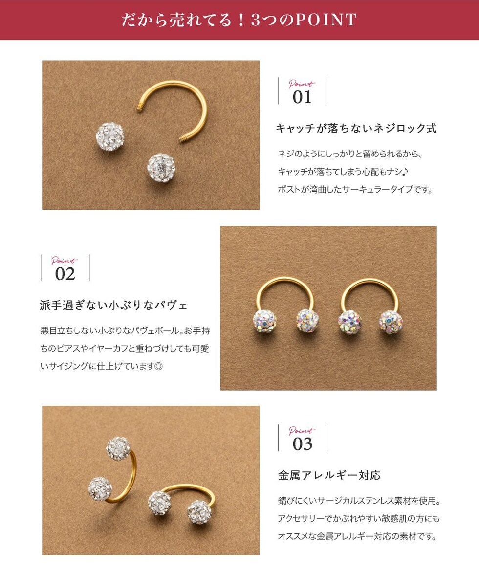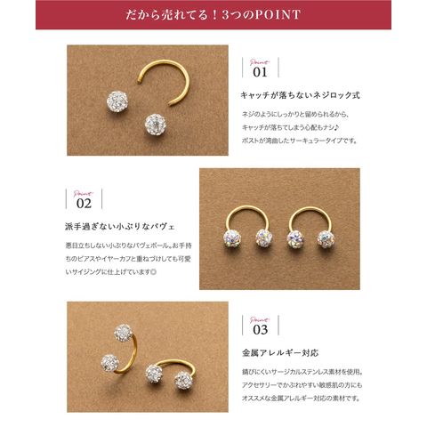 パヴェボールが品良く煌めくネジロック式ピアス。ポストが湾曲したサーキュラー型で、縦向きにして耳裏から覗かせたり横向きに着用したりとお洒落の幅が広がるアイテムです。前後を気にせず使えるデザインと低アレルギー素材のステンレス製で長時間の着用にもオススメ。