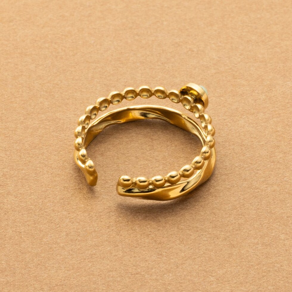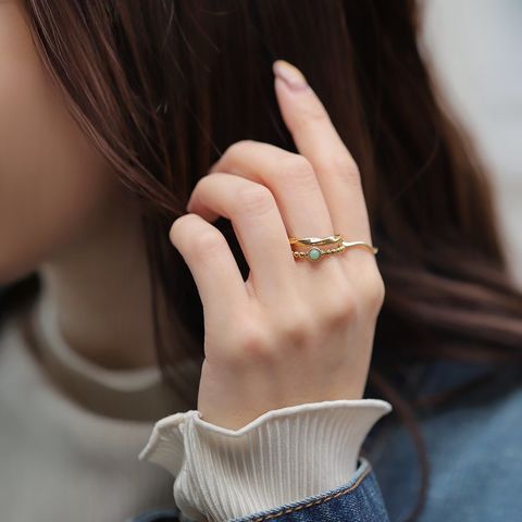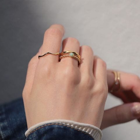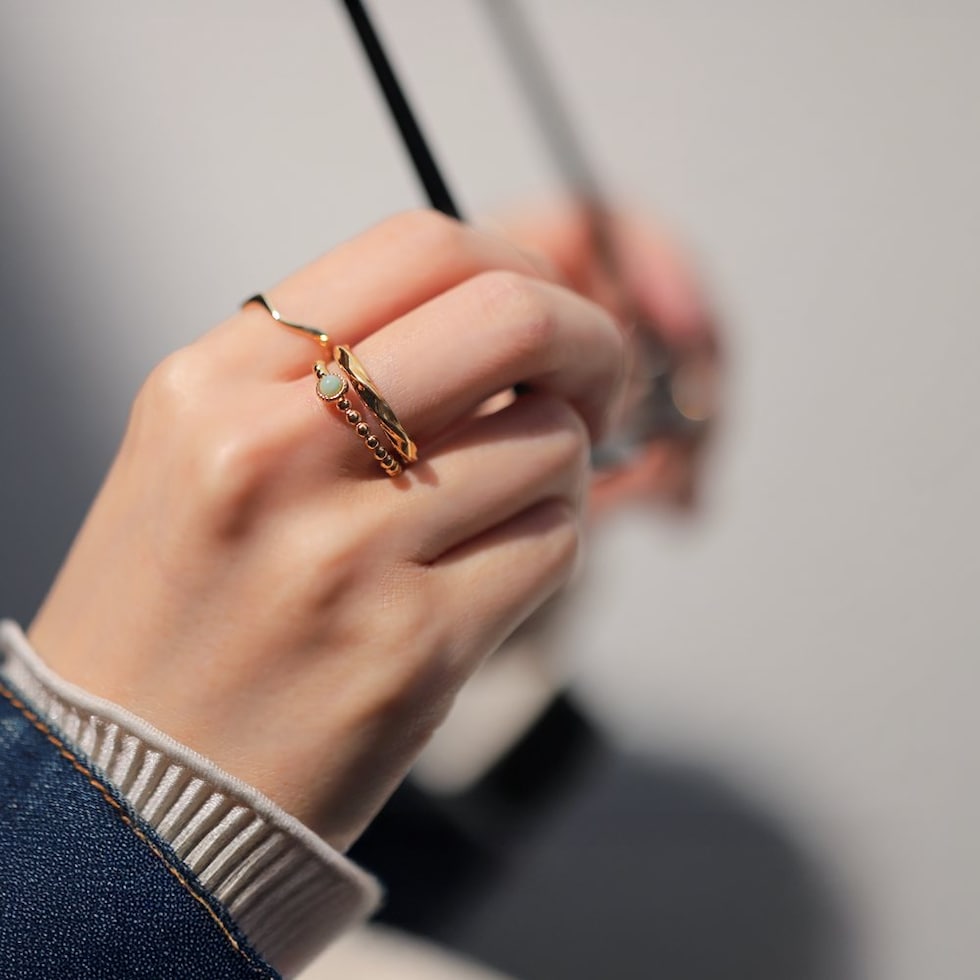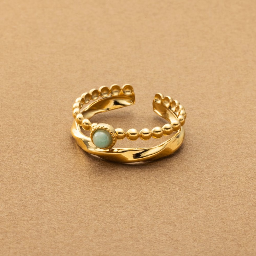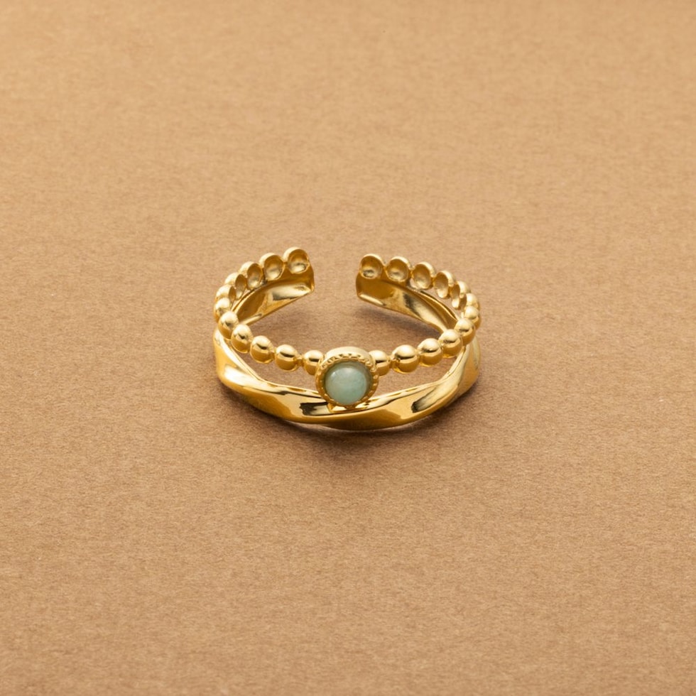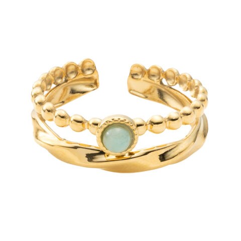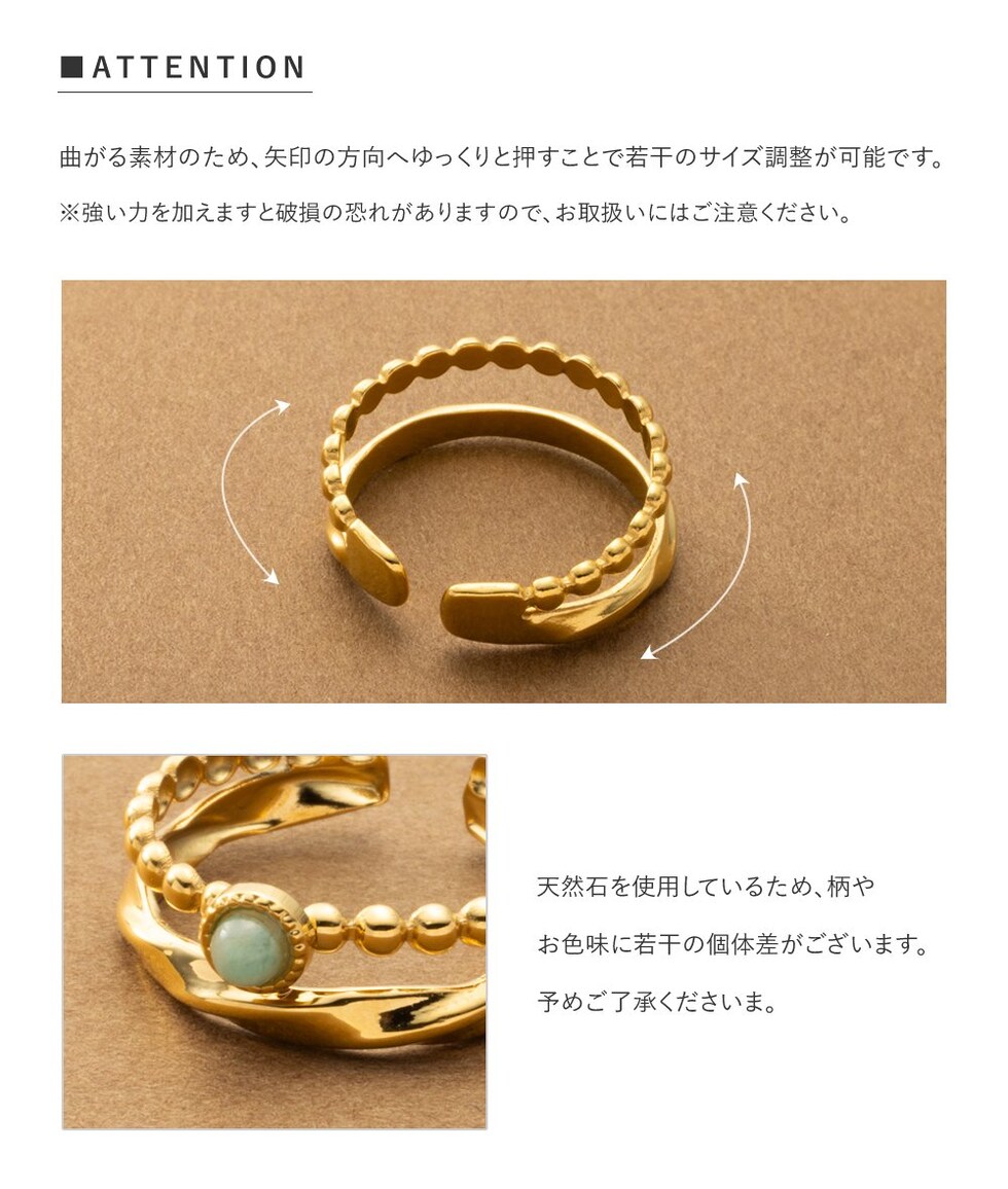 涼しげな色合いのアマゾナイトを飾った重ねづけ風オープンリング。メタルボールとツイストの2連デザインで、一点投入でこなれた手元に。日々のコーデのプラスワンアイテムとして、ワードローブに加えておきたいアイテム◎錆びにくく傷に強いステンレス製で、デイリーに活躍してくれます。長時間の着用も安心の低アレルギー素材です。