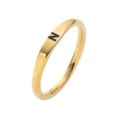 アルファベットが刻印されたシンプルなリング。細身のシェイプラインにイニシャルが映える、控えめながらも洗練されたデザイン。錆びにくく傷に強いステンレス製で、毎日使える大人のデイリーアクセにぴったりな一品です。