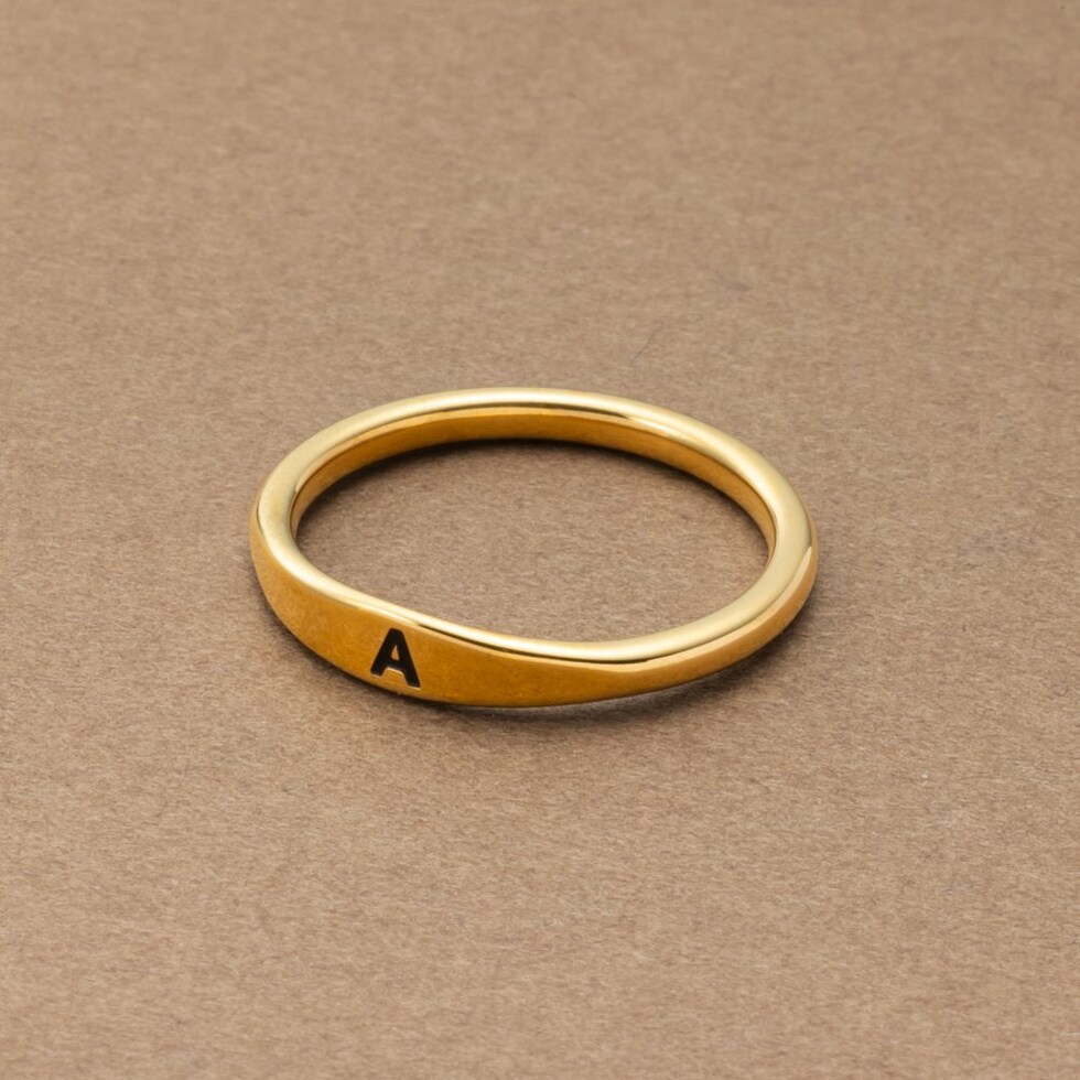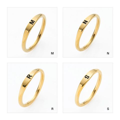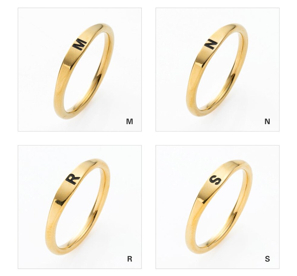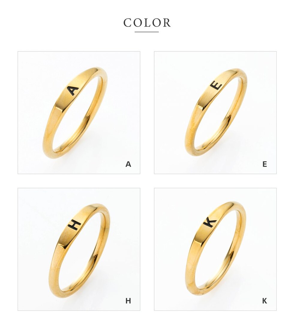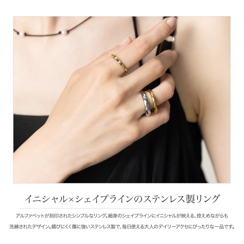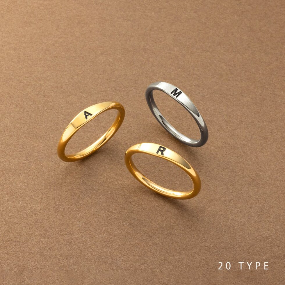 アルファベットが刻印されたシンプルなリング。細身のシェイプラインにイニシャルが映える、控えめながらも洗練されたデザイン。錆びにくく傷に強いステンレス製で、毎日使える大人のデイリーアクセにぴったりな一品です。