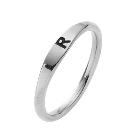 アルファベットが刻印されたシンプルなリング。細身のシェイプラインにイニシャルが映える、控えめながらも洗練されたデザイン。錆びにくく傷に強いステンレス製で、毎日使える大人のデイリーアクセにぴったりな一品です。