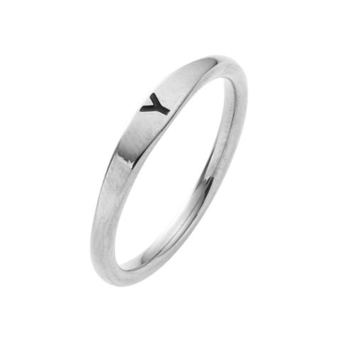 アルファベットが刻印されたシンプルなリング。細身のシェイプラインにイニシャルが映える、控えめながらも洗練されたデザイン。錆びにくく傷に強いステンレス製で、毎日使える大人のデイリーアクセにぴったりな一品です。