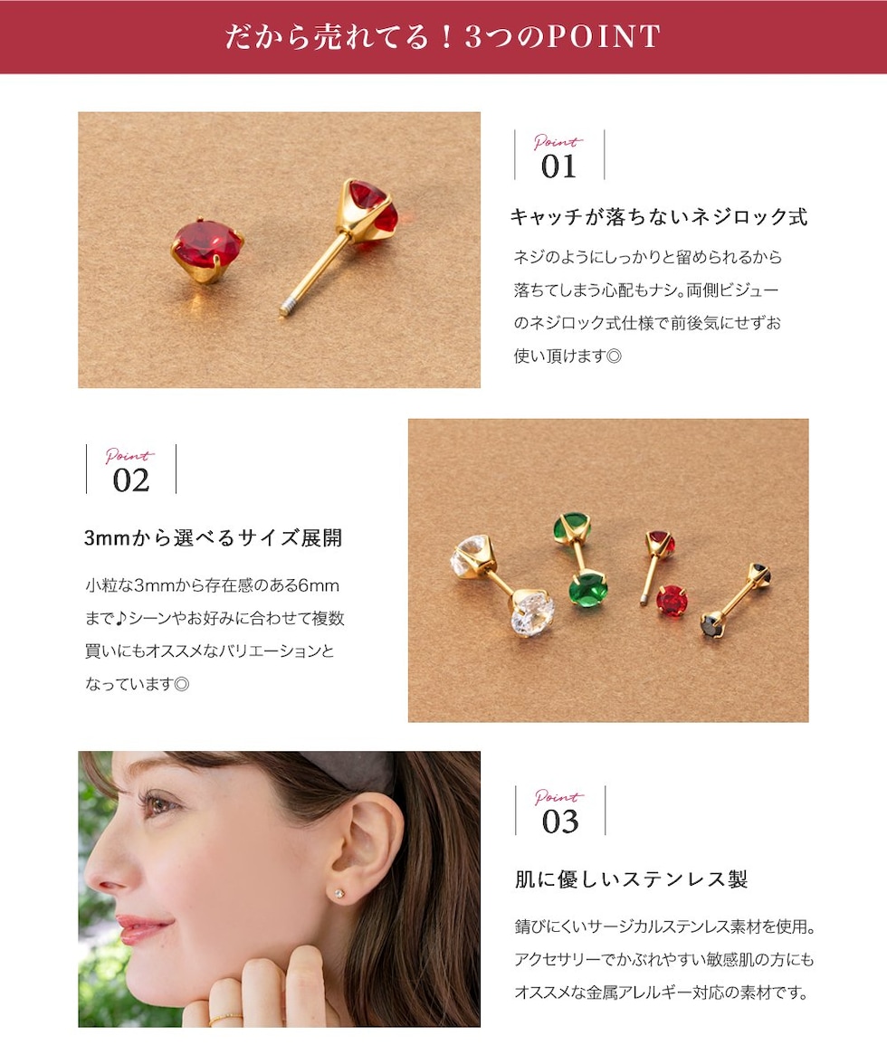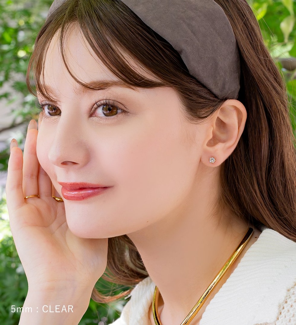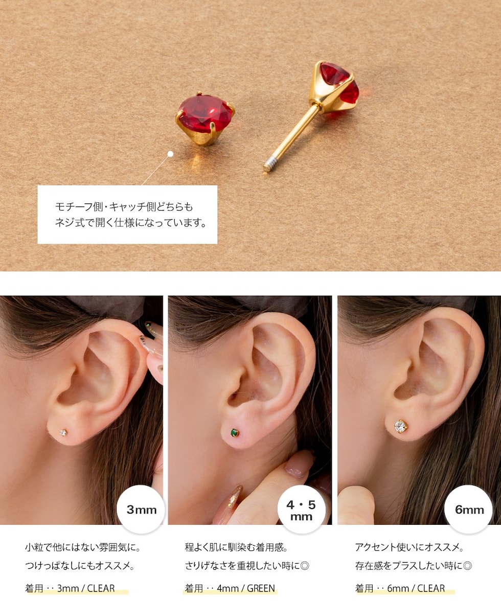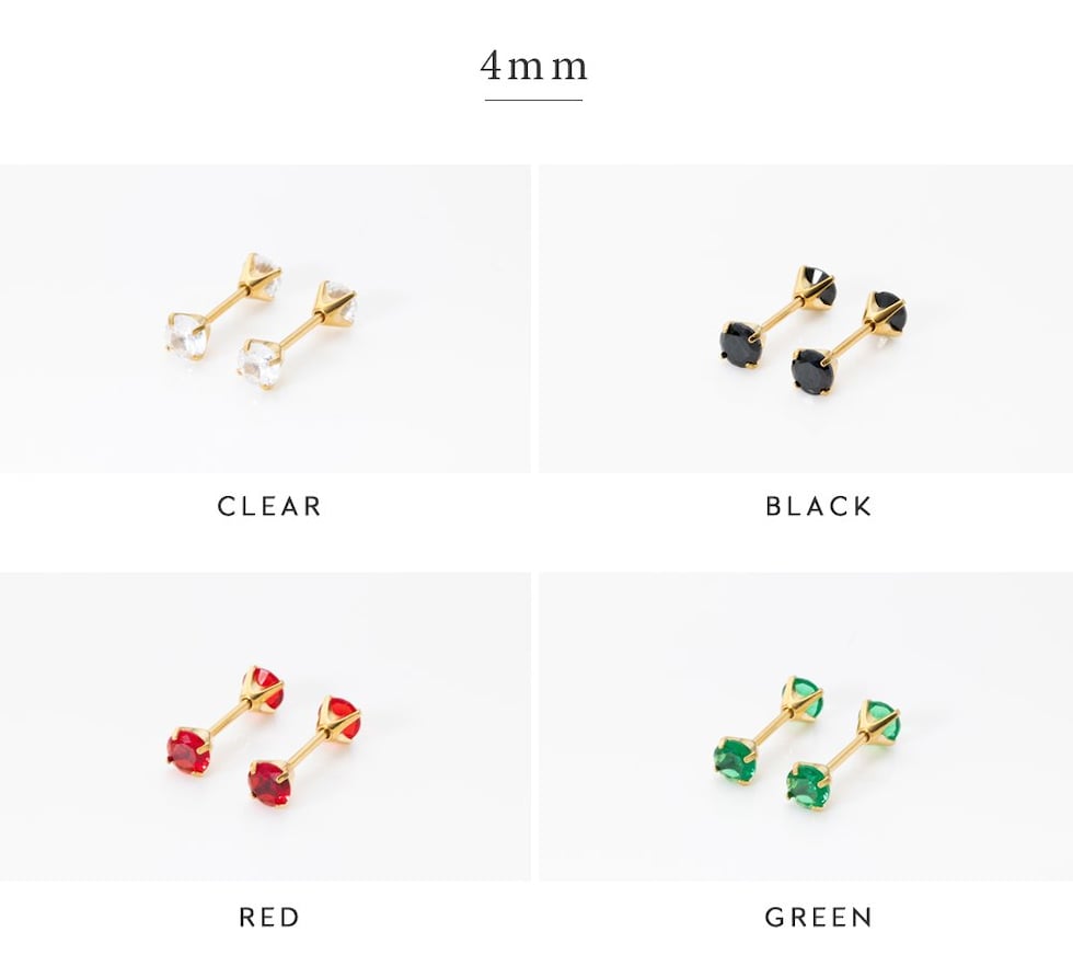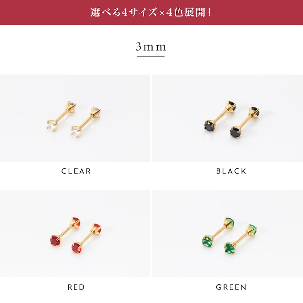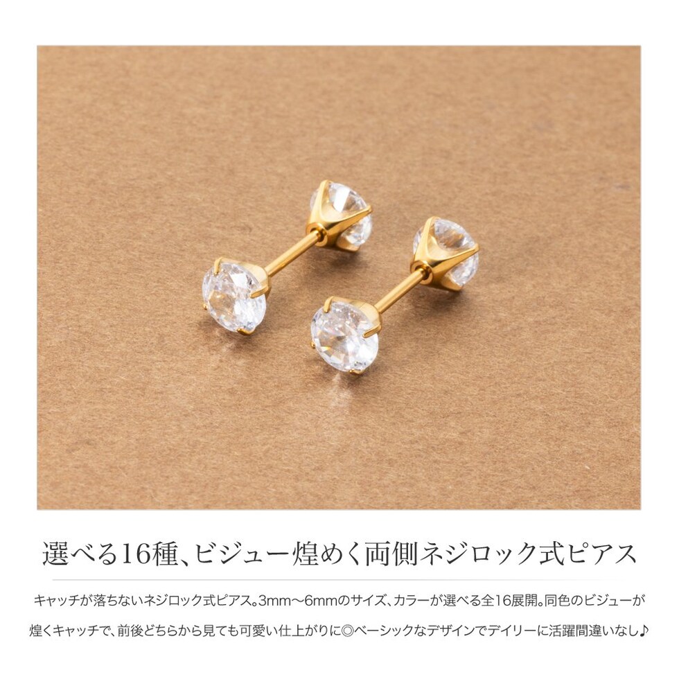 キャッチが落ちないネジロック式ピアス。3mm~6mmのサイズ、カラーが選べる全16展開。同色のビジューが煌くキャッチで、前後どちらから見ても可愛い仕上がりに◎ベーシックなデザインでデイリーに活躍間違いなし♪