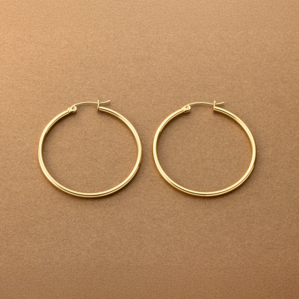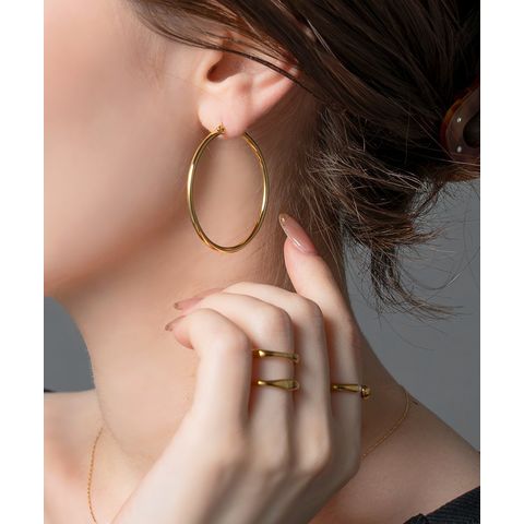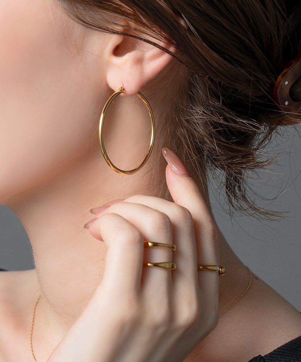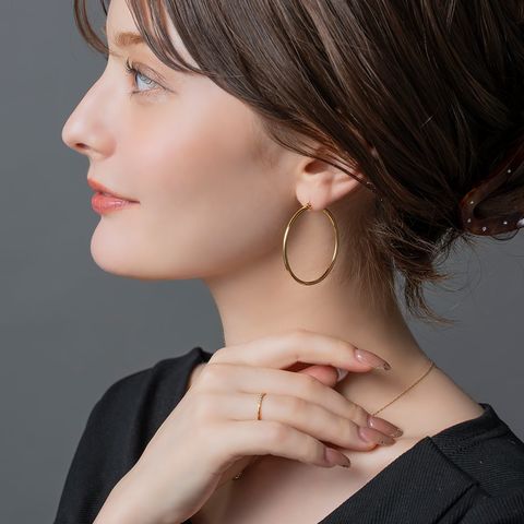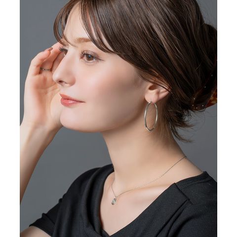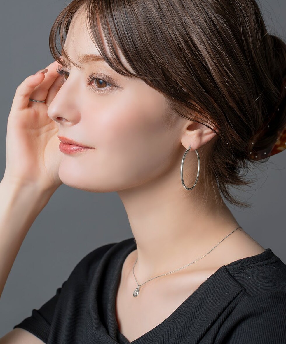 視線を集める大ぶりキャッチレスフープピアス。ありそうでないサイジングと、主張しすぎない2mm幅で大人っぽく身につけられます。シンプルなトップスに合わせるだけでぐっとこなれて見えるアイテム。見た目より軽量で長時間つけていても気にならないのが◎