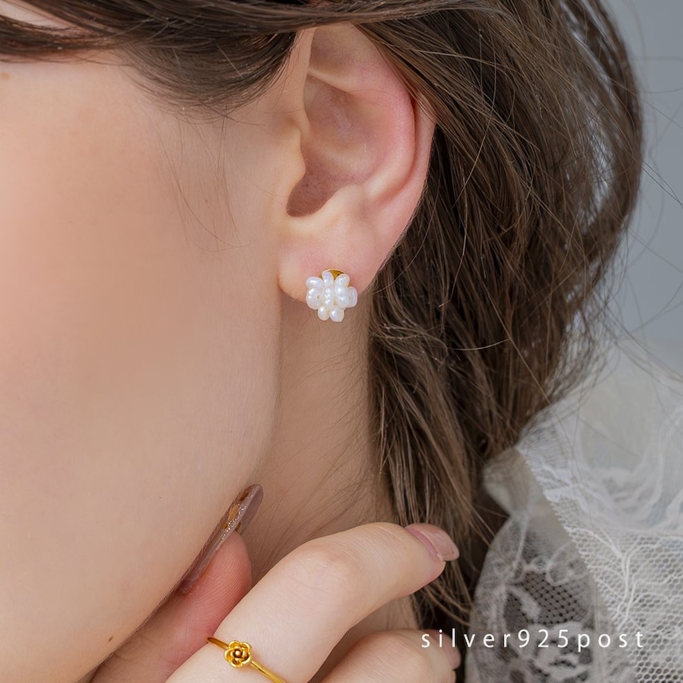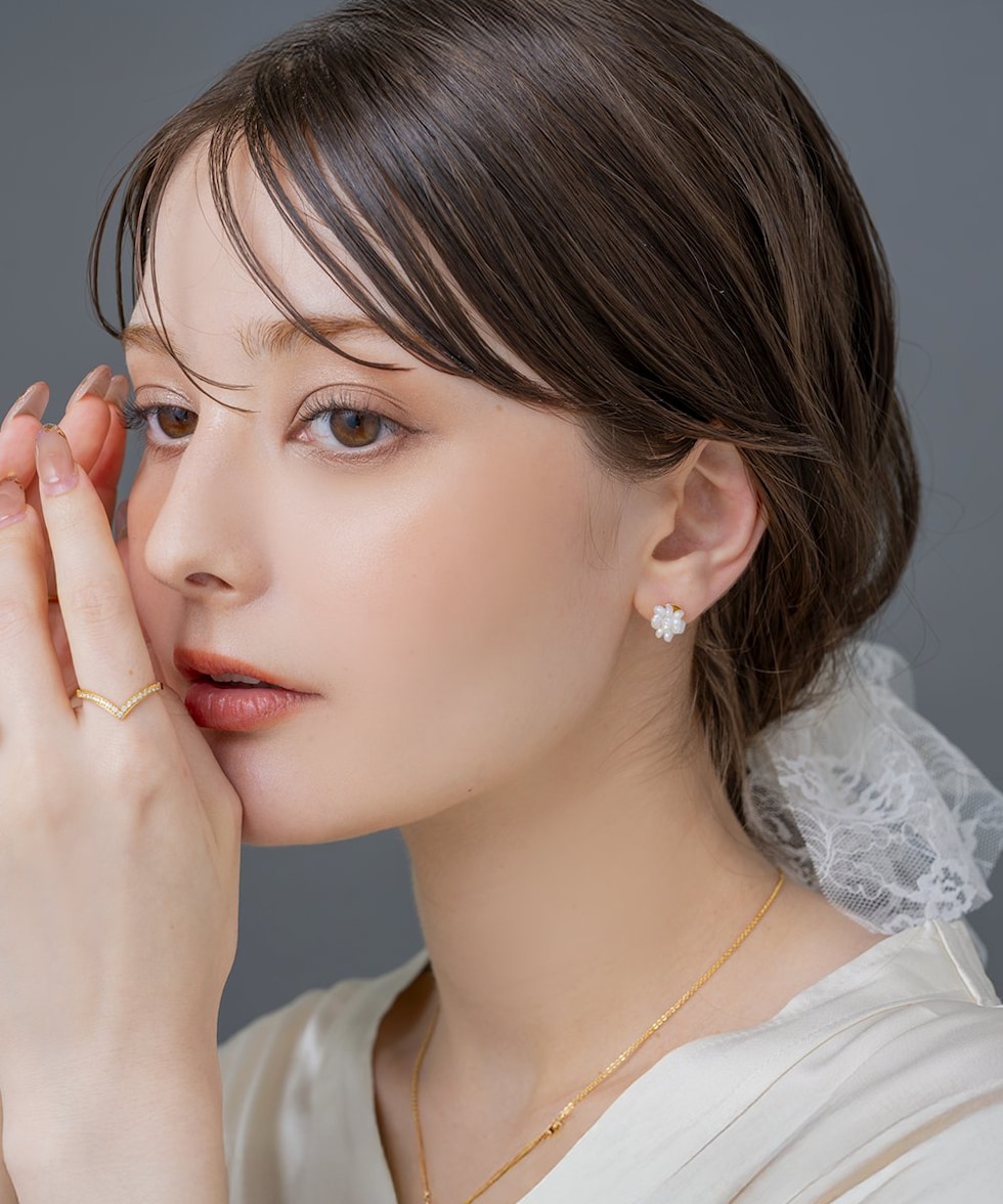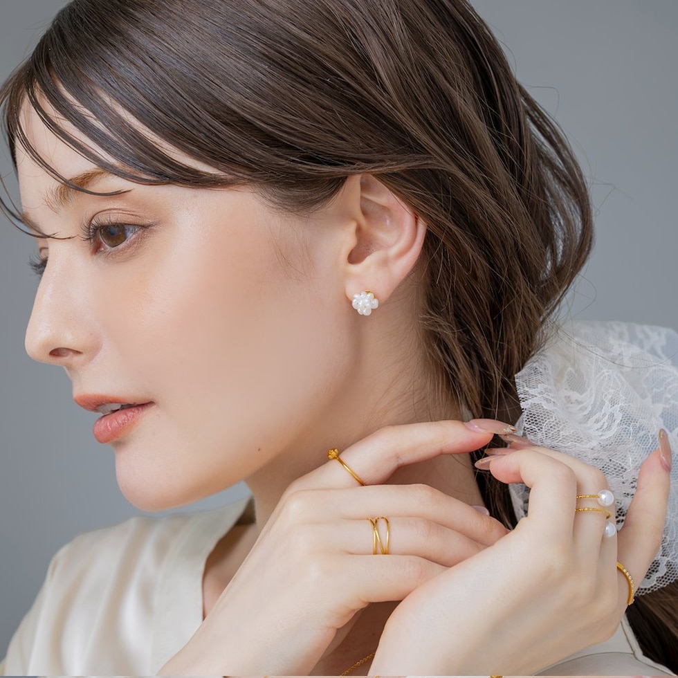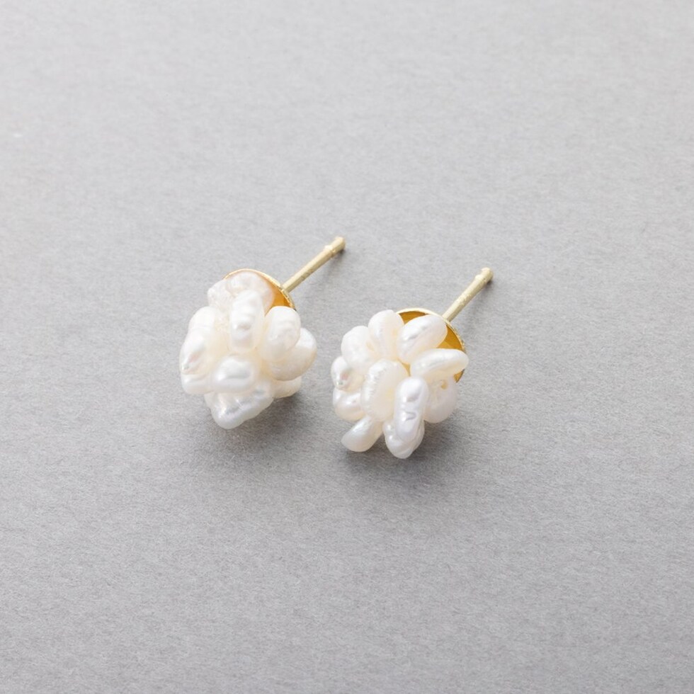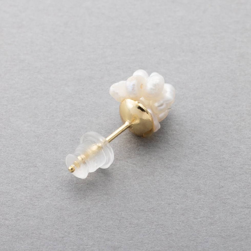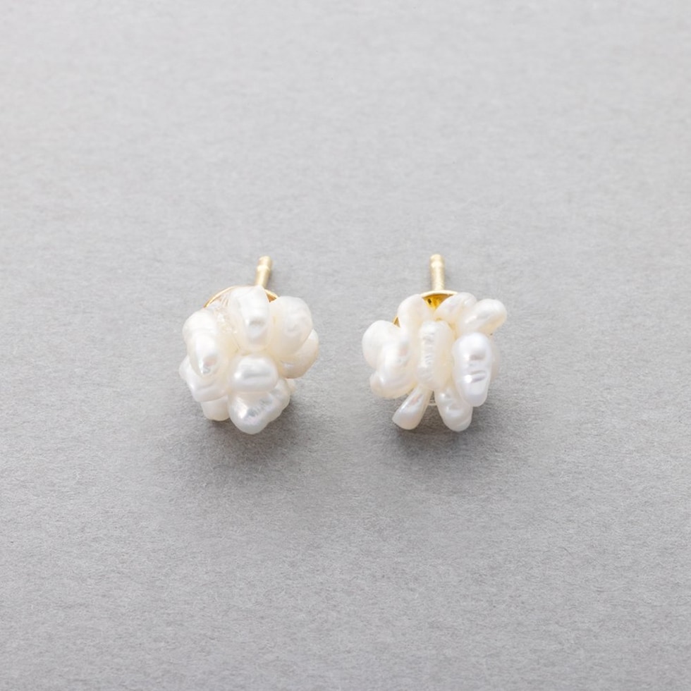 小粒な淡水パールをランダムに配置したピアス。ニュアンス感たっぷりな雰囲気が、大人コーデに似合うひと品。さりげなくも品良く魅せるオススメのデザイン。