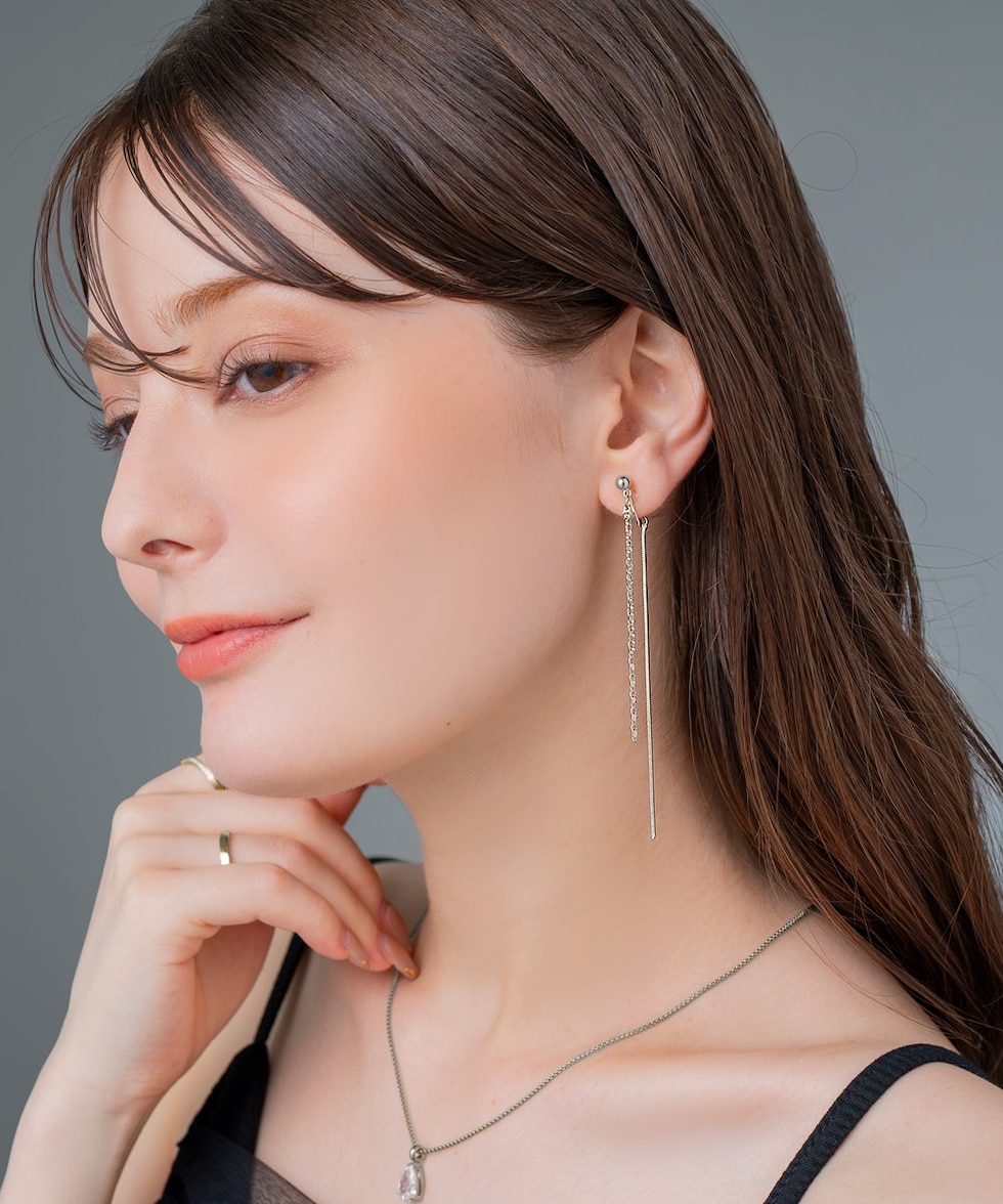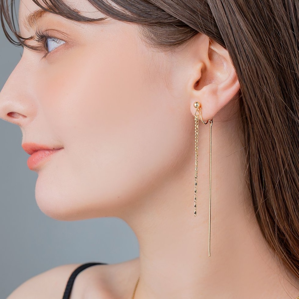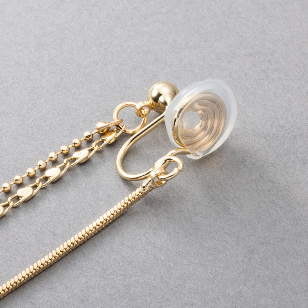 3種の華奢なチェーンを組み合わせたワイヤーフィットイヤリング。繊細なデザインと縦長のシルエットで揺れるたびに華やぎをプラスするひと品。ピアスのようにすっきり見えるオススメのアイテムです。