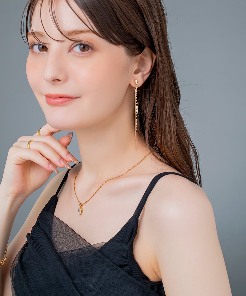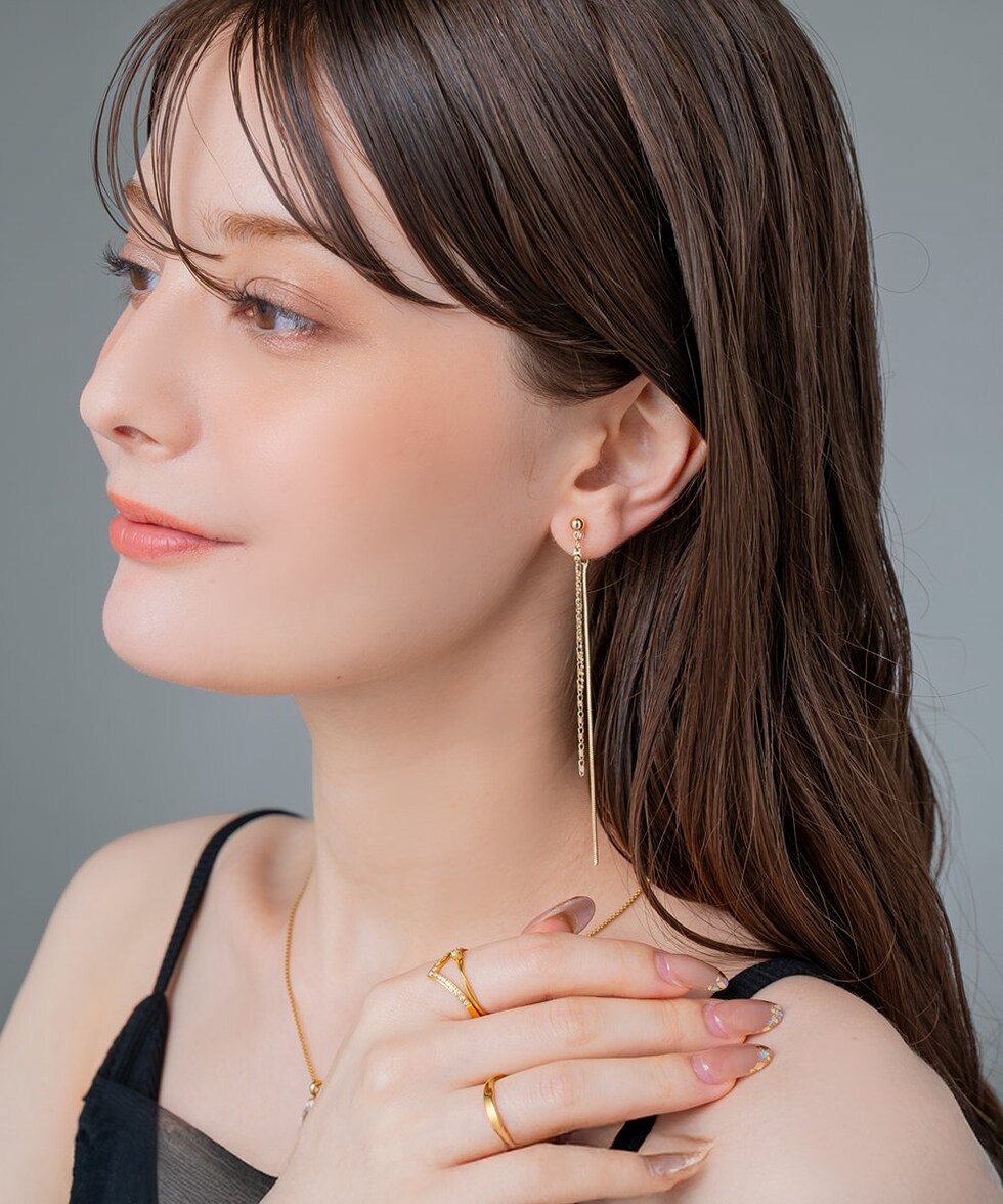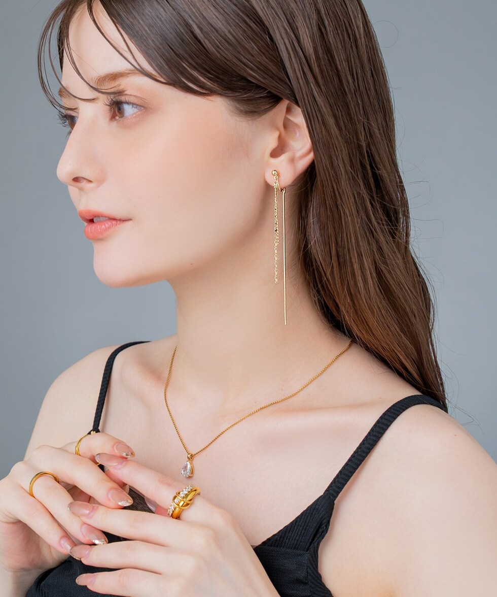 3種の華奢なチェーンを組み合わせたワイヤーフィットイヤリング。繊細なデザインと縦長のシルエットで揺れるたびに華やぎをプラスするひと品。ピアスのようにすっきり見えるオススメのアイテムです。